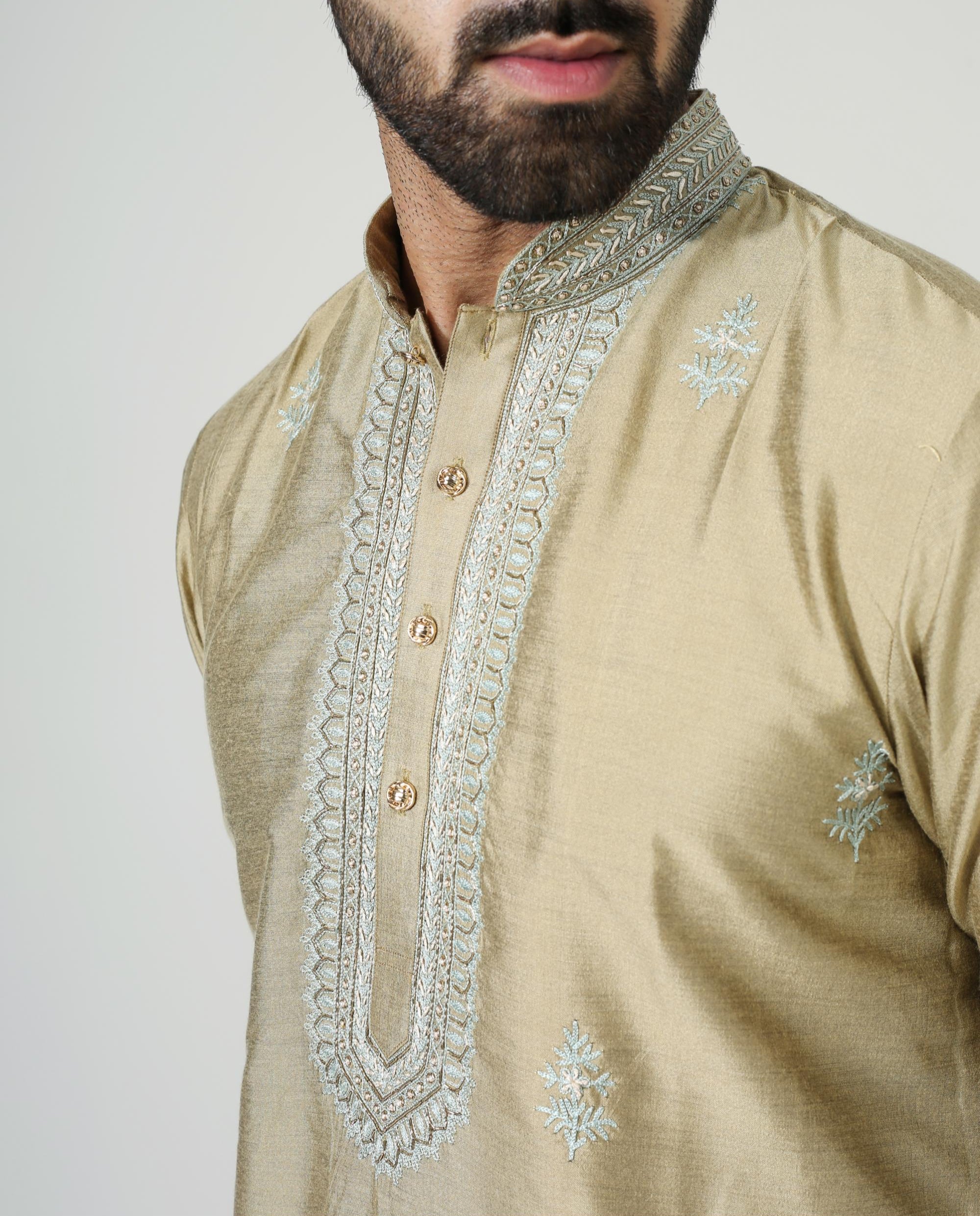 Radiating regal charm, the Gold Kurta with Aari Embroidery is a timeless piece that showcases intricate craftsmanship and traditional elegance. The subtle sheen of the gold fabric is elevated by detailed aari embroidery, adding texture and richness without overpowering the silhouette. Ideal for weddings, receptions, or grand festive occasions, this kurta pairs effortlessly with churidars or pyjamas for a refined, statement-making ensemble. Designed for the modern man who appreciates heritage artistry with a contemporary edge.