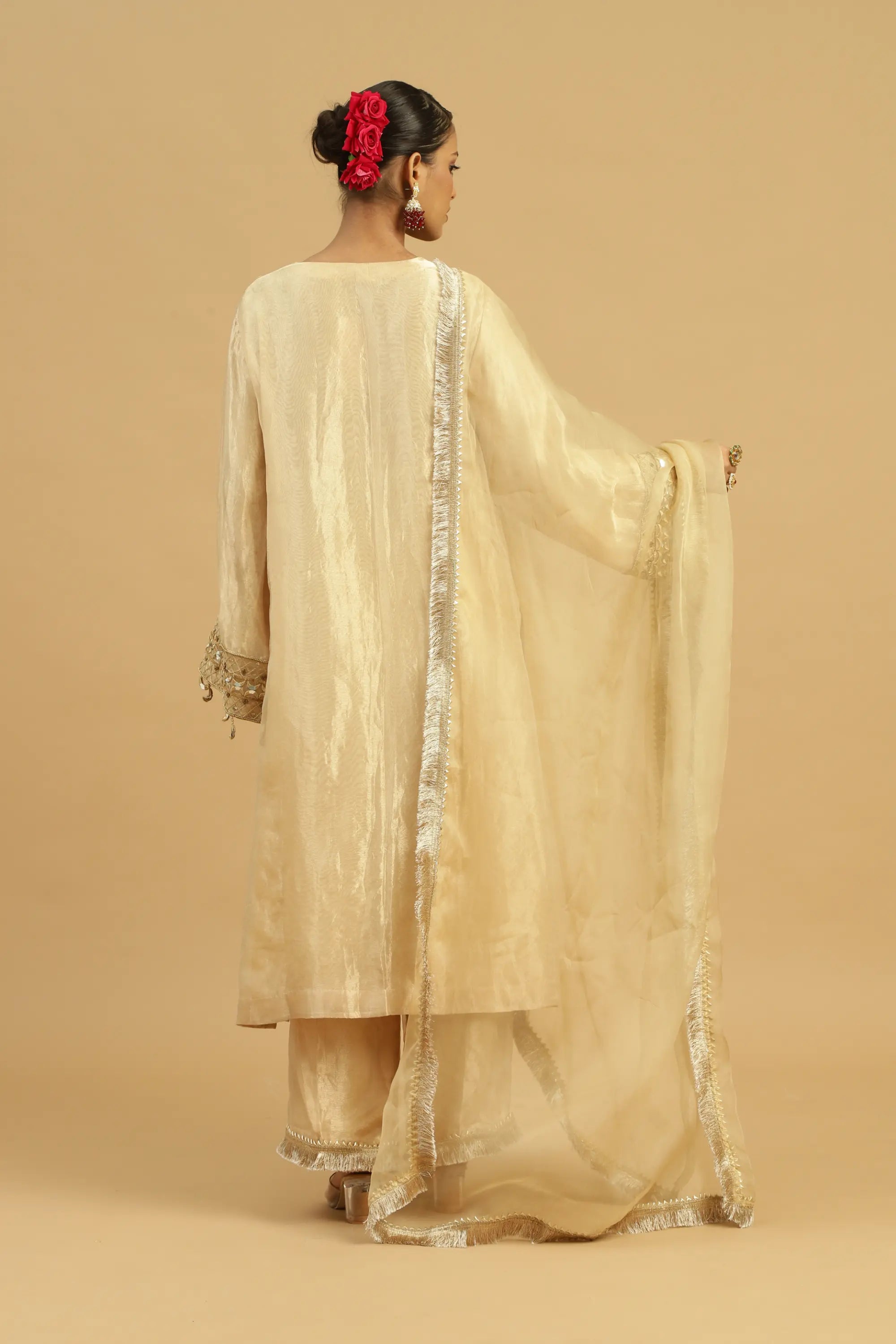 This stunning gold kurta is a luxurious addition to any wardrobe, offering a perfect blend of traditional craftsmanship and contemporary design. The rich, metallic gold fabric catches the light beautifully, adding a regal touch to the ensemble. Paired with matching straight pants for a sleek, modern silhouette, and a delicate dupatta to complete the look, this outfit is ideal for weddings, receptions, or festive celebrations. The kurta’s intricate design and the dupatta's graceful draping make this piece an elegant choice for those looking to stand out in style. Elevate your special occasions with this timeless yet contemporary ensemble.