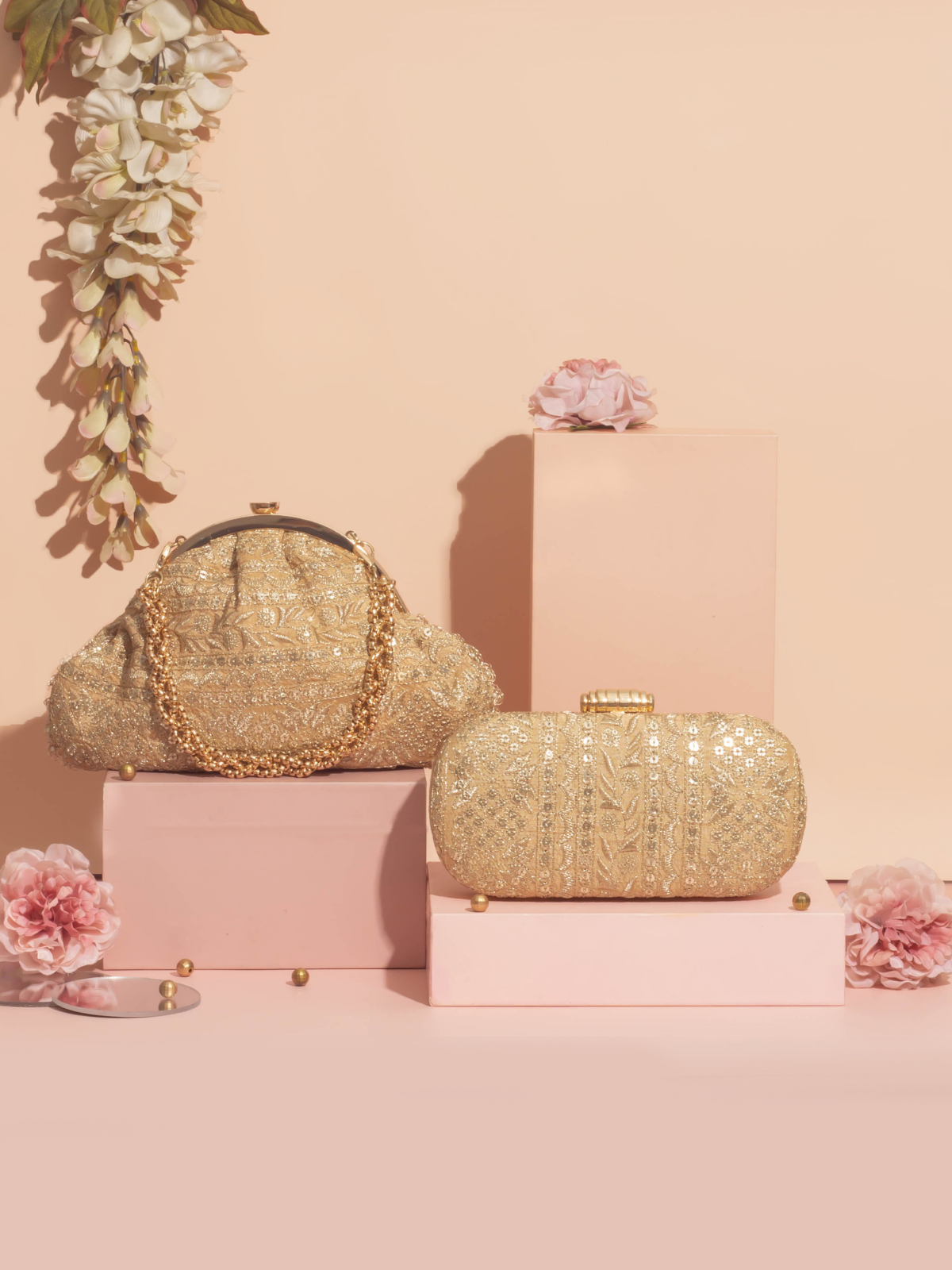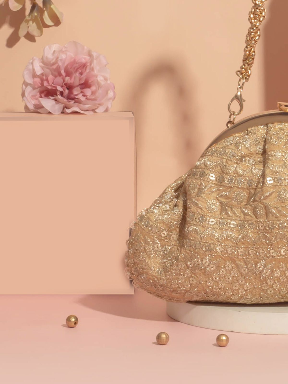 Complete your wedding ensemble with our Mirai Embroidered Vintage Purse, a masterpiece of timeless elegance. Designed to capture the essence of Indian festivity, this purse features luxurious gold embroidery that dazzles with every glance. The graceful gold tassels and intricate scallop lace detailing enhance its grandeur, making it the perfect bridal accessory. Whether you're the bride-to-be or attending a special occasion, this purse ensures you shine as the center of attention.