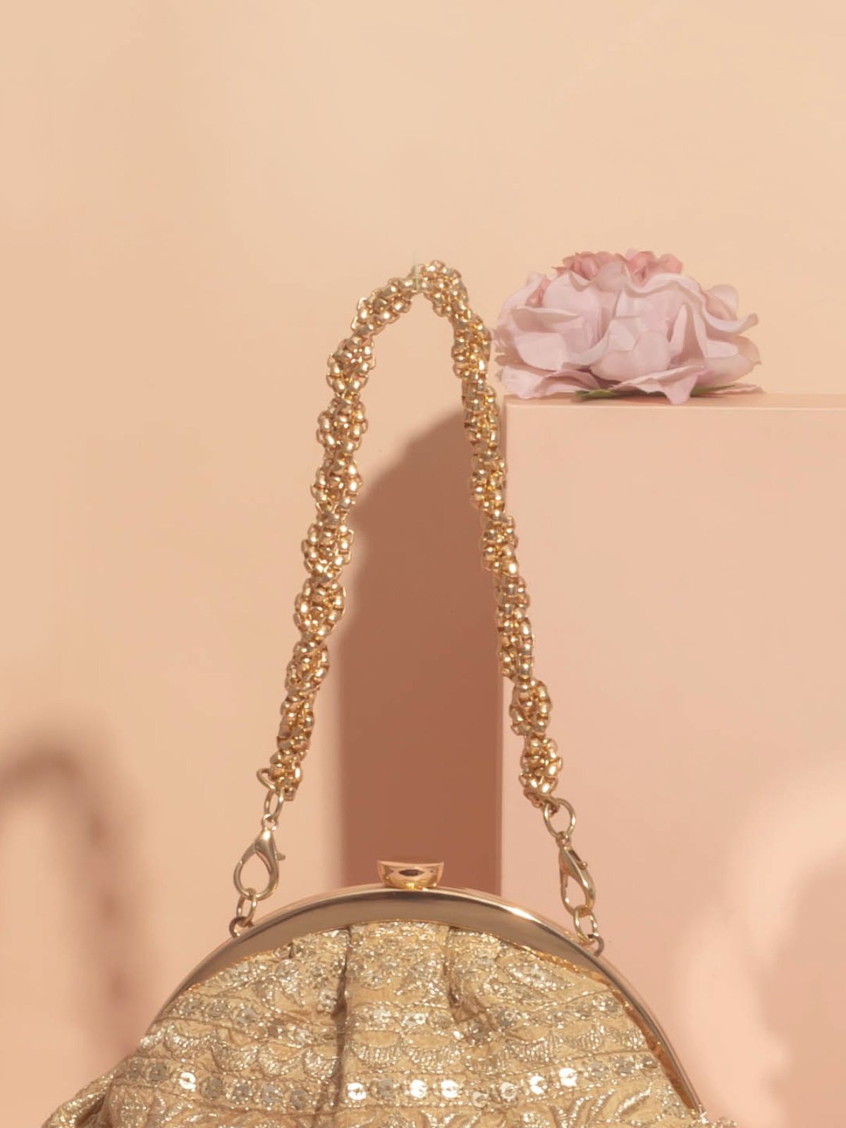 Fabric: Embroidered poly silk, poly satin lining, golden metal clasp frame, braided golden metal chain
