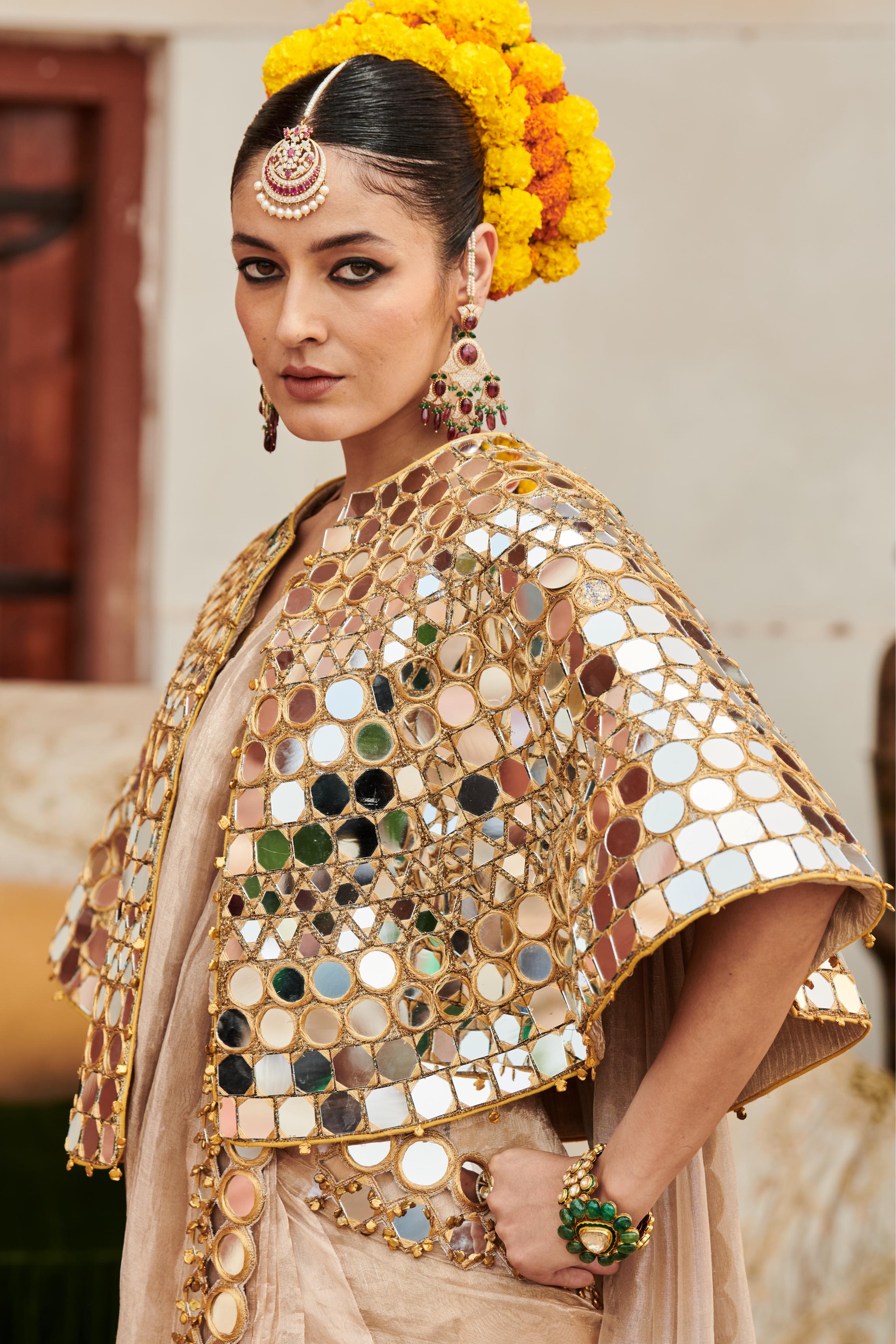 This beige saree features a stunning mirror work border, exuding timeless elegance. Styled with a full mirror work bolero cape crafted on gota and lined with luxurious chanderi silk, this ensemble perfectly blends traditional charm with contemporary sophistication, making it ideal for weddings and festive celebrations.