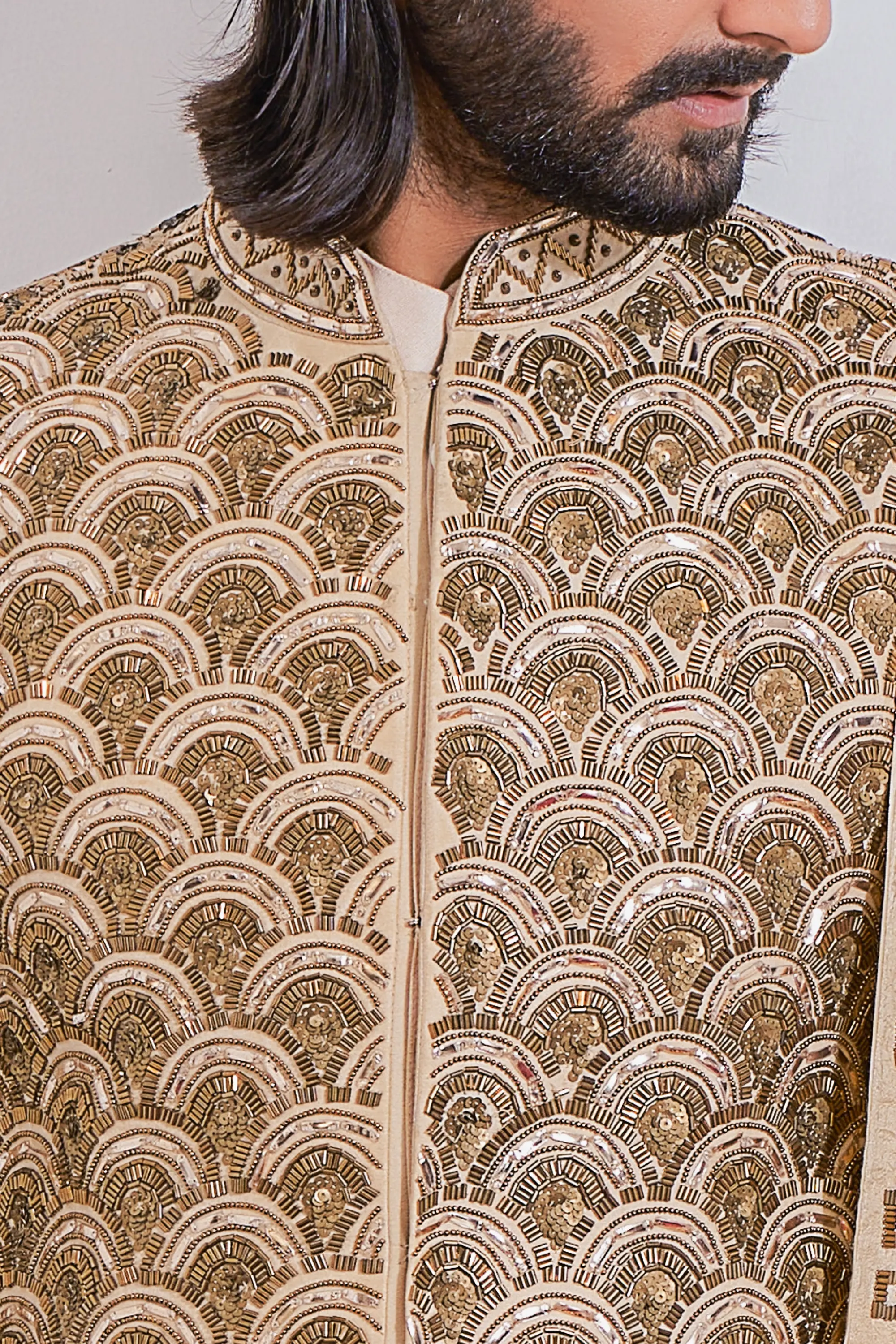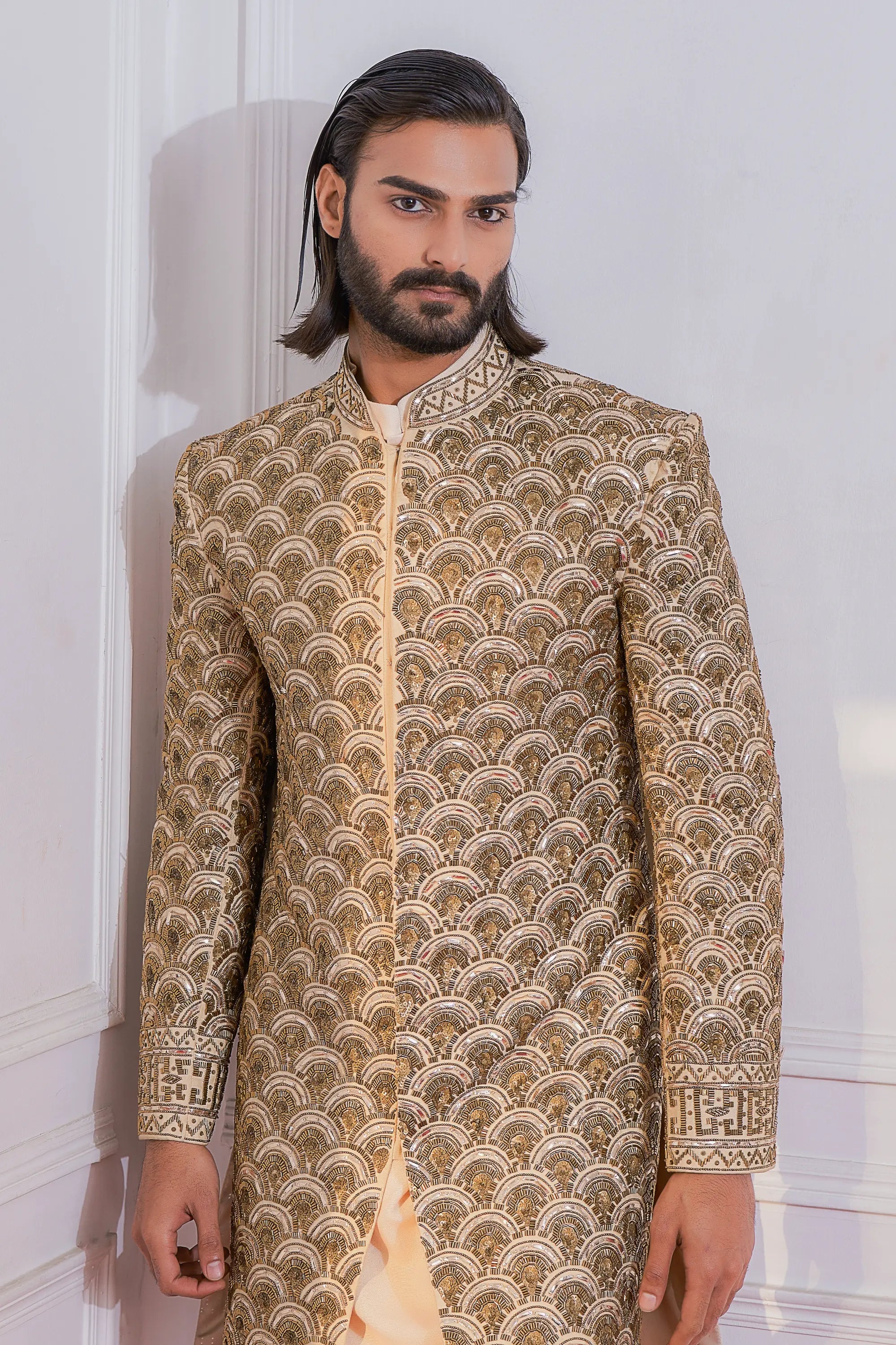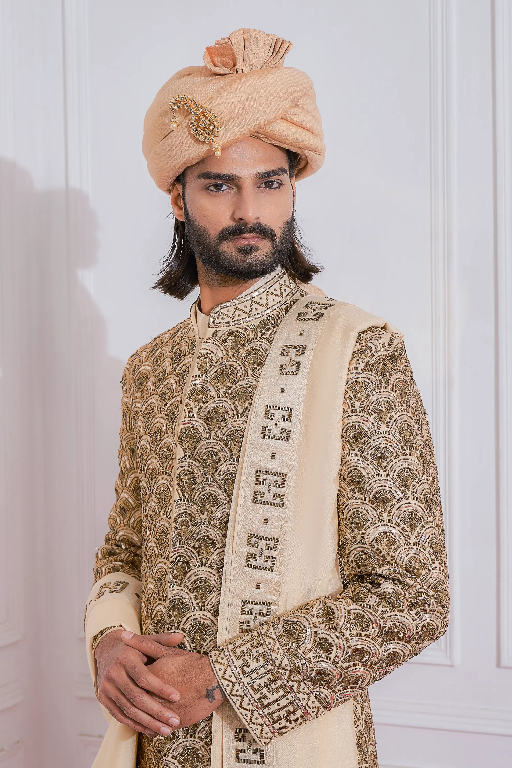 Components: 5 pieces (Sherwani, Kurta, Churidar, Embroidered stole, and Safaa fabric)