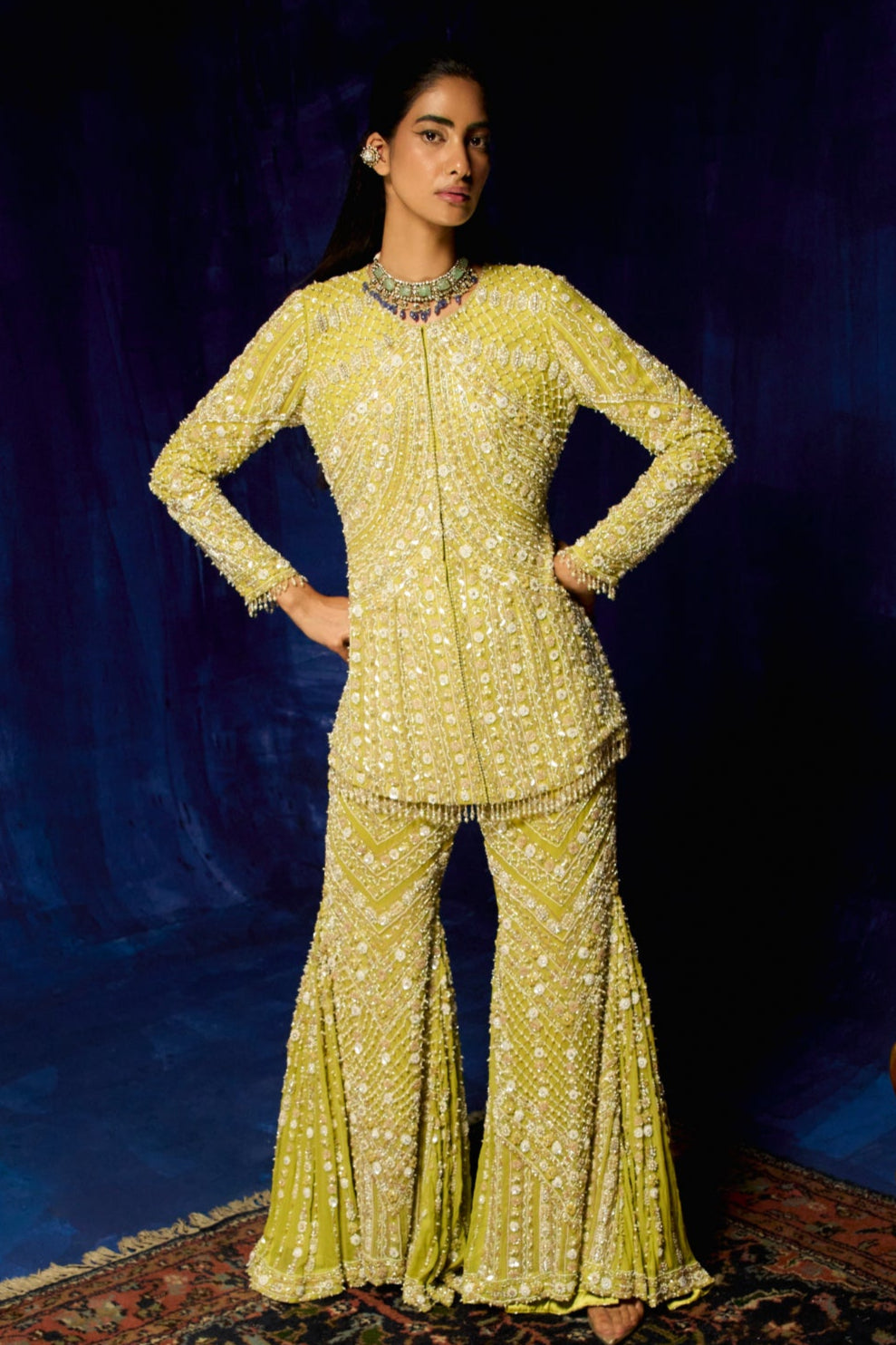 Elevate your festive wardrobe with this olive-yellow green embroidered kurta, paired with a heavily embellished gharara for a regal touch. The set is completed with a net dupatta featuring an intricate embroidered border, exuding elegance and charm. Perfect for weddings and special occasions, this ensemble blends tradition with modern sophistication.