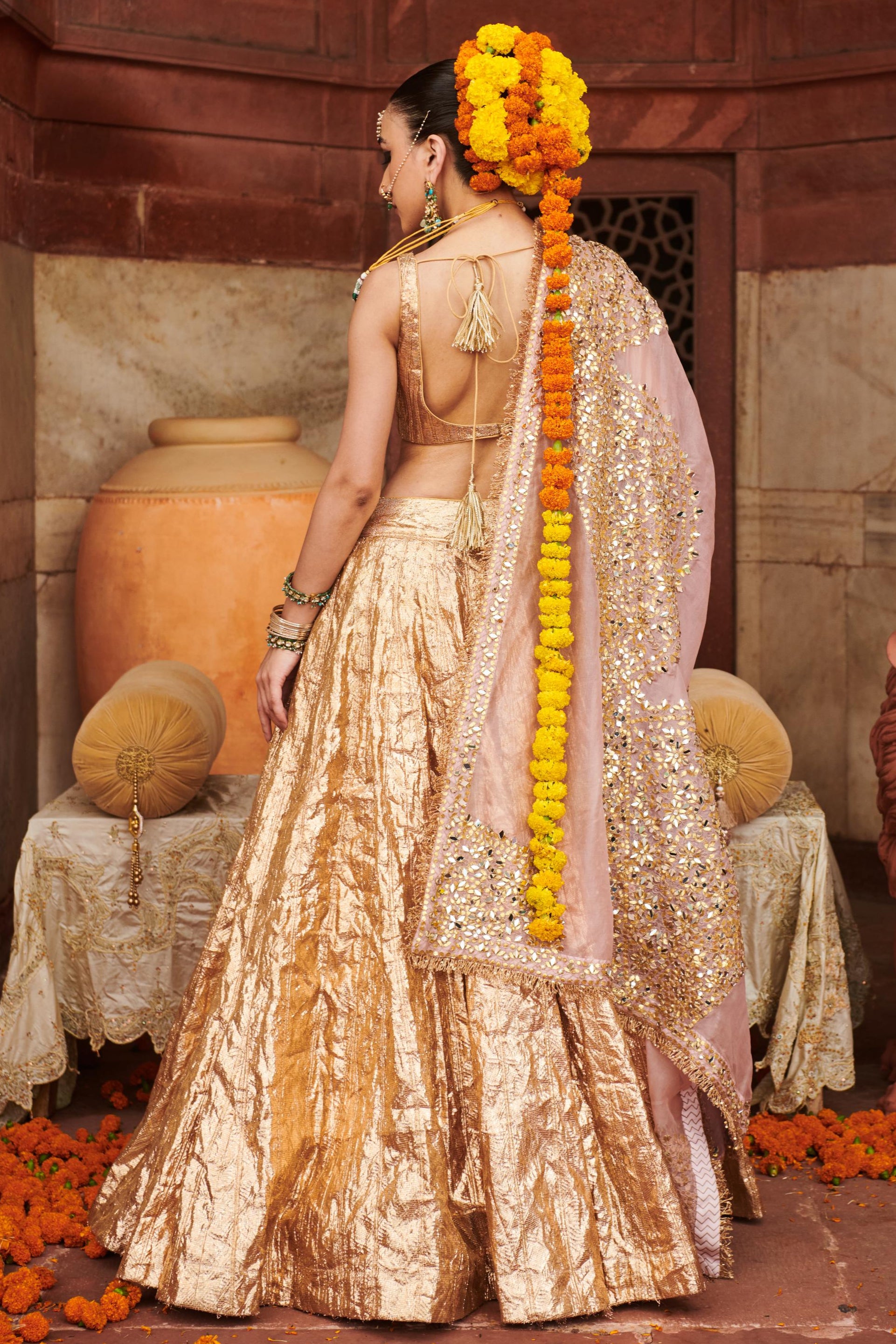 This full rose gold lampi lehenga exudes elegance with its shimmering finish and refined design. Paired with a chic sleeveless blouse, it is beautifully complemented by a highlighted pink dupatta, adding a pop of color and charm. Perfect for weddings and festive occasions, this ensemble radiates modern sophistication.