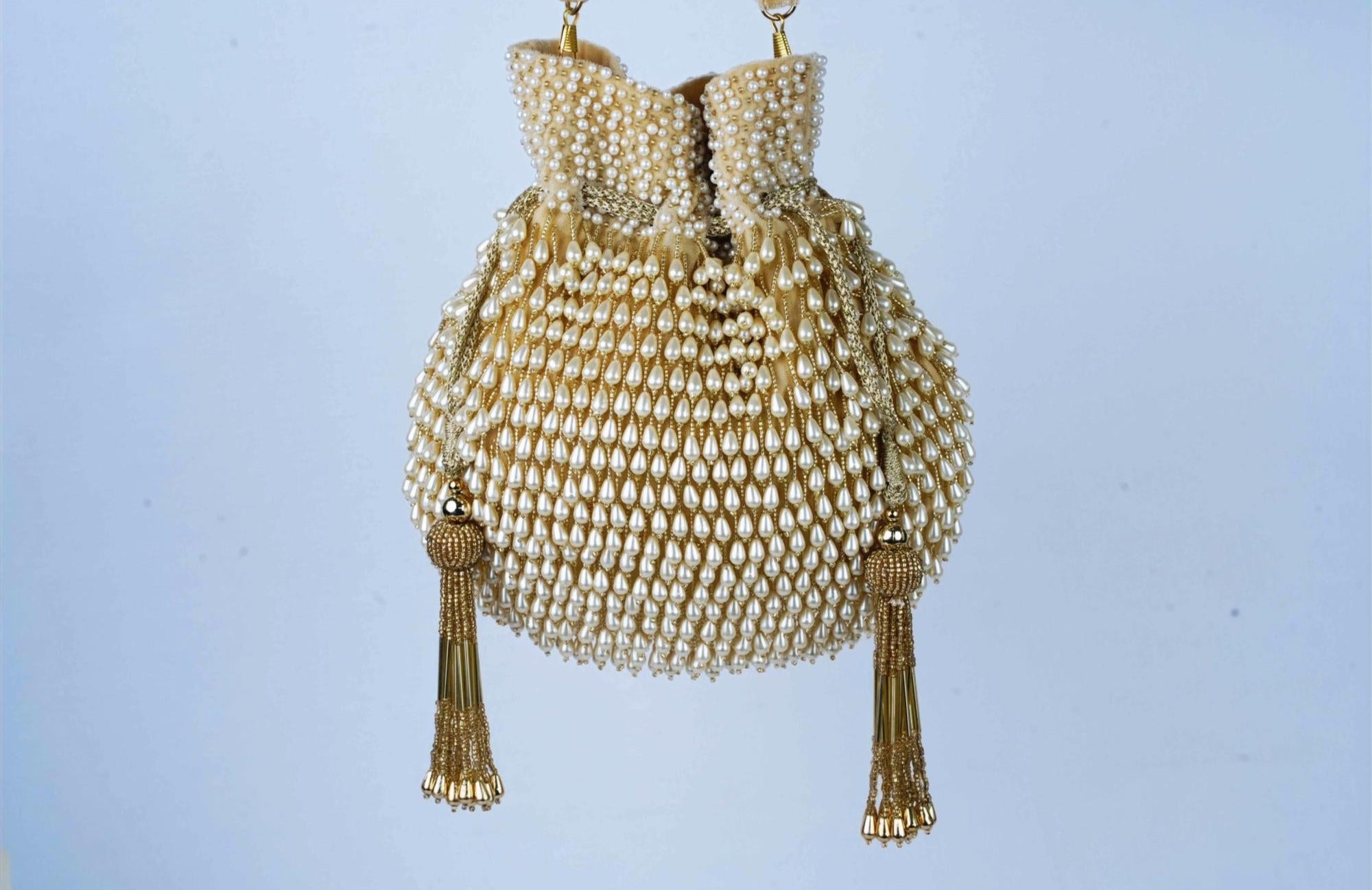 Opulent and enchanting, the Gold Pearl Treasure Bag is a true jewel in your accessory collection. Crafted with a gleaming gold base and adorned with intricate pearl embellishments, this statement piece evokes timeless glamour. Its structured silhouette adds elegance to both traditional and contemporary ensembles, making it perfect for weddings, receptions, and evening celebrations. For the woman who treasures heritage with a hint of sparkle, the Gold Pearl Treasure Bag is a radiant expression of luxury and grace.