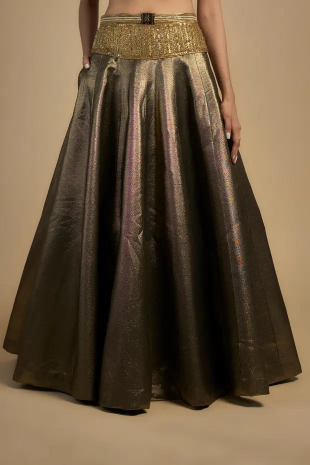 Make a stunning statement with the Gold Sequence and Chain Blouse Lehenga an exquisite fusion of shimmering glamour and intricate traditional design. This captivating ensemble features a luxurious gold blouse adorned with dazzling sequences and delicate chain detailing paired with a complementary lehenga that promises to elevate your look. Ideal for weddings receptions and festive occasions this lehenga set exudes sophistication elegance and bold style.