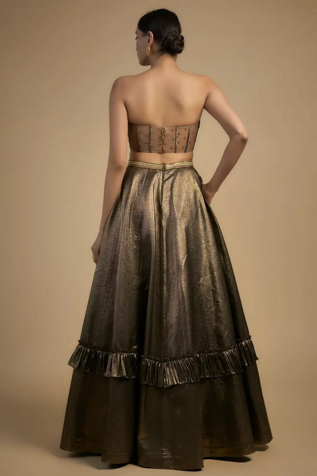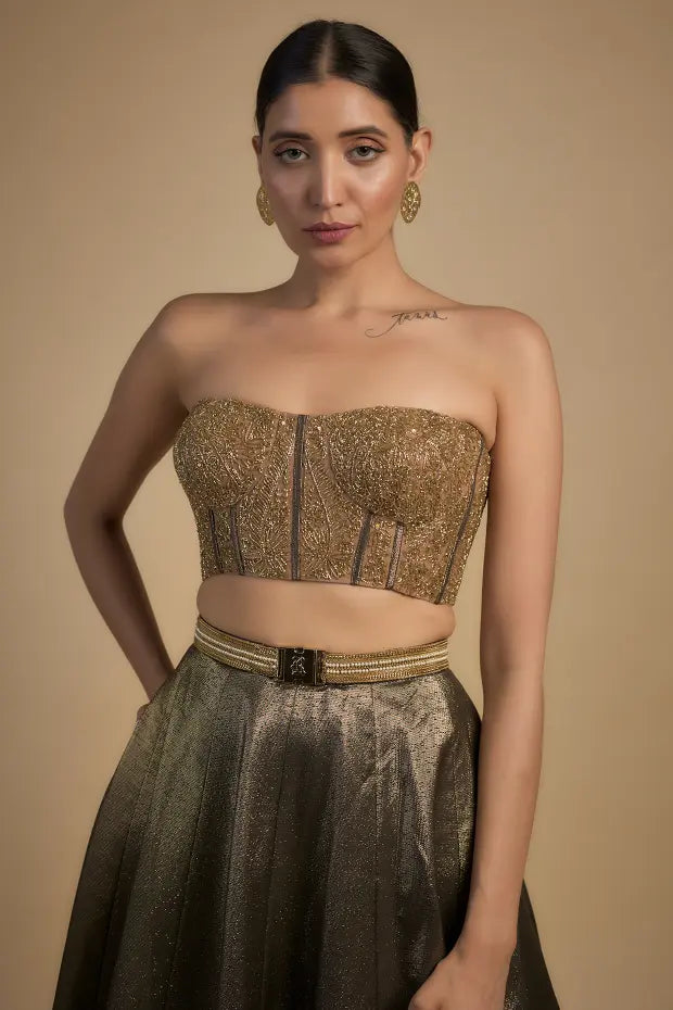 Shine like never before in the Gold Sequin Bustier with Lehenga a luxurious ensemble that blends modern glamour with timeless elegance. The gold bustier is intricately adorned with shimmering sequins offering a dazzling effect that catches the light from every angle. Paired with a flowing lehenga this outfit is the perfect choice for weddings receptions or festive occasions where you want to make a statement.