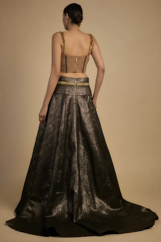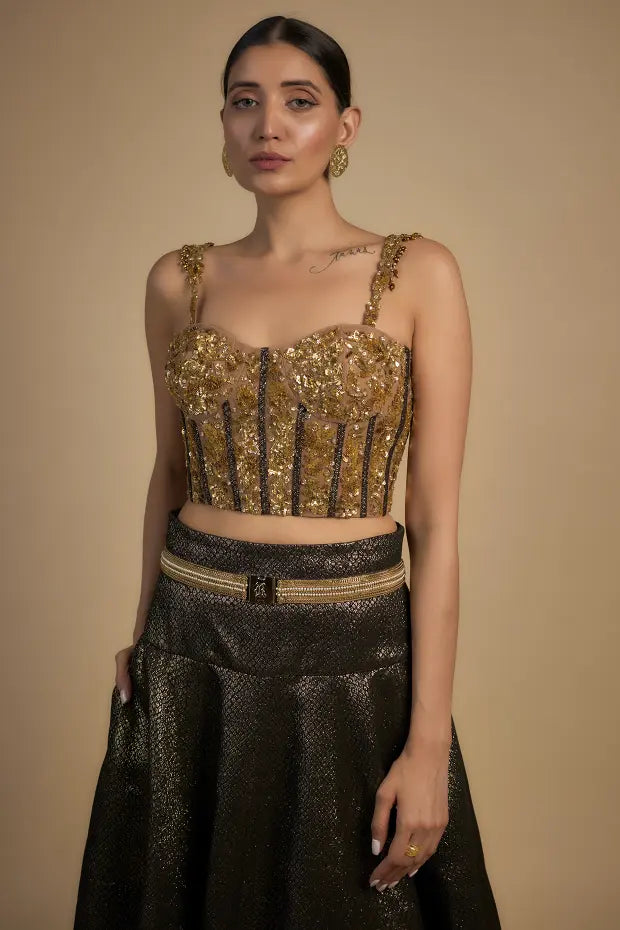 Turn heads in the Gold Sequin Corset with Tassel Sleeves Lehenga a stunning fusion of bold glamour and timeless sophistication. This exquisite ensemble features a gold corset top adorned with intricate sequin work paired with dramatic tassel sleeves that add a playful yet elegant touch. The lehenga designed to complement the corset enhances the overall look with its flattering silhouette and flowing elegance. Perfect for weddings receptions or festive celebrations this outfit is made to make you stand out with grace and style.