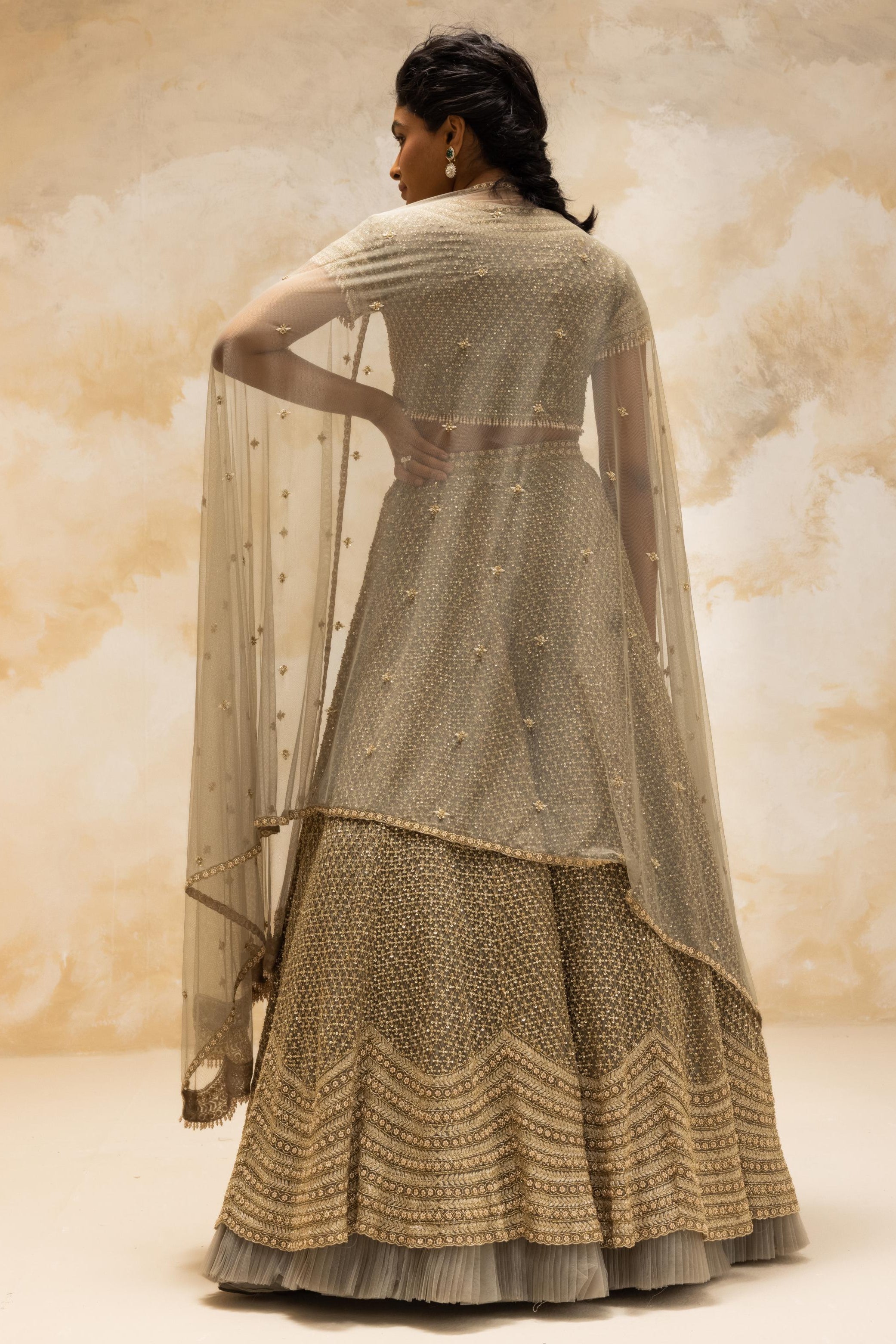 A stunning ensemble featuring golden sequins and intricate bugle beads arranged in a beautiful geometric checkered pattern. The set includes a front-open blouse and a delicate net dupatta, creating a look thatÕs both modern and timeless. Perfect for weddings and festive occasions, this outfit exudes sophistication and glamour, making you shine effortlessly.