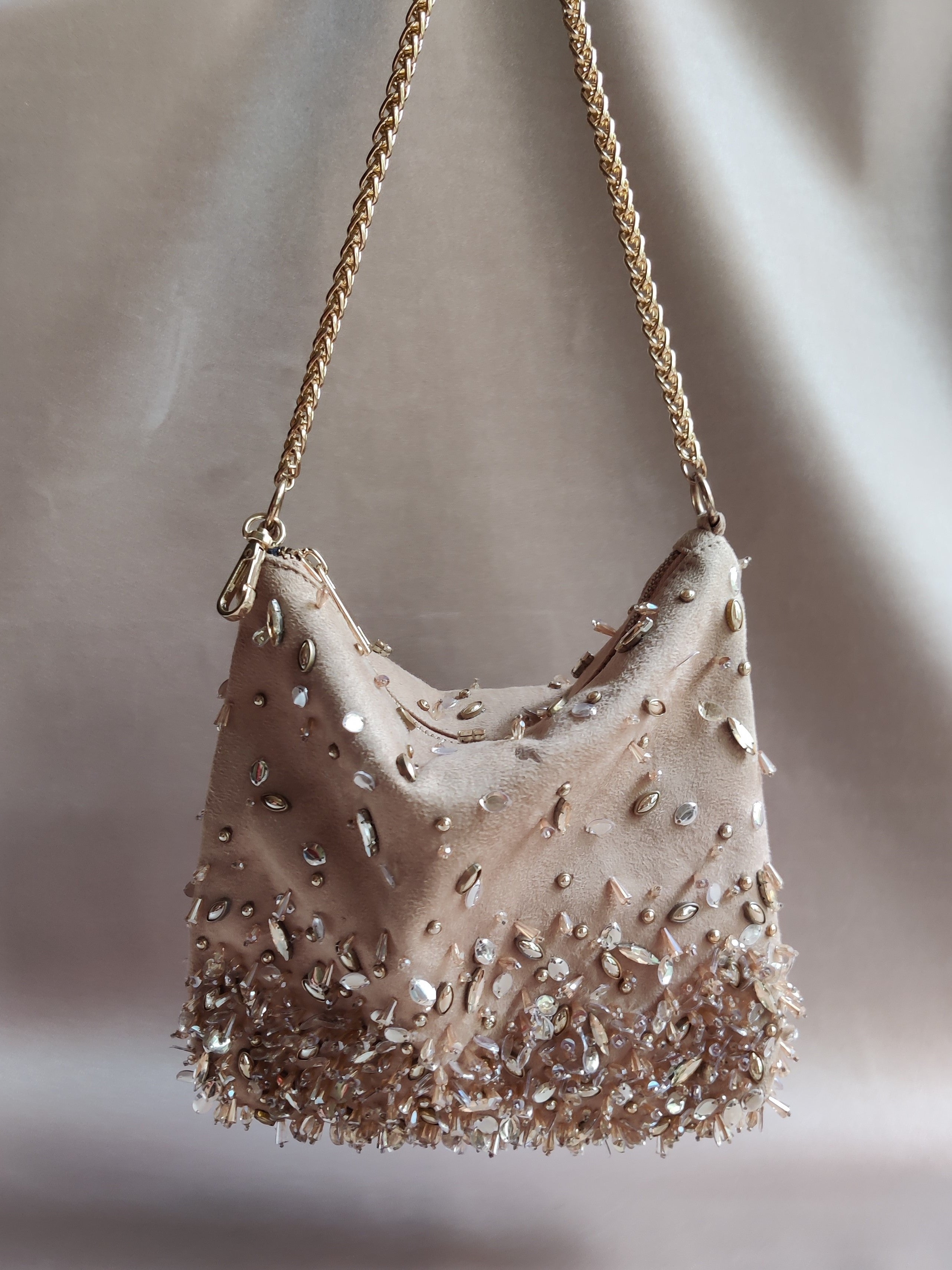 A dazzling fusion of style and versatility! This hobo bag, adorned with shimmering sequins, crystals, and glass beads, seamlessly transforms from a chic shoulder bag to an elegant potli. Perfect for both western and ethnic ensembles, it's the ultimate statement accessory. Elevate your look effortlessly with this blingy beauty that shines at every occasion!