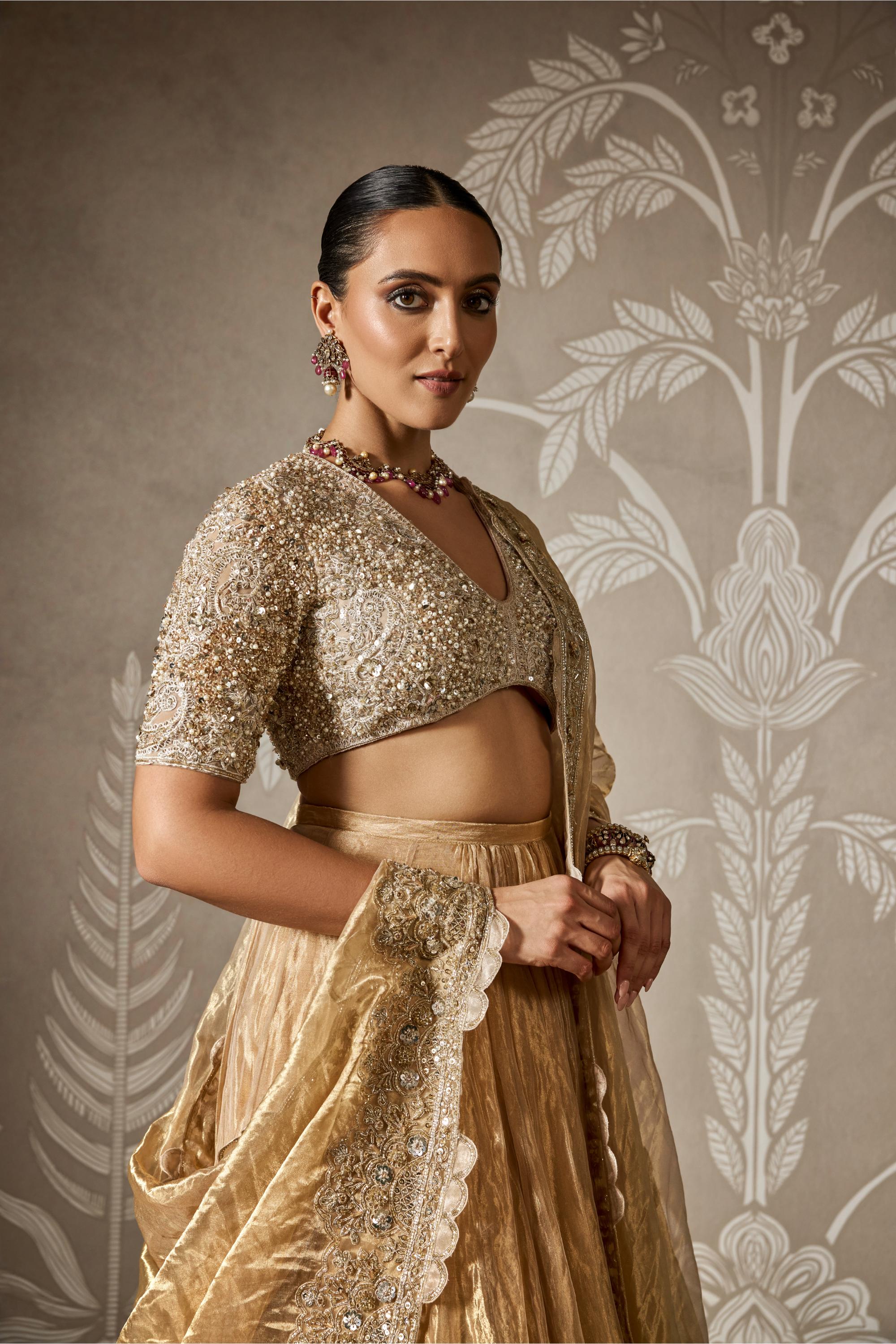 Graceful and luminous, the Gold Suhaila Zar Bano Lehenga Set captures the poetry of tradition in a modern silhouette. The lehenga shimmers with intricate craftsmanship and delicate embellishments, while the tailored blouse and flowing dupatta complete the ensemble with effortless elegance. Ideal for bridal moments, festive occasions, or regal soirees, this look is for the woman who embodies understated glamour and timeless charm.