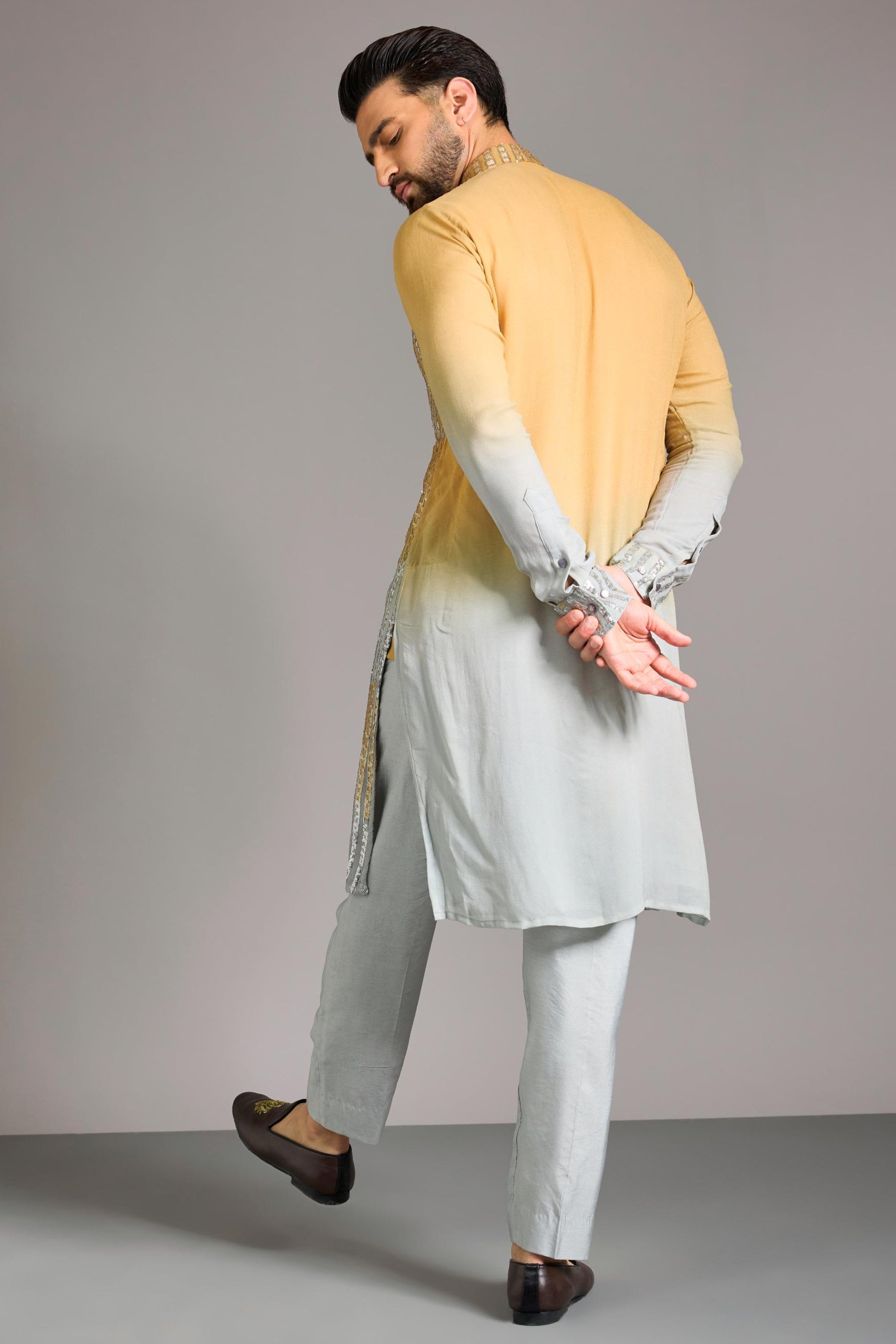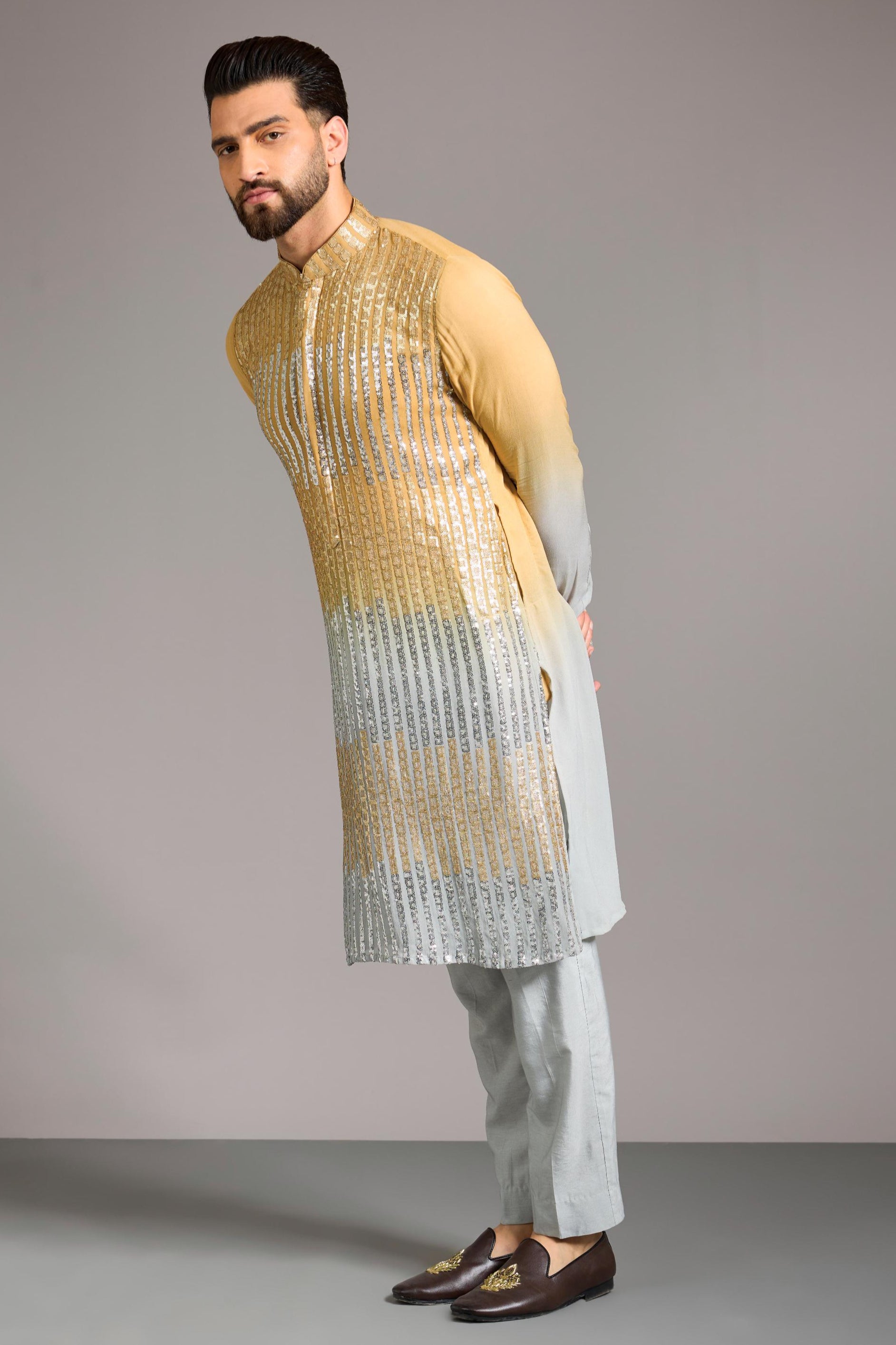 A seamless blend of radiance and subtlety, the Gold to Gray Shaded Kurta Set transitions beautifully from warm opulence to cool elegance. Crafted in a fluid silhouette, this set captures the essence of understated glamour. The soft gradient effect adds dimension and depth, while minimal embellishments keep it timeless. Ideal for intimate soirees or refined festive gatherings, it's a modern classic that speaks volumes with quiet grace.