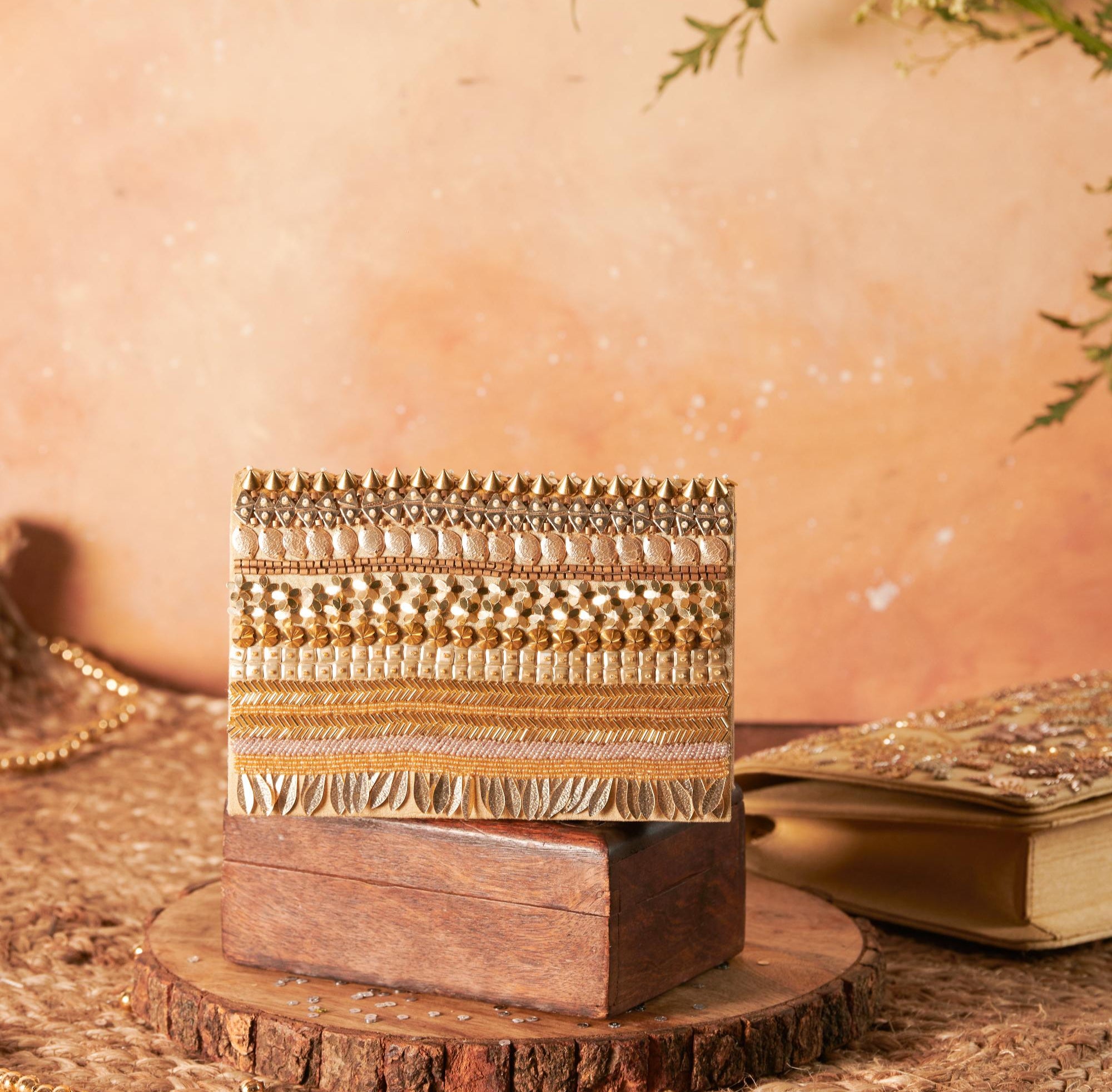 The Gold Unnati Clutch radiates timeless sophistication with its elegant design and rich golden hue. Crafted with meticulous detailing, this clutch is perfect for weddings, festive occasions, and evening events. Its luxurious finish and compact size make it both a stylish and practical accessory. Ideal for those who appreciate classic glamour paired with modern functionality.