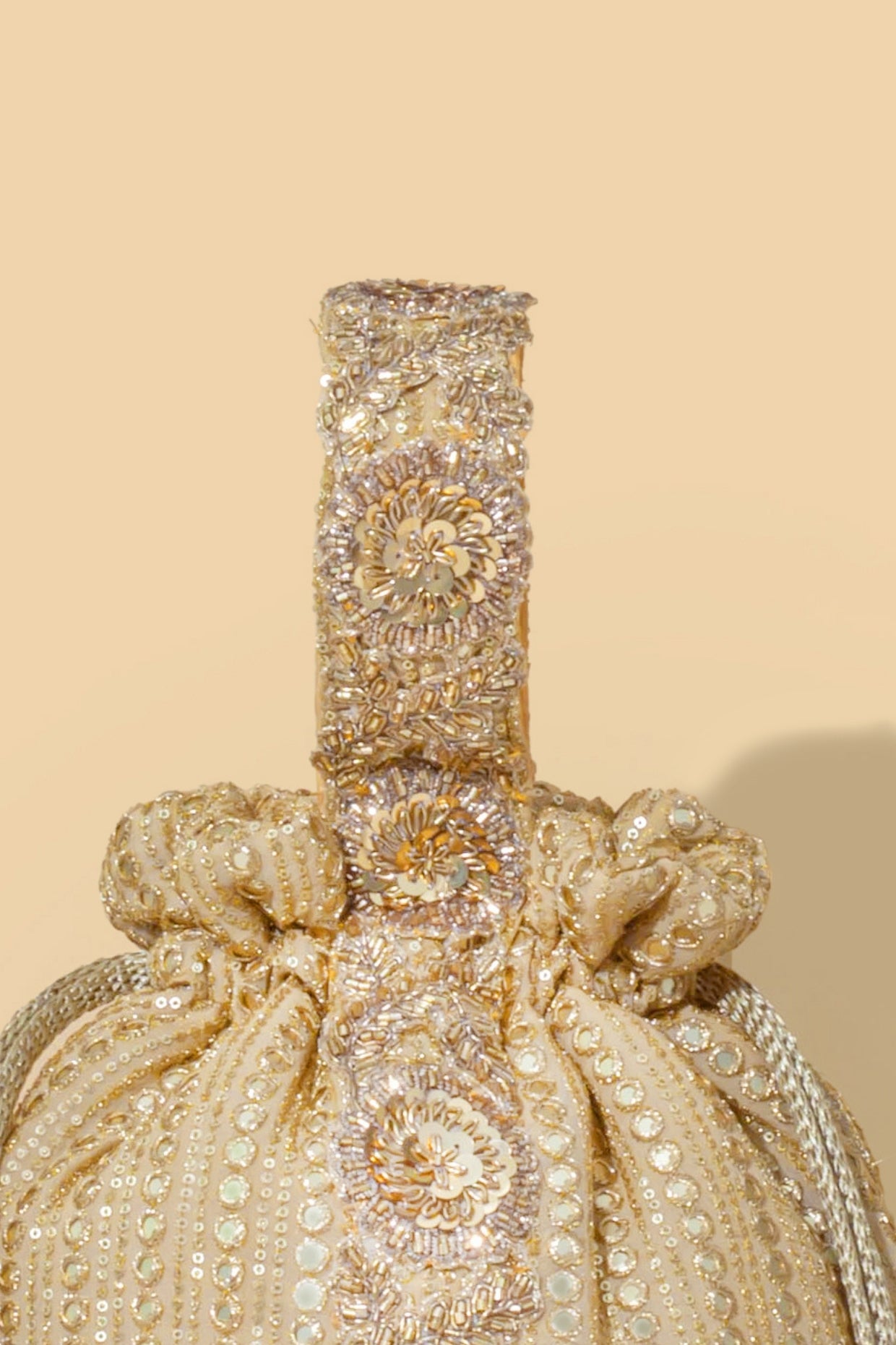 An exquisite round potli with delicate zari embroidery, the Gold Yari Embroidered Round Potli is a must-have for brides and wedding guests looking to make a statement.