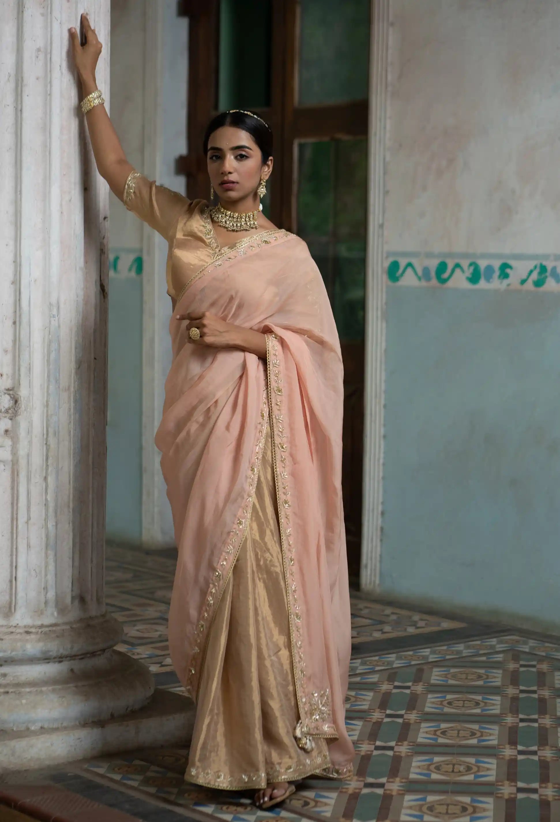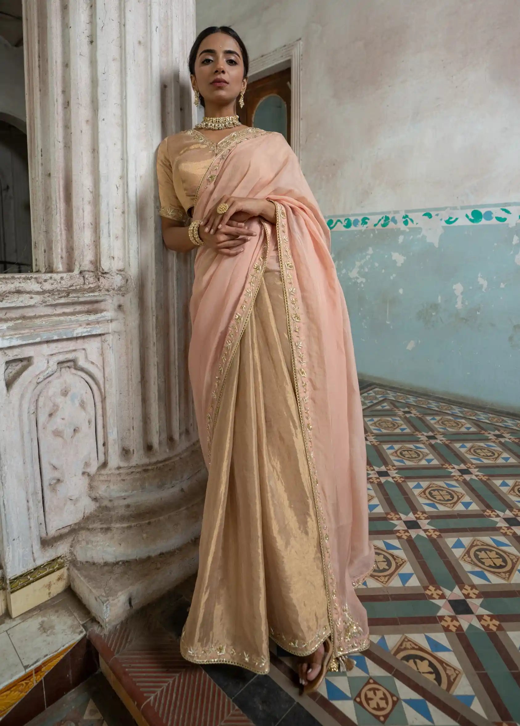 This opulent ensemble features a gold zari tissue blouse, adorned with exquisite embroidery that exudes luxury and elegance. It is paired with a rose peach saree, beautifully embroidered to complement the blouse's rich detailing. The warm gold and soft rose peach hues create a stunning contrast, resulting in a graceful and sophisticated look. Perfect for any special occasion, this outfit combines intricate craftsmanship with timeless charm.