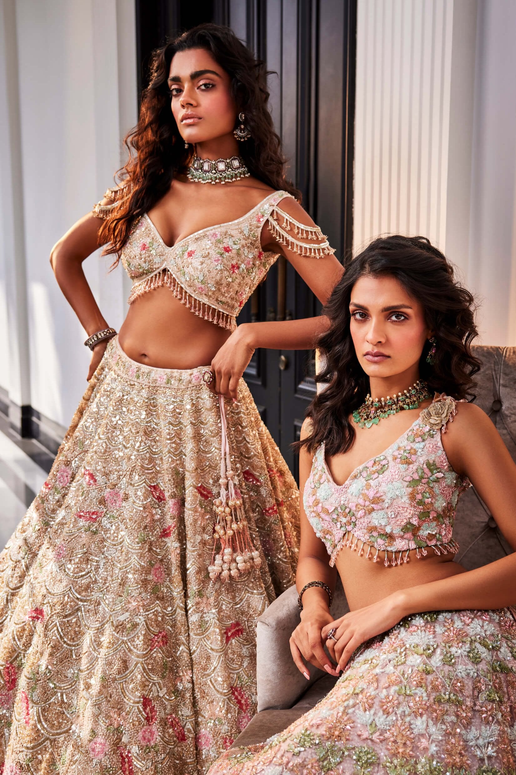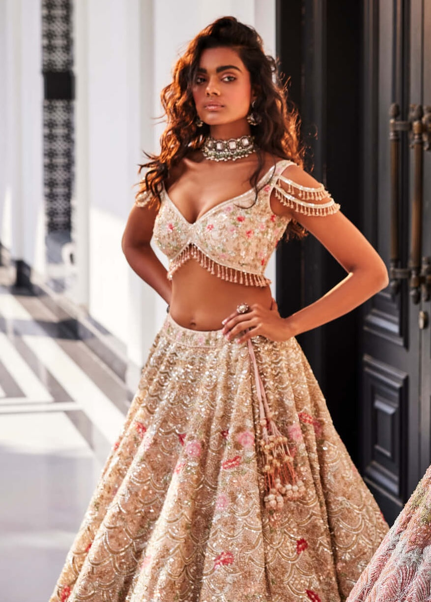 Introducing the golden glitter lehenga, an exquisite creation in ivory organza that combines opulence with intricate craftsmanship. The lehenga features mesmerizing hand embroidery that adorns the light and airy organza fabric, creating a dazzling effect with its detailed, glittering designs. The soft ivory hue adds a touch of timeless elegance, while the exquisite embroidery enhances the lehenga’s luxurious appeal.