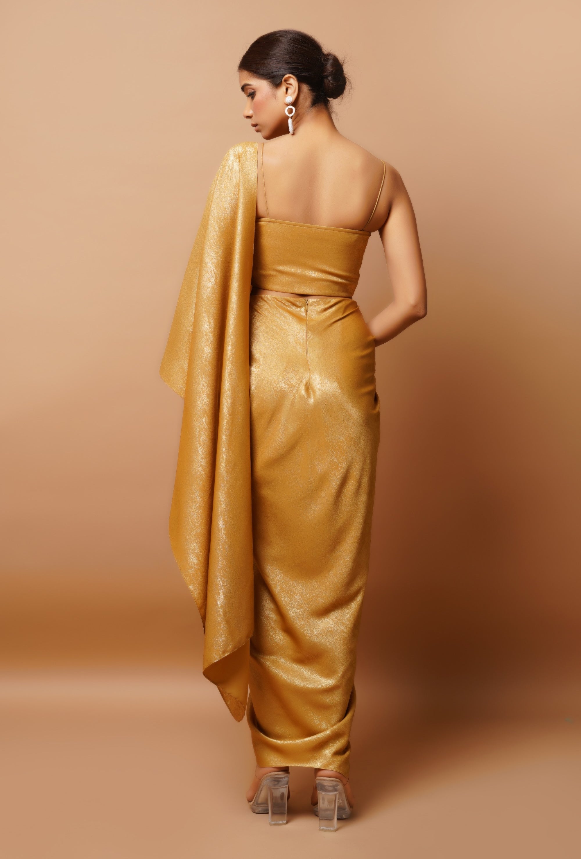Discover a blend of modern elegance and traditional charm with this stunning outfit. Featuring a front-pleated padded bustier, this ensemble is designed to offer both support and style. The front slit drape skirt, with its attached dupatta and integrated mini skirt, creates a sophisticated layered effect. The thoughtful design elements and meticulous craftsmanship ensure a look that's both striking and refined, making it perfect for any upscale occasion.