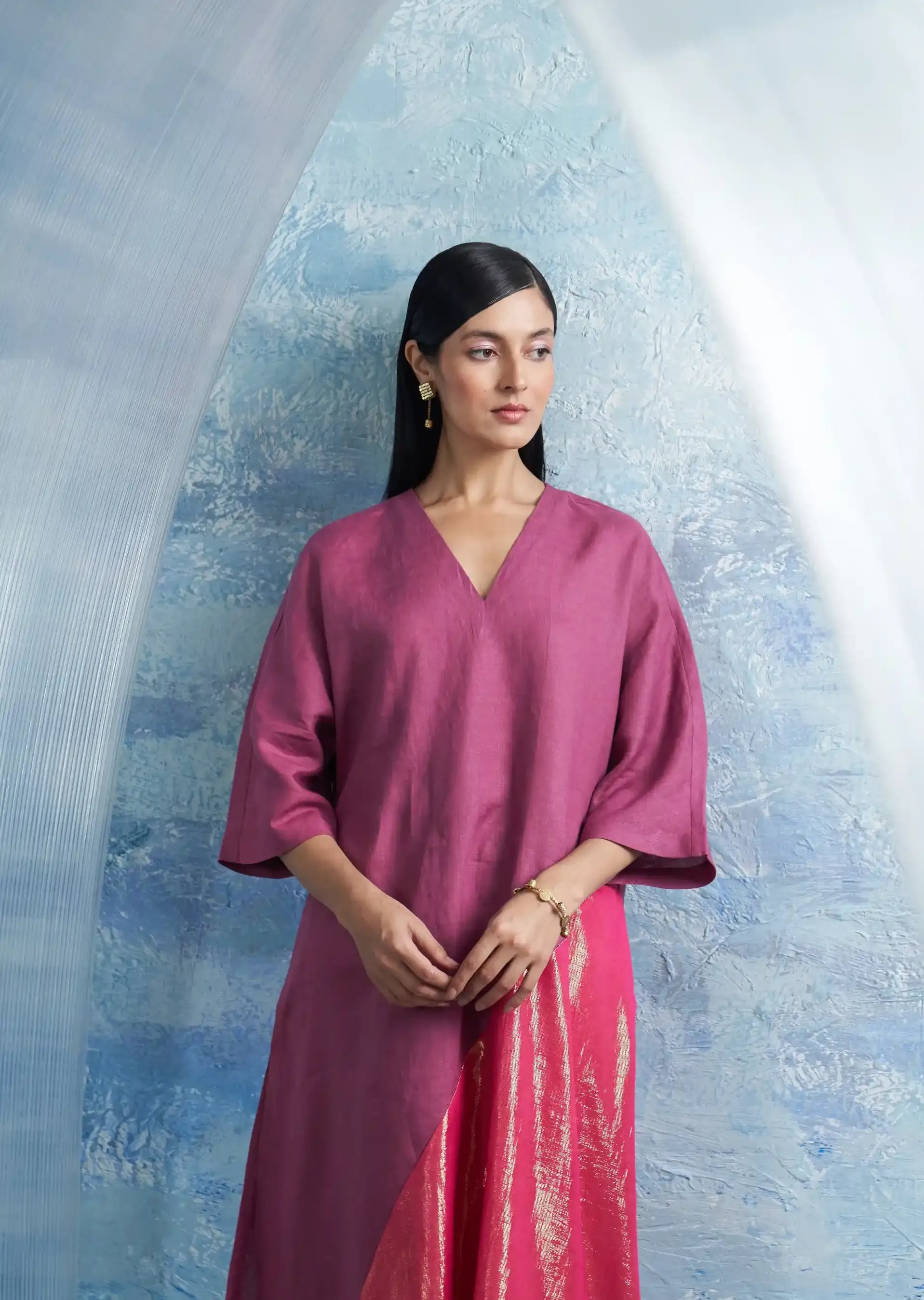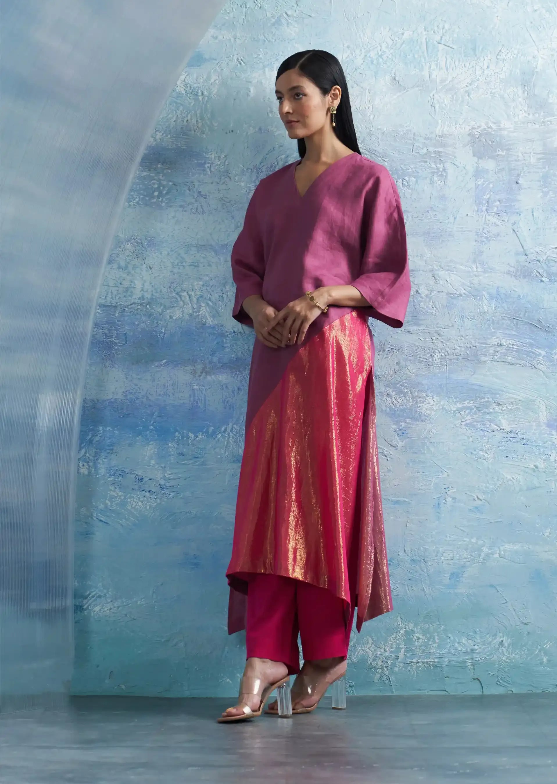 Enter elegance with our fuchsia pink kurta set, crafted from premium linen and cotton shimmer fabric. Its timeless silhouette flows gracefully, exuding chic charm, while the captivating blend of linen and shimmer creates a mesmerizing allure that draws the eye. Paired with flowy cotton satin pants, this set beautifully balances comfort and style. Completing the ensemble is a sheer organza dupatta, adding an ethereal touch. The pants feature an elasticated waistband and a drawstring for a perfect fit, ensuring you look and feel your best on any occasion.