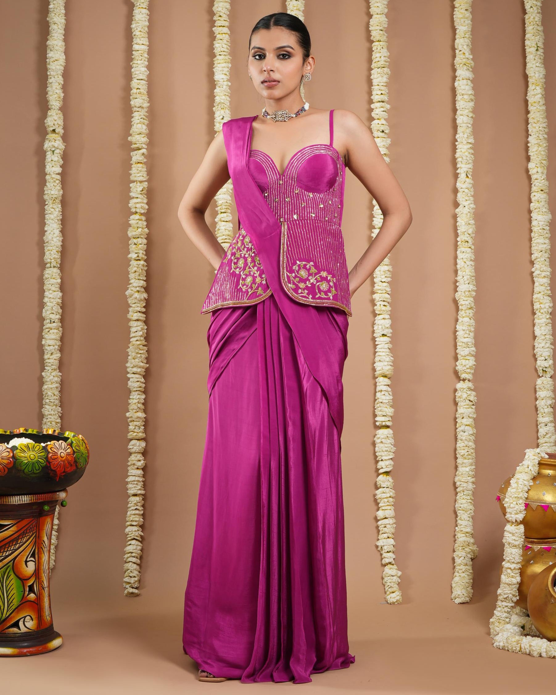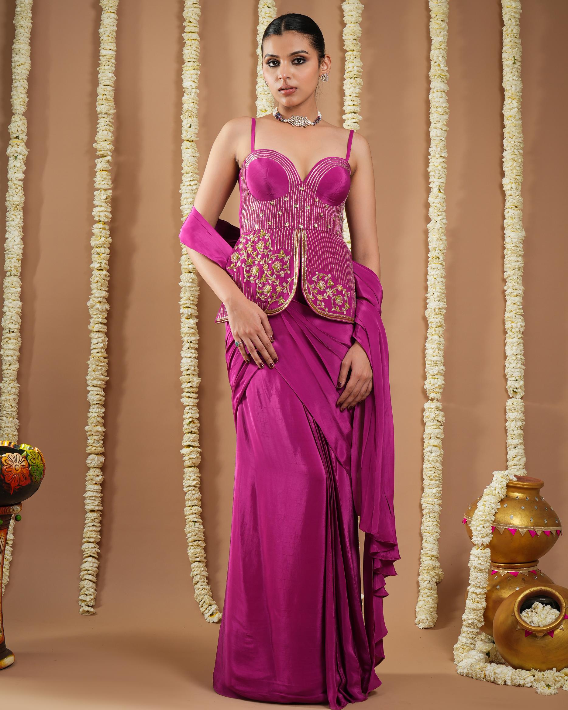 Exude sultry elegance in the Grape Wine Avyanna Corset Pre-Draped Saree. With its rich hue and sculpted silhouette, this ensemble is perfect for evening soirŽes, weddings, and festive celebrations.