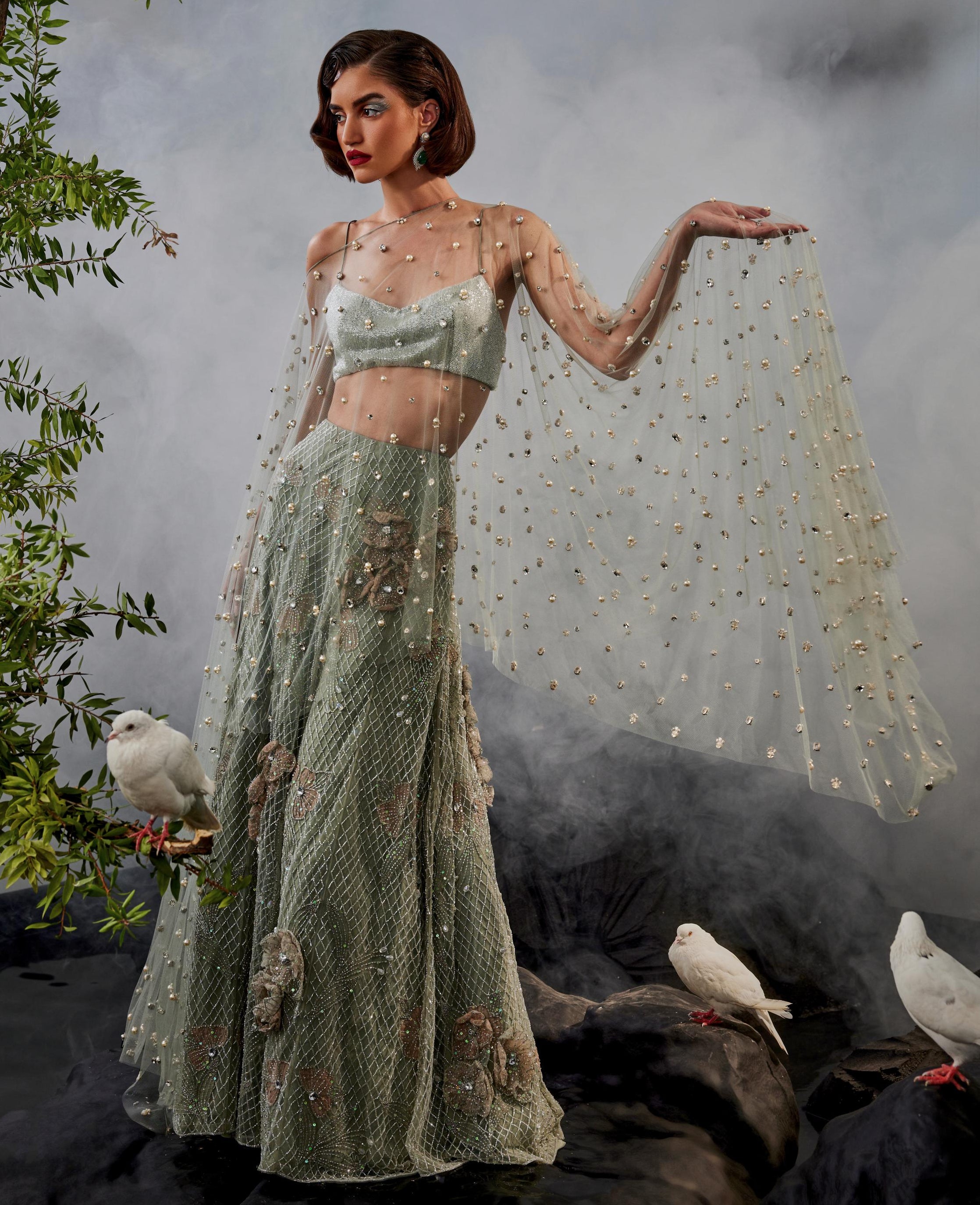 Sophisticated, graceful, and effortlessly chic, the Gray Amour Lehenga with Blouse and Cape is a stunning embodiment of modern luxury and traditional craftsmanship. The soft gray lehenga flows beautifully, creating a flattering silhouette, while the intricately designed blouse enhances the ensemble with timeless elegance. The delicate cape adds an ethereal touch, offering an enchanting and contemporary twist. Perfect for weddings, formal events, or grand celebrations, this lehenga set exudes refined beauty and modern charm. For the woman who loves to make a statement with understated glamour and exquisite detail, this ensemble is a must-have.