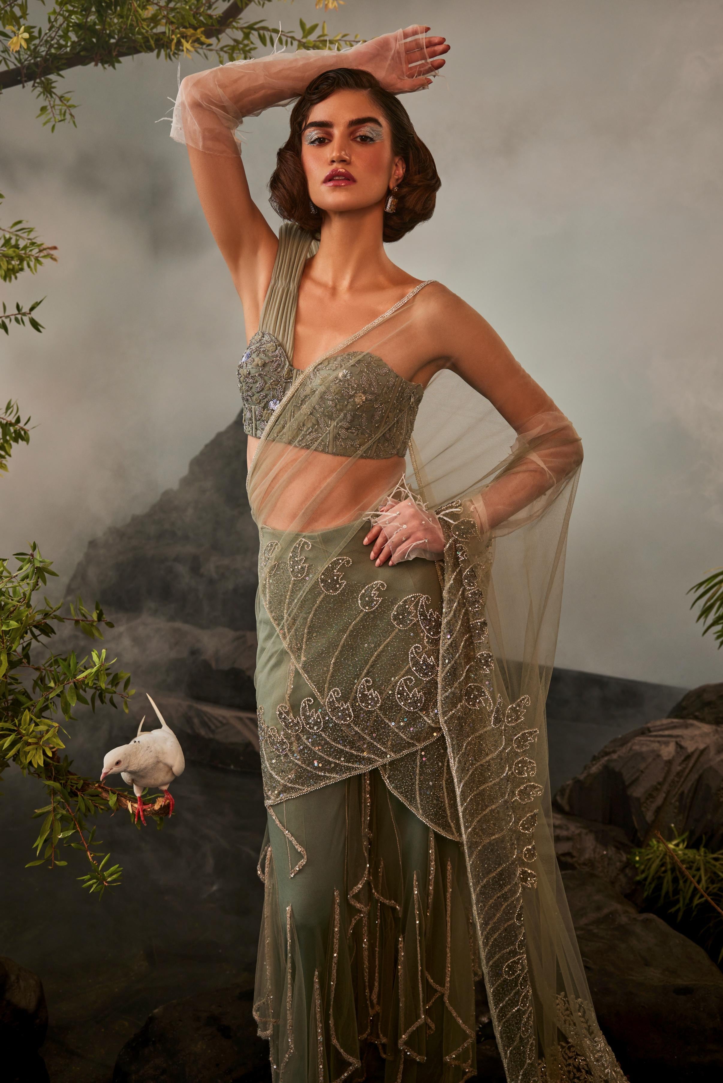 Bold, elegant, and contemporary, the Gray Amour Sharara Sari and Corset with Shoulder offers a stunning fusion of traditional and modern design. The gracefully flowing sharara creates a flattering silhouette, while the corset adds a structured, figure-enhancing touch. The unique shoulder detail adds a contemporary twist, making this ensemble perfect for high-profile events, weddings, or formal occasions. The rich gray hue brings a sense of sophistication and versatility, ensuring you stand out with confidence. For the woman who loves to combine timeless elegance with cutting-edge style, this outfit is the ultimate choice.