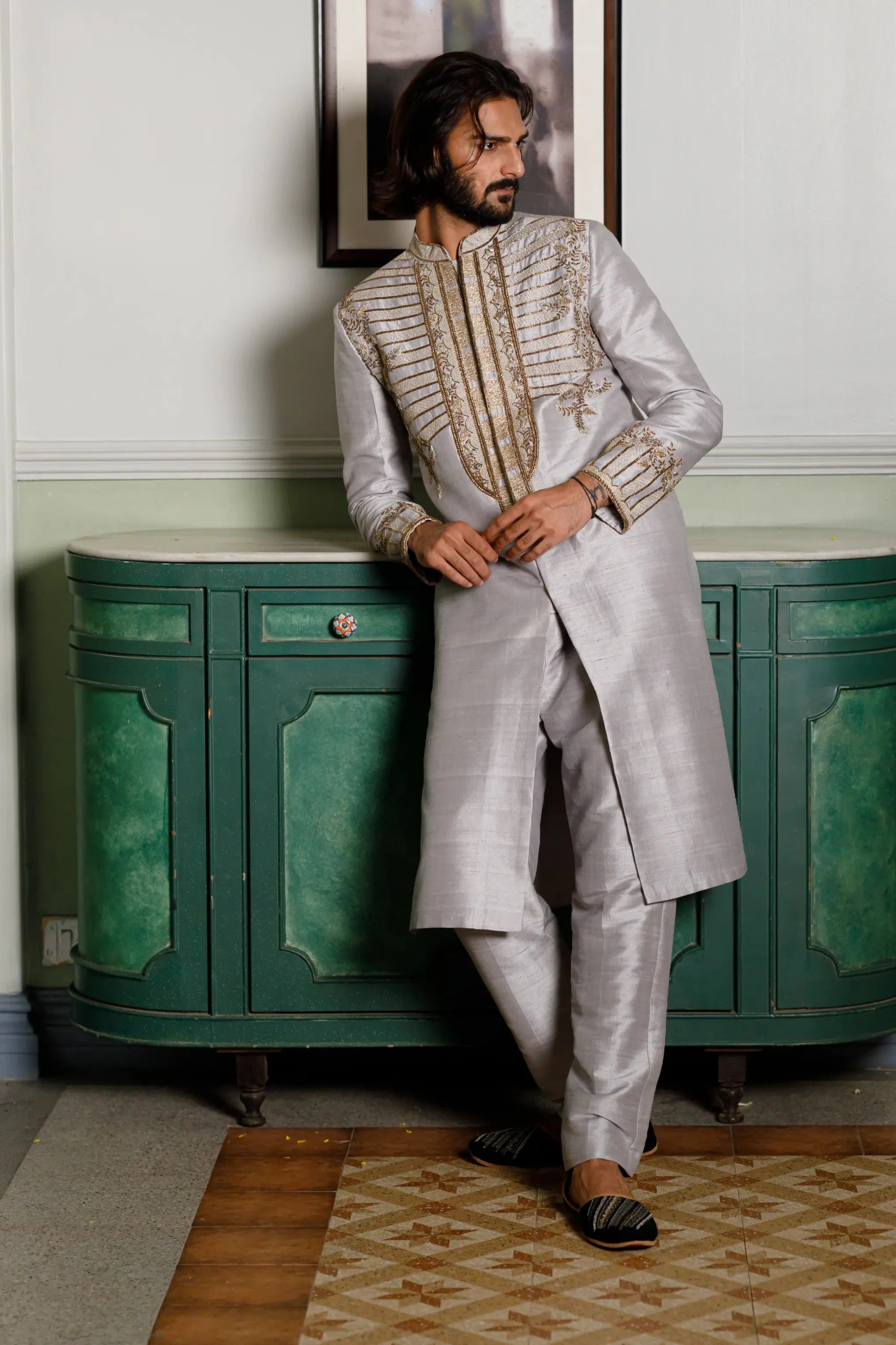 The Grey Embroidered Sherwani with pant offers a sophisticated and modern twist on traditional menswear. Featuring intricate embroidery along the sherwani, this set exudes elegance and class, making it perfect for weddings, engagements, or festivals. The tailored pant ensures a sleek and comfortable fit, completing the ensemble with a polished, refined look for any special occasion.