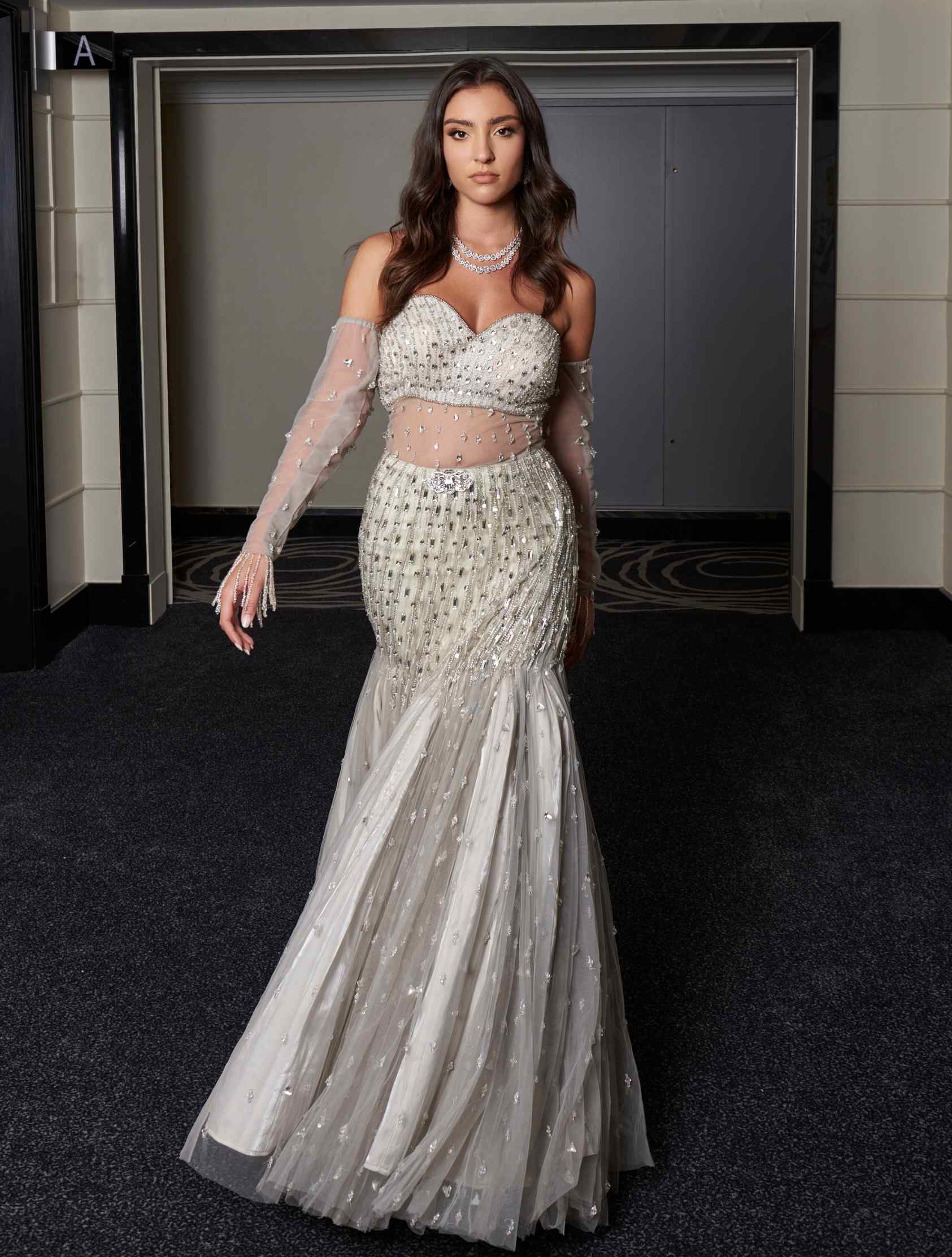 Elevate your evening wear with our silver gray gown, featuring exquisite hand crystal work embroidery on delicate net fabric, with luxurious habutai silk lining. This gown exudes sophistication and allure, blending intricate craftsmanship with timeless elegance. Perfect for formal events and special occasions, it offers a refined and glamorous look that ensures you stand out with grace.