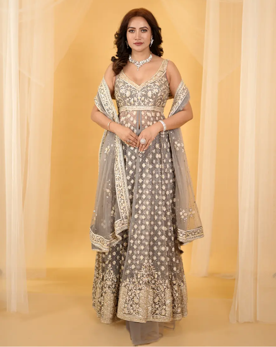 Step into a world of understated sophistication with our Gray Floral Anarkali Set, a stunning ensemble that effortlessly blends floral beauty with timeless elegance. This graceful Anarkali set in a soft gray tone features delicate floral embroidery that brings the design to life with a touch of nature-inspired charm. Ideal for weddings, festive occasions, or any special celebration, this set is designed to make a lasting impression.