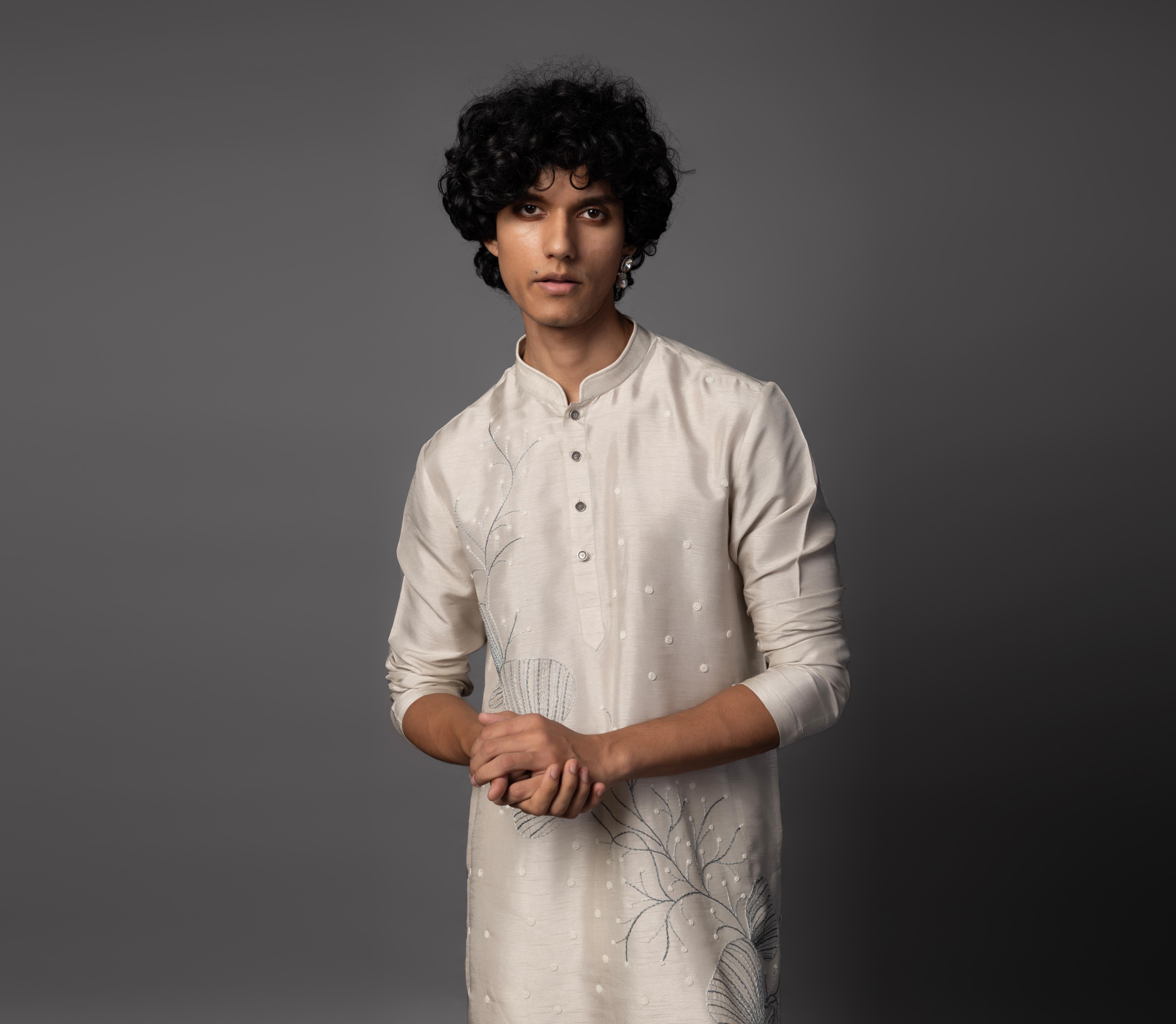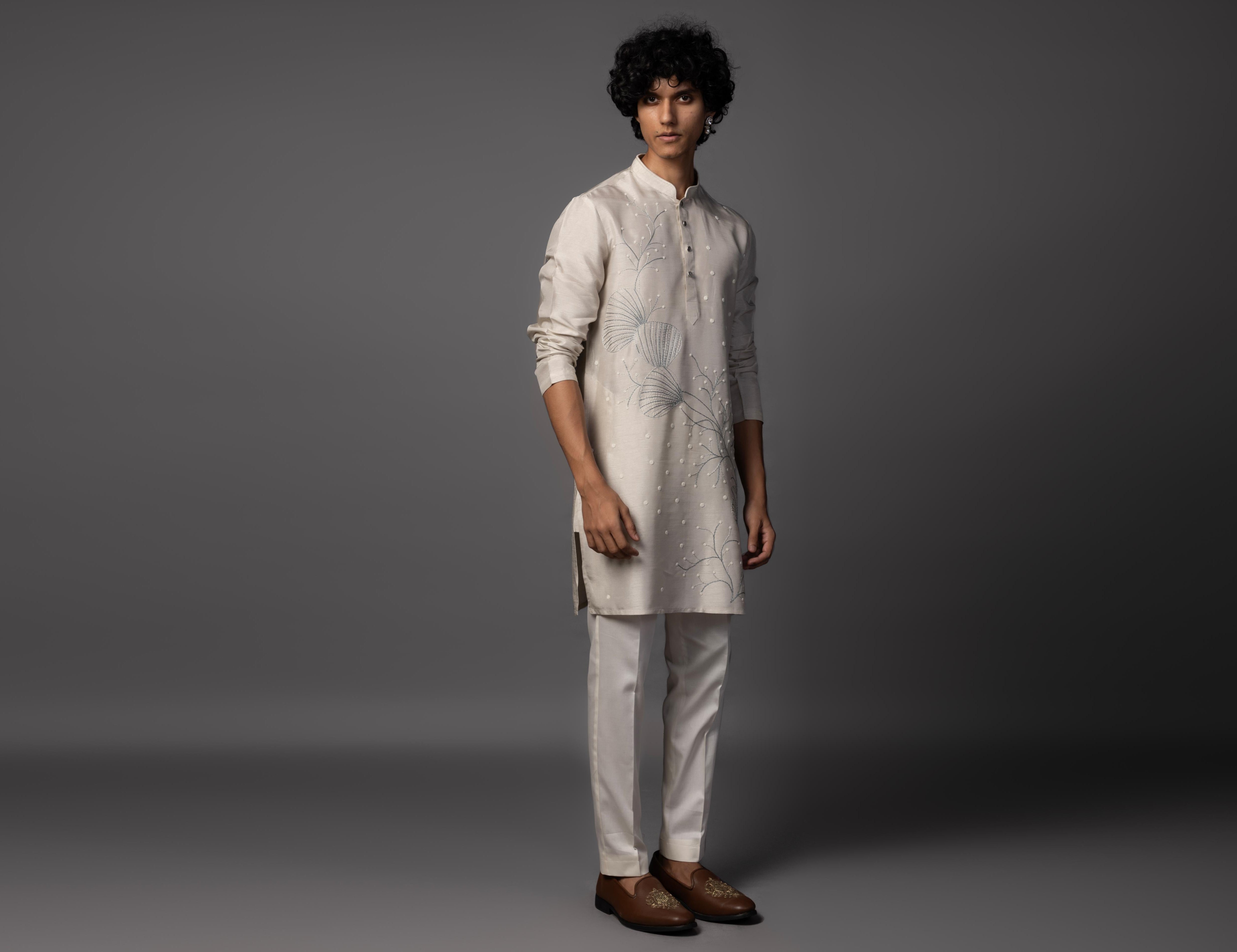 Embrace understated beauty with the Gray Floral Dusk Kurta Set, a refined ensemble that effortlessly combines modern sophistication with traditional charm. The soft gray hue, paired with delicate floral motifs, creates a serene and elegant look, making it the perfect choice for weddings, festive occasions, or any celebration where grace and poise are key.