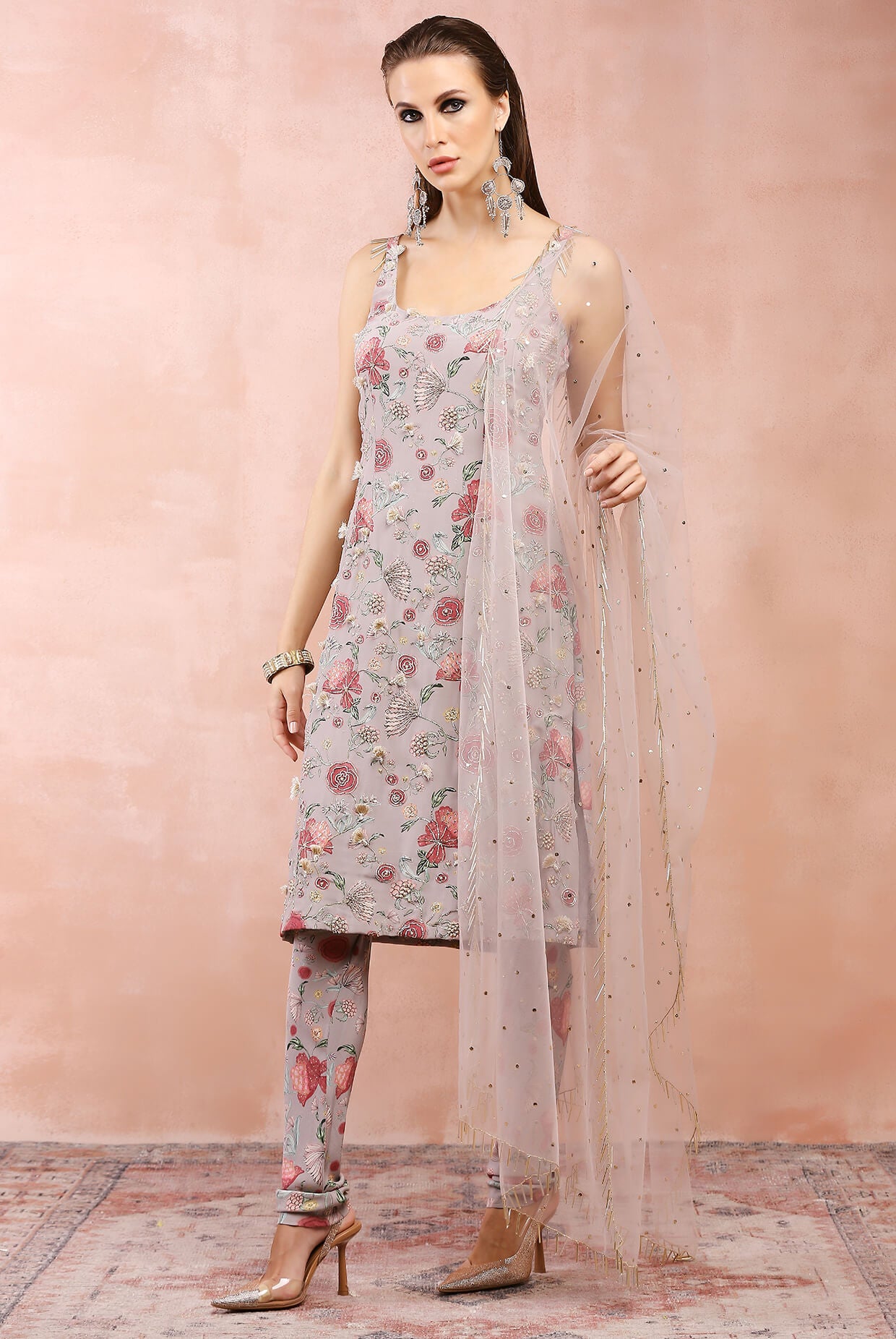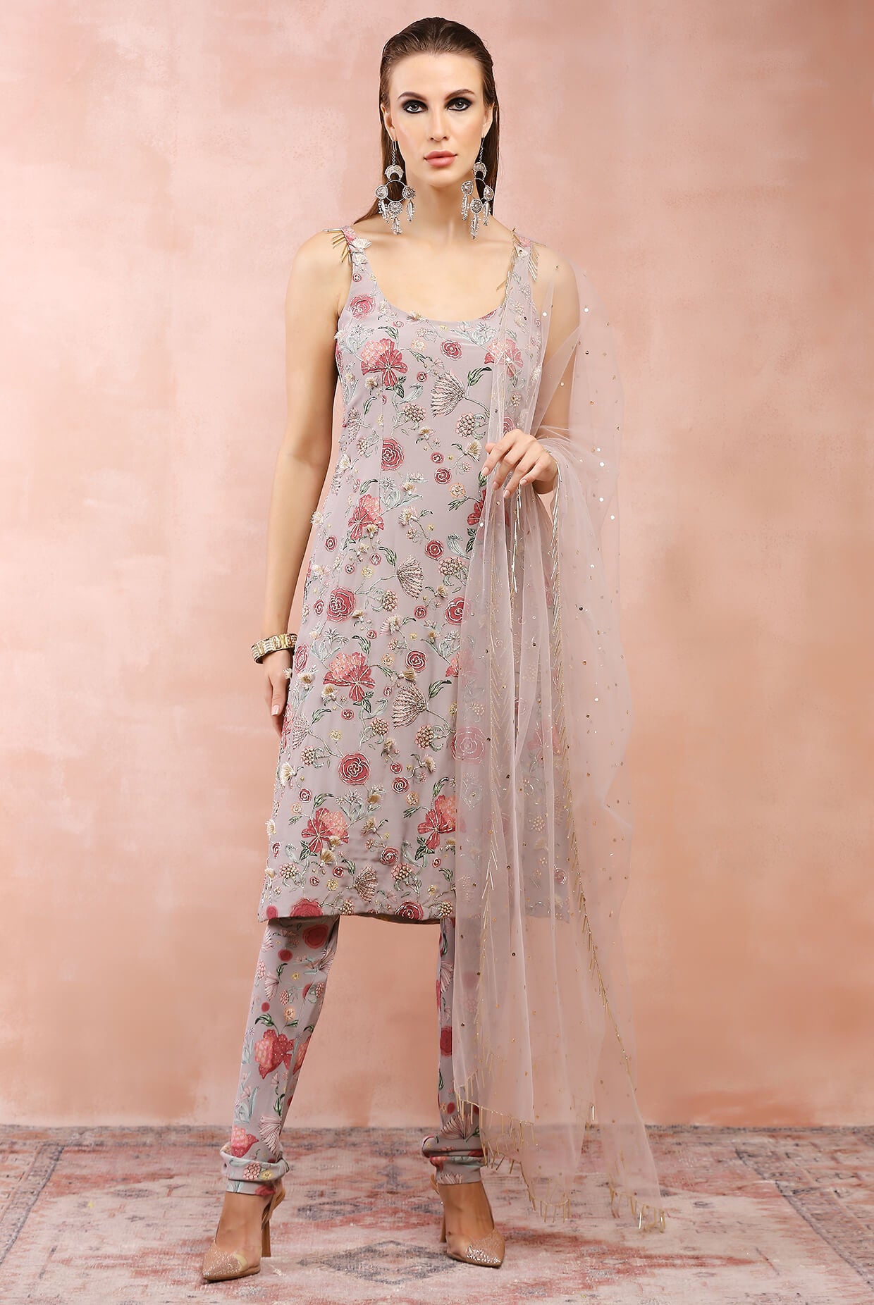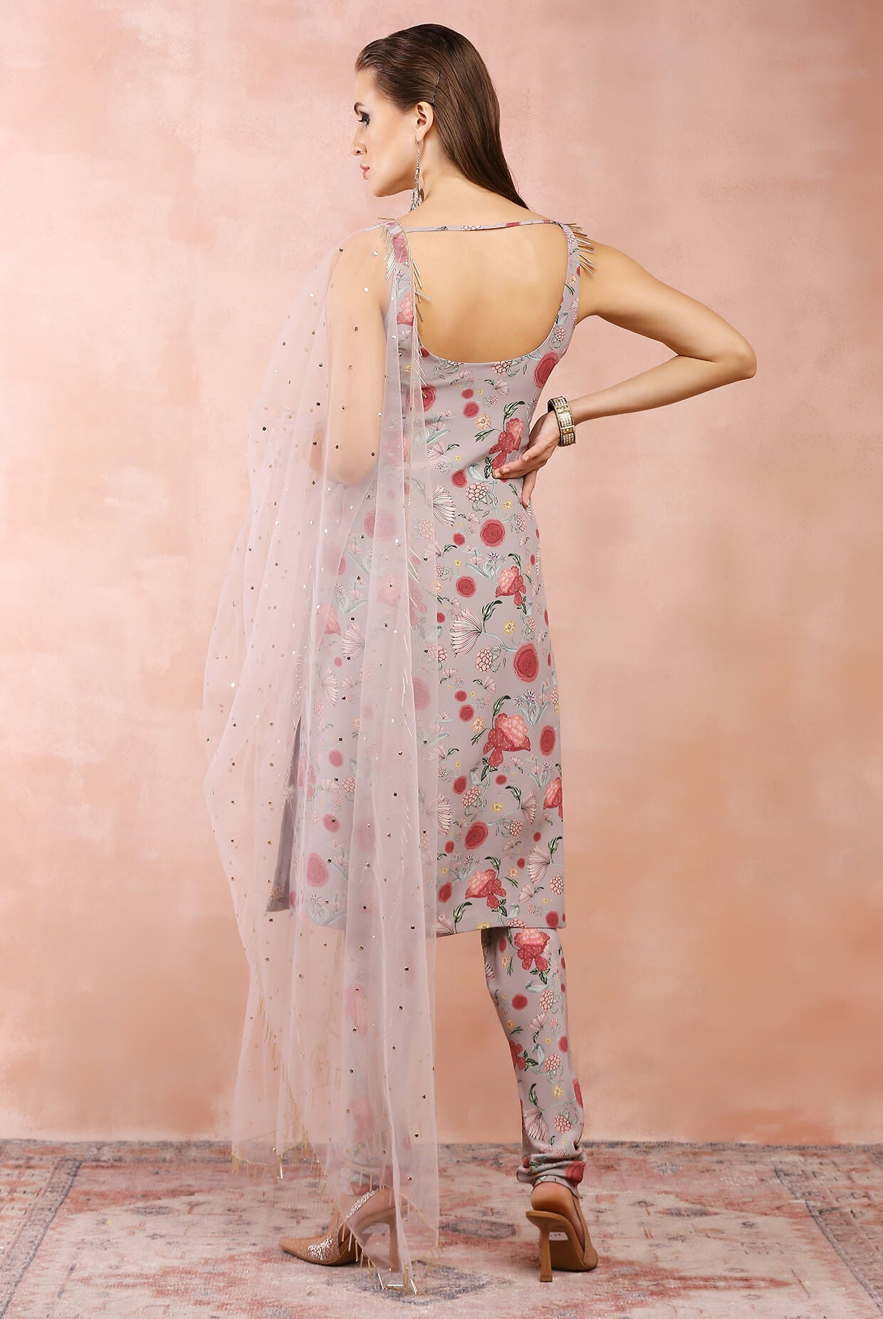 Step into understated elegance with our Gray Gulbagh Print Crepe Kurta and Churidar Set. The kurta features a refined gulbagh print with delicate embroidery, crafted from soft crepe for a graceful drape. Paired with a matching churidar and a shimmering mukaish net dupatta, this ensemble blends classic charm with contemporary style. Perfect for both formal and festive occasions, it offers a sophisticated look with effortless comfort.