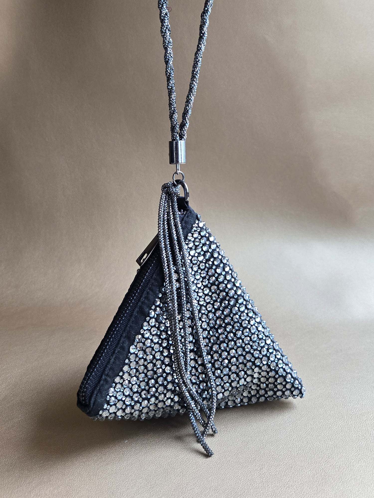 A bold and dazzling mini pyramid bag inspired by India's vibrant capital! Embroidered with shimmering Swarovski crystals and featuring a striking rhinestone strap, this masterpiece is designed for the fearless fashionista. Whether you're stepping out for a gala, a party, or a special event, this statement accessory ensures you shine bright with confidence!