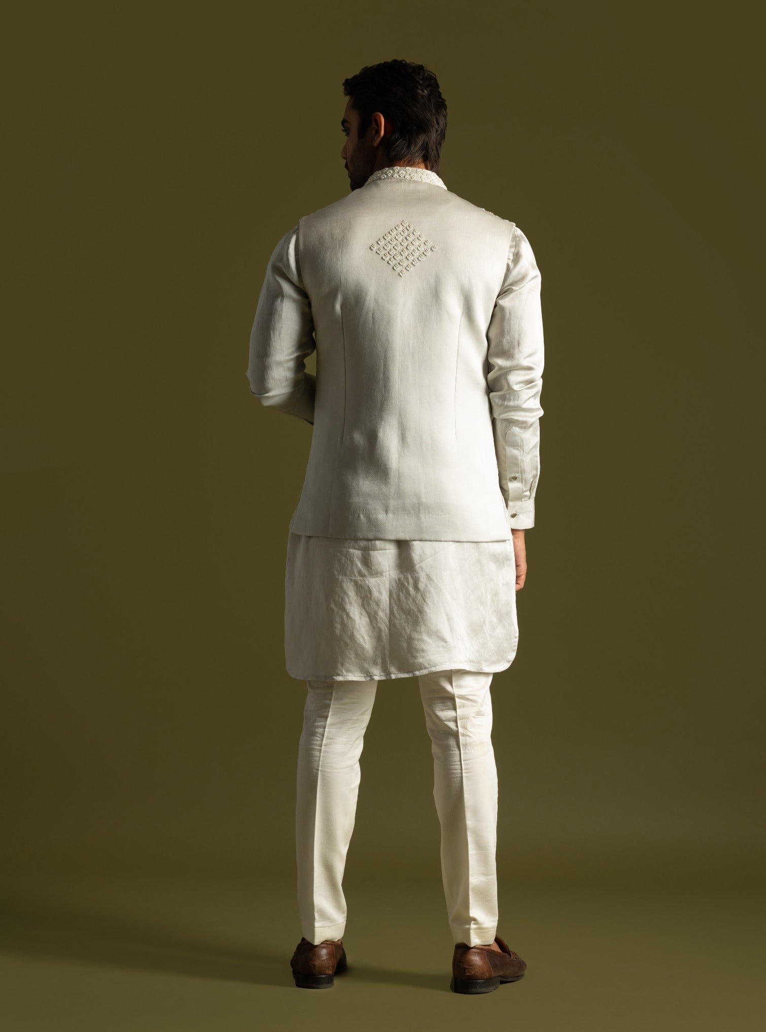 Elevate your formal wardrobe with our gray linen satin Nehru jacket, adorned with intricate cutdana and French knot embroidery that exudes timeless elegance. This meticulously crafted jacket features detailed embroidery all over, adding a layer of texture and refinement to its sleek silhouette. Paired with a light gray kurta, designed with a modern curved hemline and highlighted by a distinctive chest motif, this ensemble is completed with classic cream pant pajama. Perfect for distinguished events and special occasions, it offers a seamless blend of tradition and contemporary style.