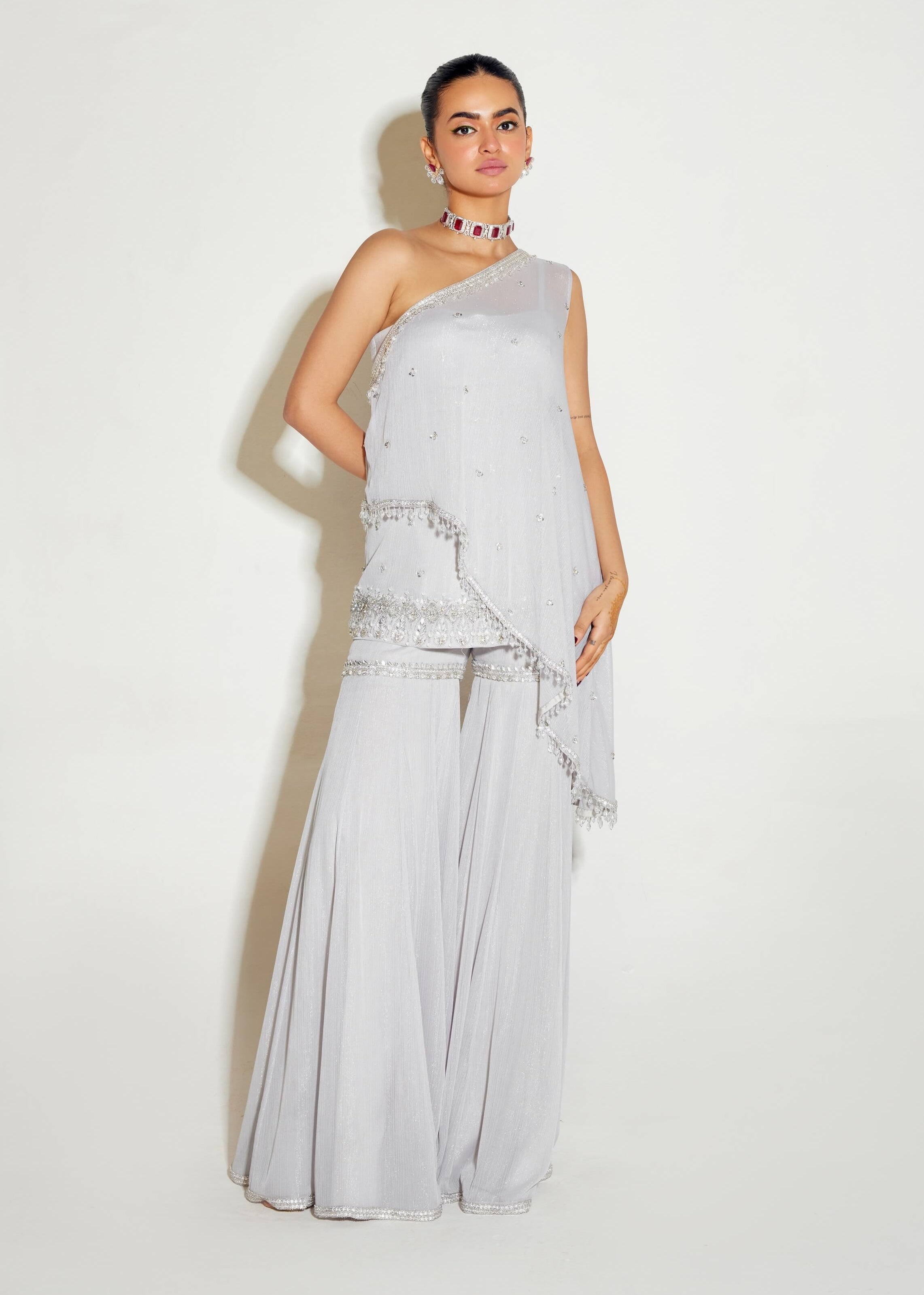Embrace sophisticated elegance with our gray one-shoulder cape, adorned with silver embroidery and delicate glass bead drops along the neckline and hemline. The cape is elegantly layered over a metallic georgette peplum, featuring hand-embroidered borders for a touch of refined artistry. Complementing the ensemble is a matching sharara, detailed with embroidery at the thighs and borders. Ideal for special occasions, this outfit harmoniously blends intricate craftsmanship with luxurious fabric, offering a stunning and stylish statement.