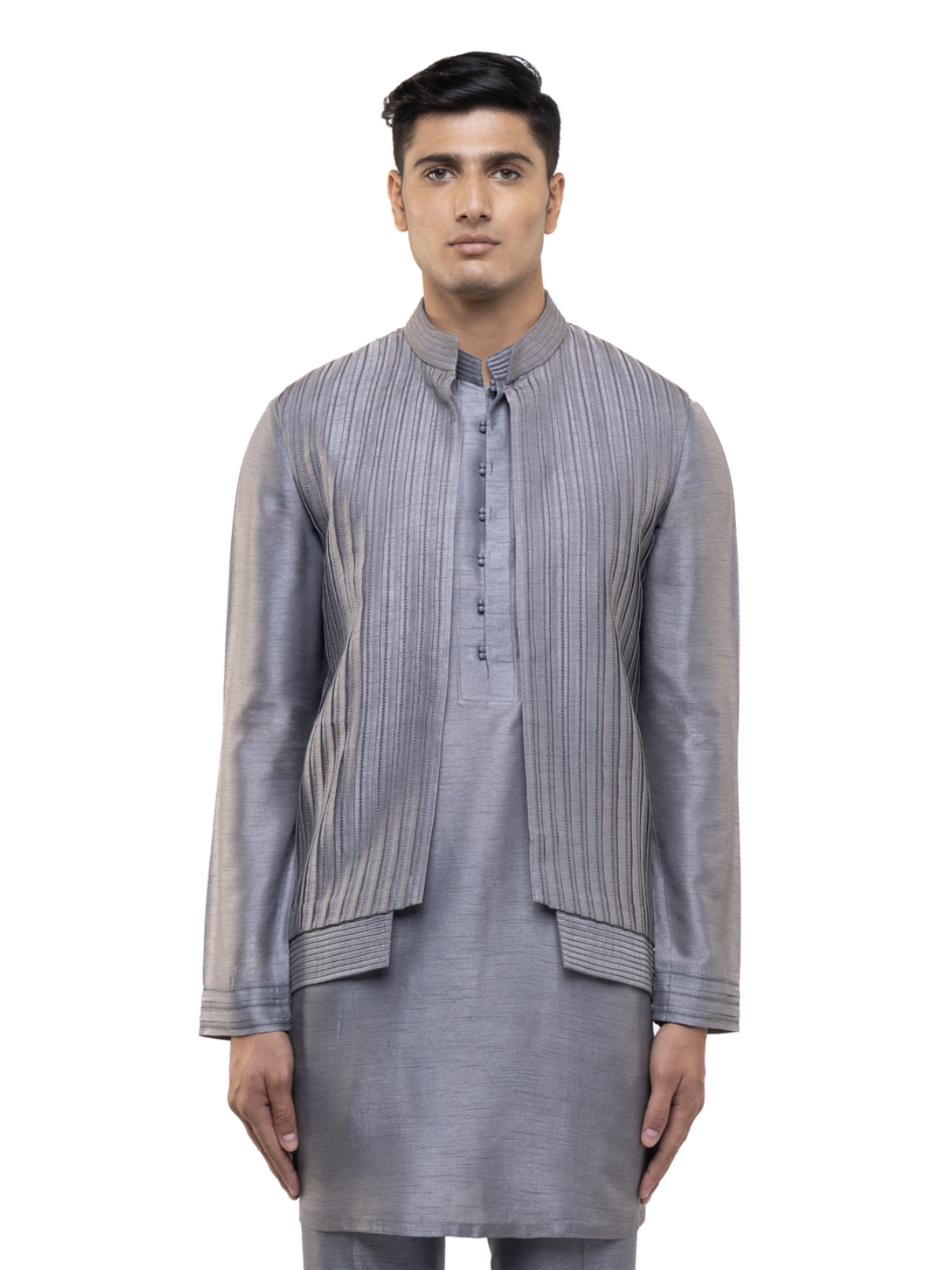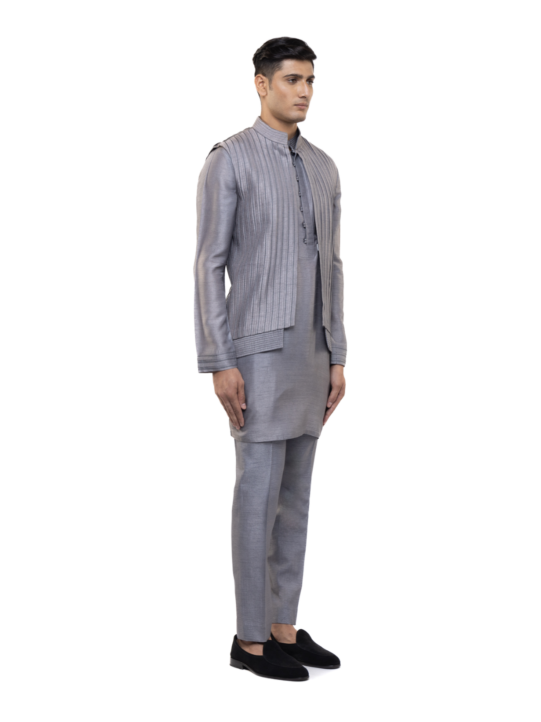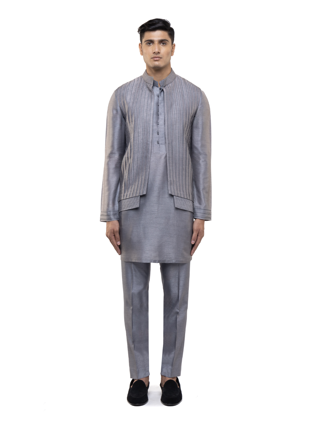 Modern and stylish, this Grey Pleated Open Kurta Bandi Set features an elegant open placket design with pleated detailing for added texture. Crafted from luxurious silk, it is designed with a stand collar, Mother of Pearl buttons, and an asymmetric hem that brings contemporary flair. The regular fit ensures comfort and sophistication, making this set ideal for festive occasions, receptions, or stylish celebrations.