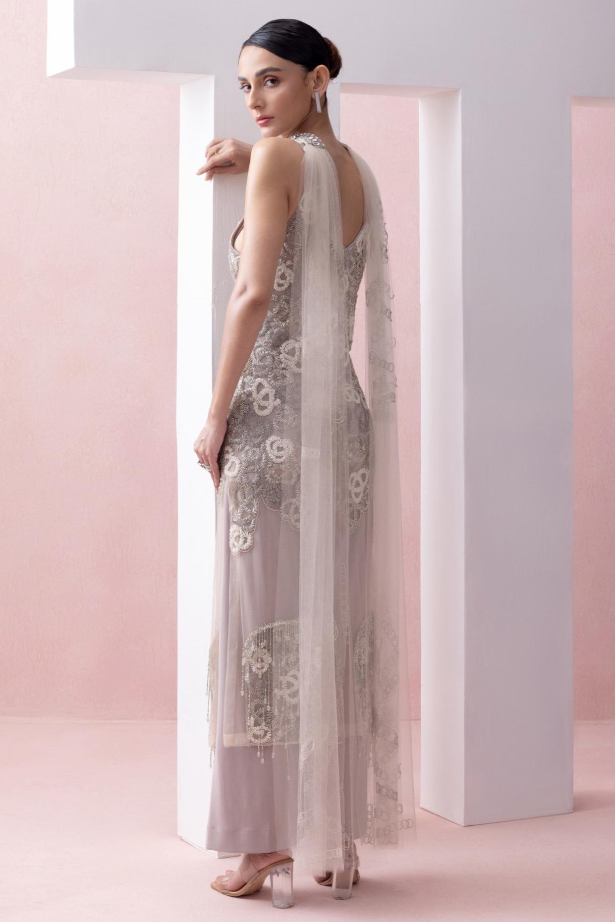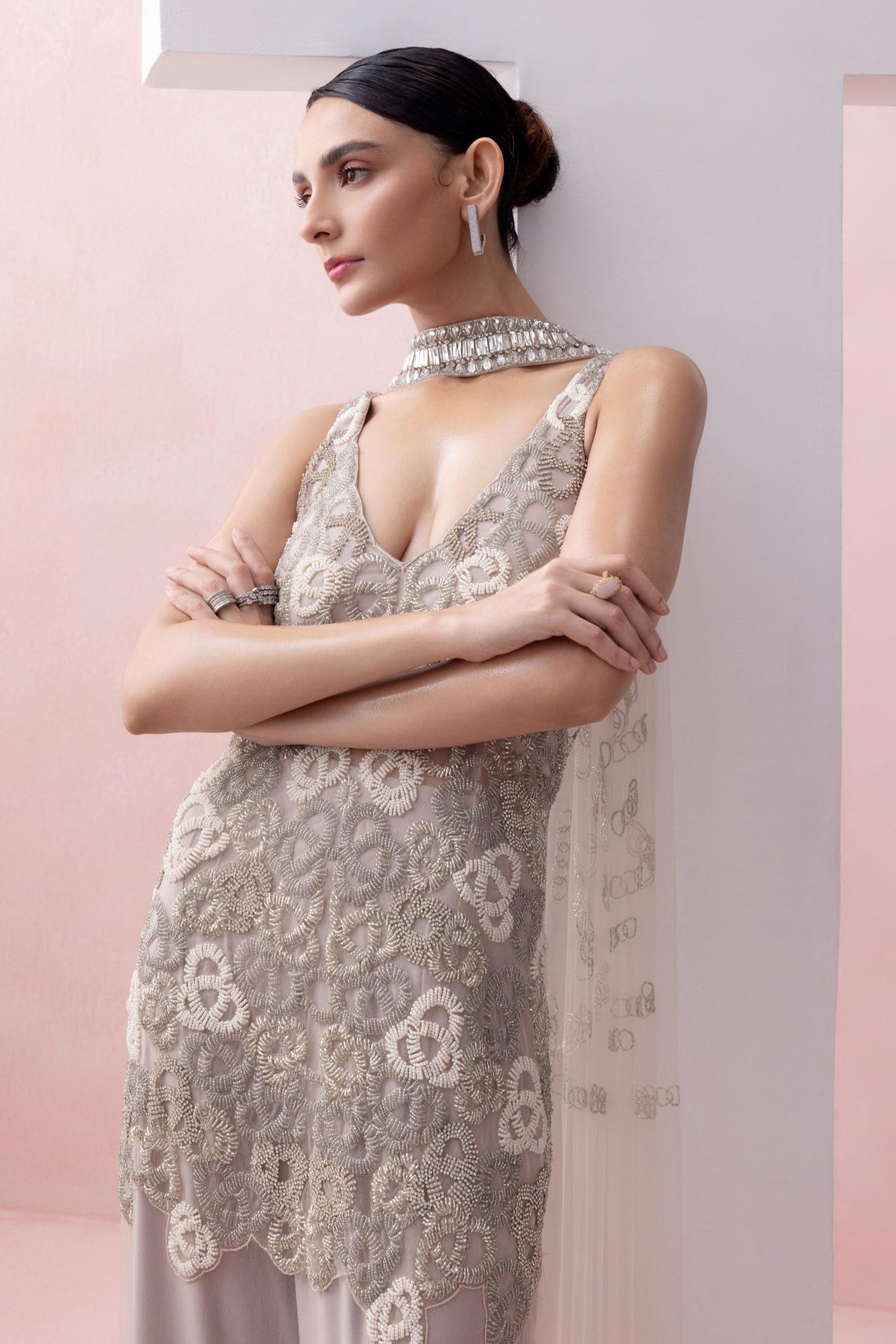 Chic, modern, and effortlessly elegant, the Gray Reverie-Festive Tunic with Pants and Collar Stole is a perfect fusion of contemporary design and timeless sophistication. The flowing tunic offers a flattering silhouette, while the tailored pants provide structure and balance for an elegant look. The collar stole adds a refined touch, elevating the ensemble with a hint of drama and luxury. Ideal for weddings, festive gatherings, or upscale events, this outfit is designed for the woman who loves to combine modern flair with classic charm and style.