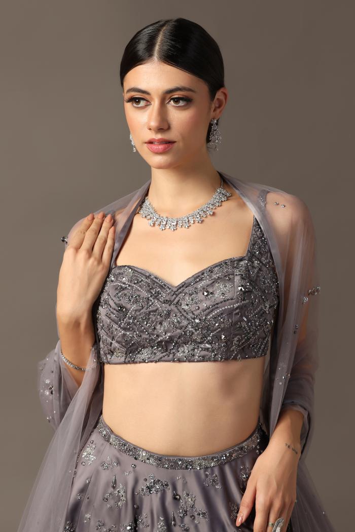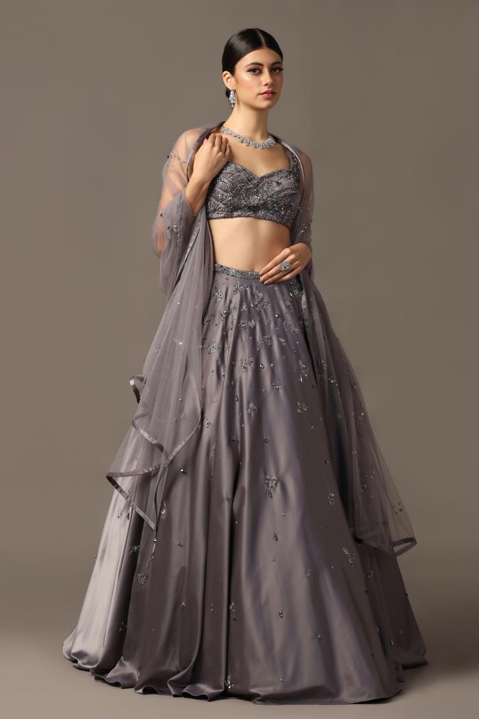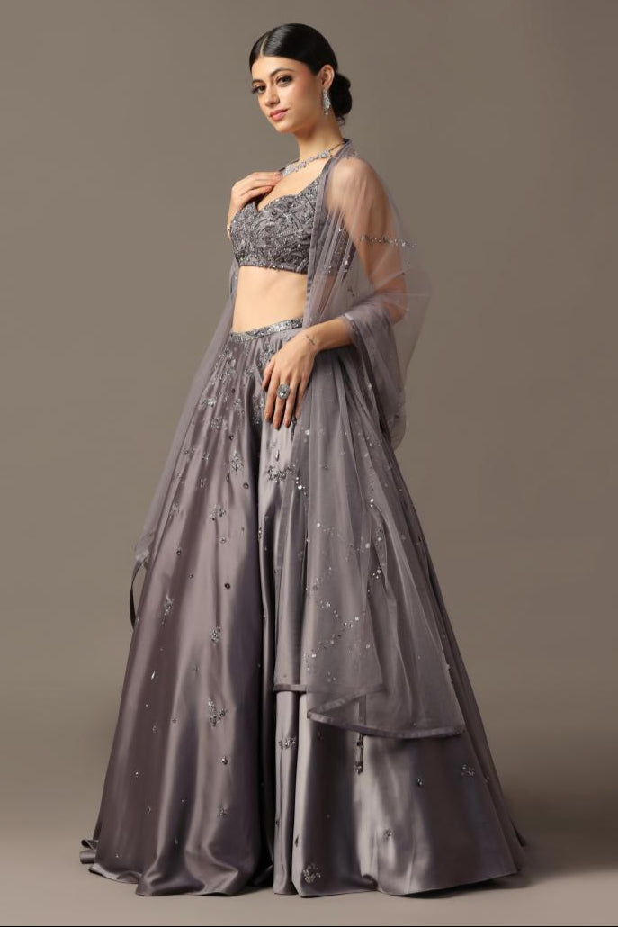 Step into understated luxury with this gray satin lehenga set, a perfect blend of contemporary minimalism and timeless elegance. The lustrous satin fabric drapes effortlessly, creating a fluid and graceful silhouette that exudes sophistication. The muted gray hue adds a modern touch, making this ensemble an ideal choice for cocktail soirŽes, wedding receptions, and festive gatherings. Designed for those who appreciate refined simplicity, this lehenga set offers a chic yet statement-making look.