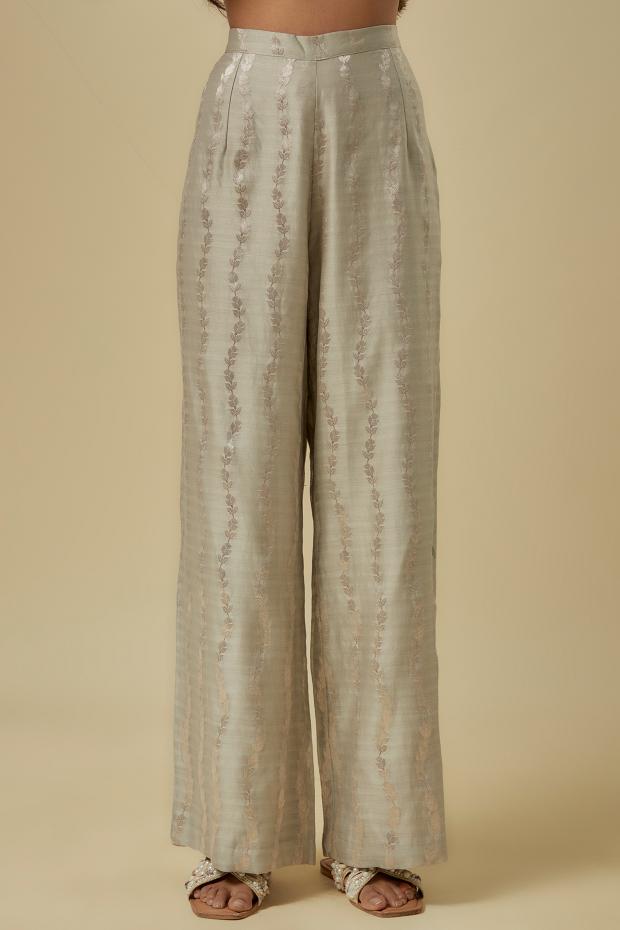 Grace meets grandeur in our Grey Leaf Brocade Silk Kurta Set. Featuring an embroidered yoke, the brocade silk kurta is paired with matching palazzos for a regal yet relaxed silhouette. The look is completed with a delicate mukaish net dupatta that adds shimmer and sophistication. Perfect for festive occasions, family celebrations, or wedding functions, this ensemble offers timeless elegance with a modern edge.