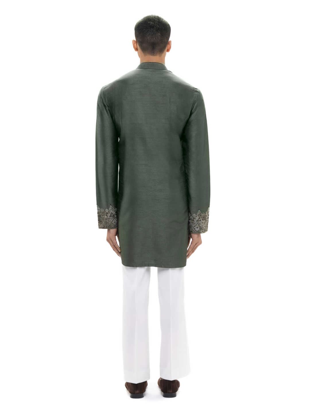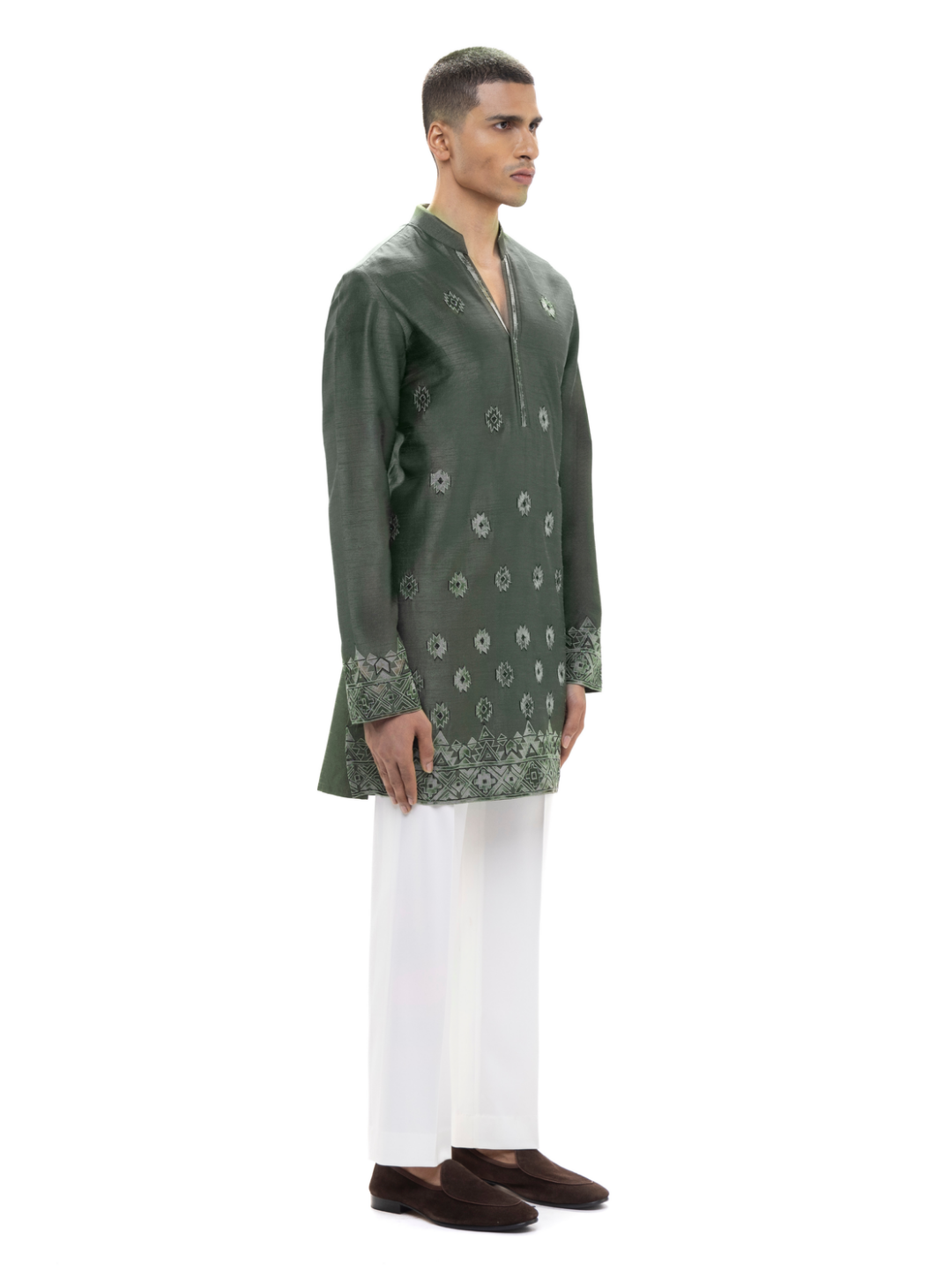 Vibrant and artistic, this Green Applique Embroidered Kurta Set brings a fresh take to traditional dressing. Crafted from lustrous silk, it features detailed applique embroidery that adds texture and visual depth. The stand collar, concealed placket, and Mother of Pearl buttons enhance its polished look. With a straight hem and regular fit, this ensemble is perfect for festive gatherings, cultural events, or daytime celebrations with a stylish twist.