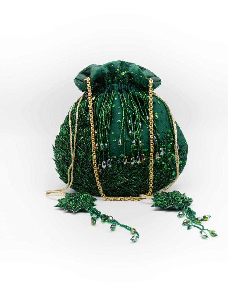 This enchanting green potli features intricate applique leaf work at the corners, adding a touch of elegance. Embellished with shimmering sequins and kathdana bead embroidery, it exudes festive charm. The delicate tassels, adorned with beads and crystals, create a mesmerizing shimmer as you walk or dance. A perfect statement accessory for weddings, celebrations, and festive occasions!