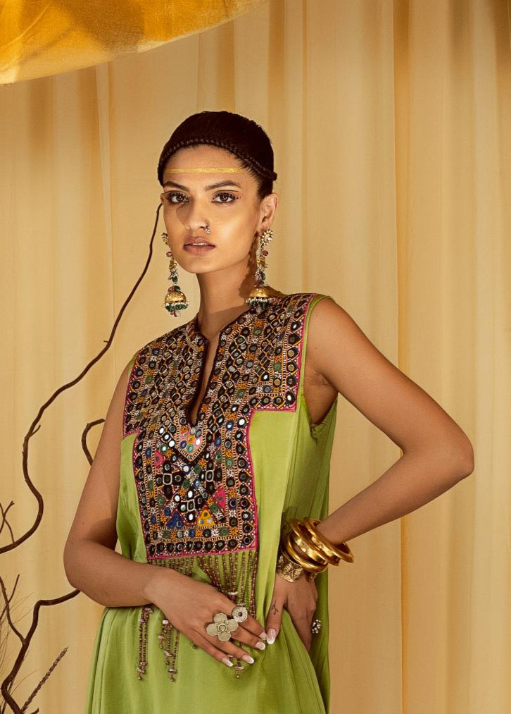 This elegant asymmetrical green kurta showcases a hand-embroidered neckline with intricate mirror work and a distinctive tassel detail, adding a touch of charm. Paired with matching pants, this ensemble seamlessly blends traditional craftsmanship with contemporary style, making it a perfect choice for festive occasions and celebrations.