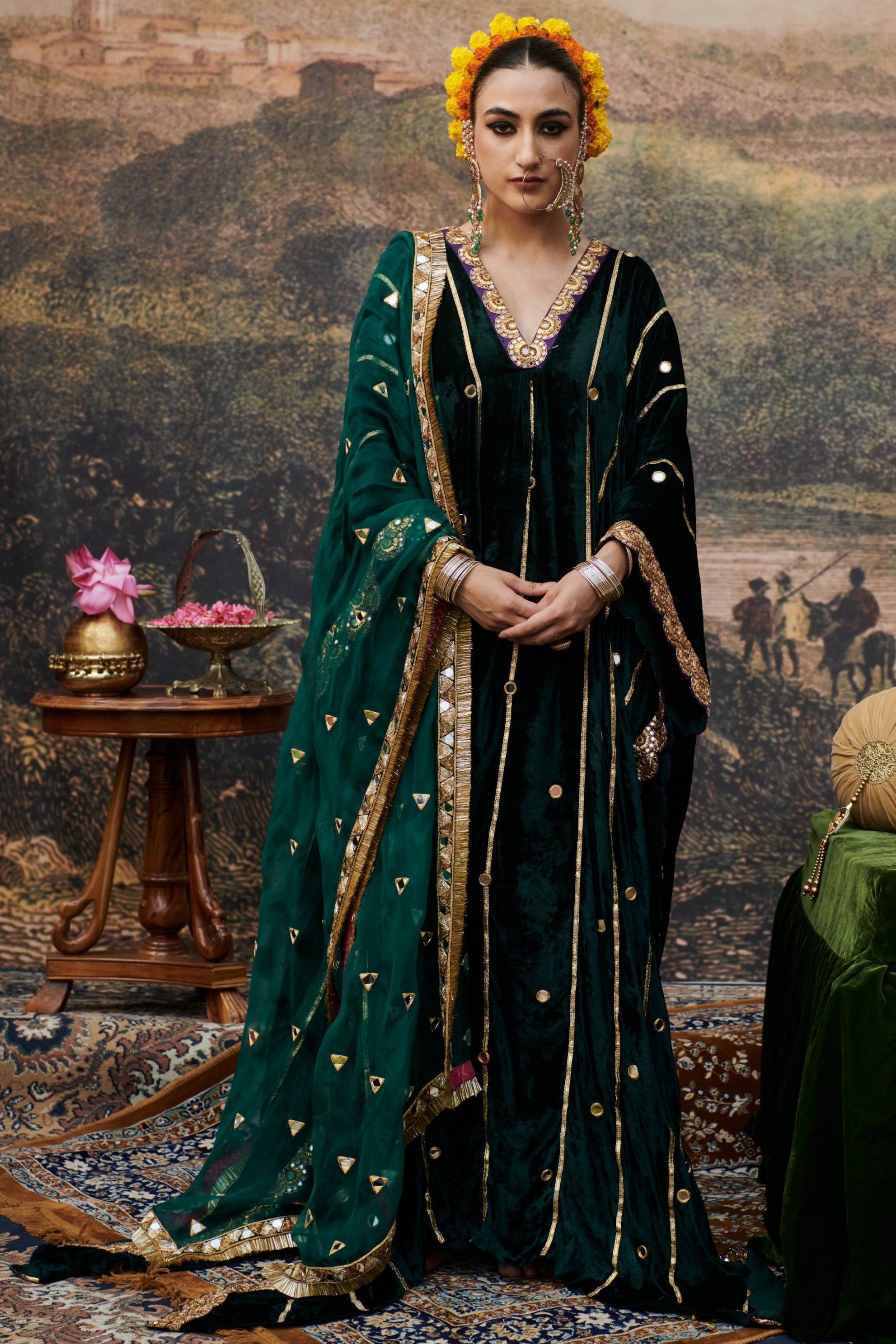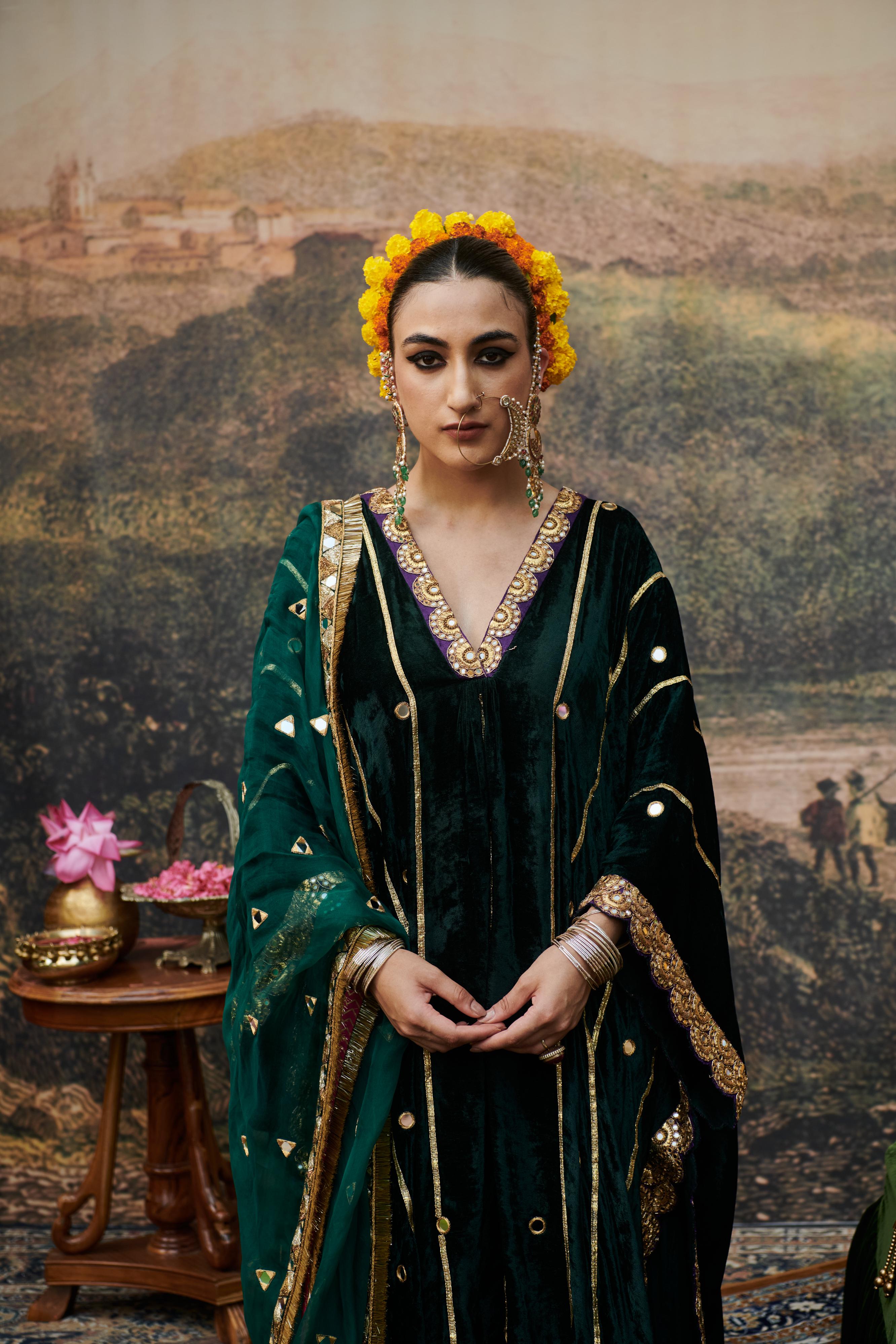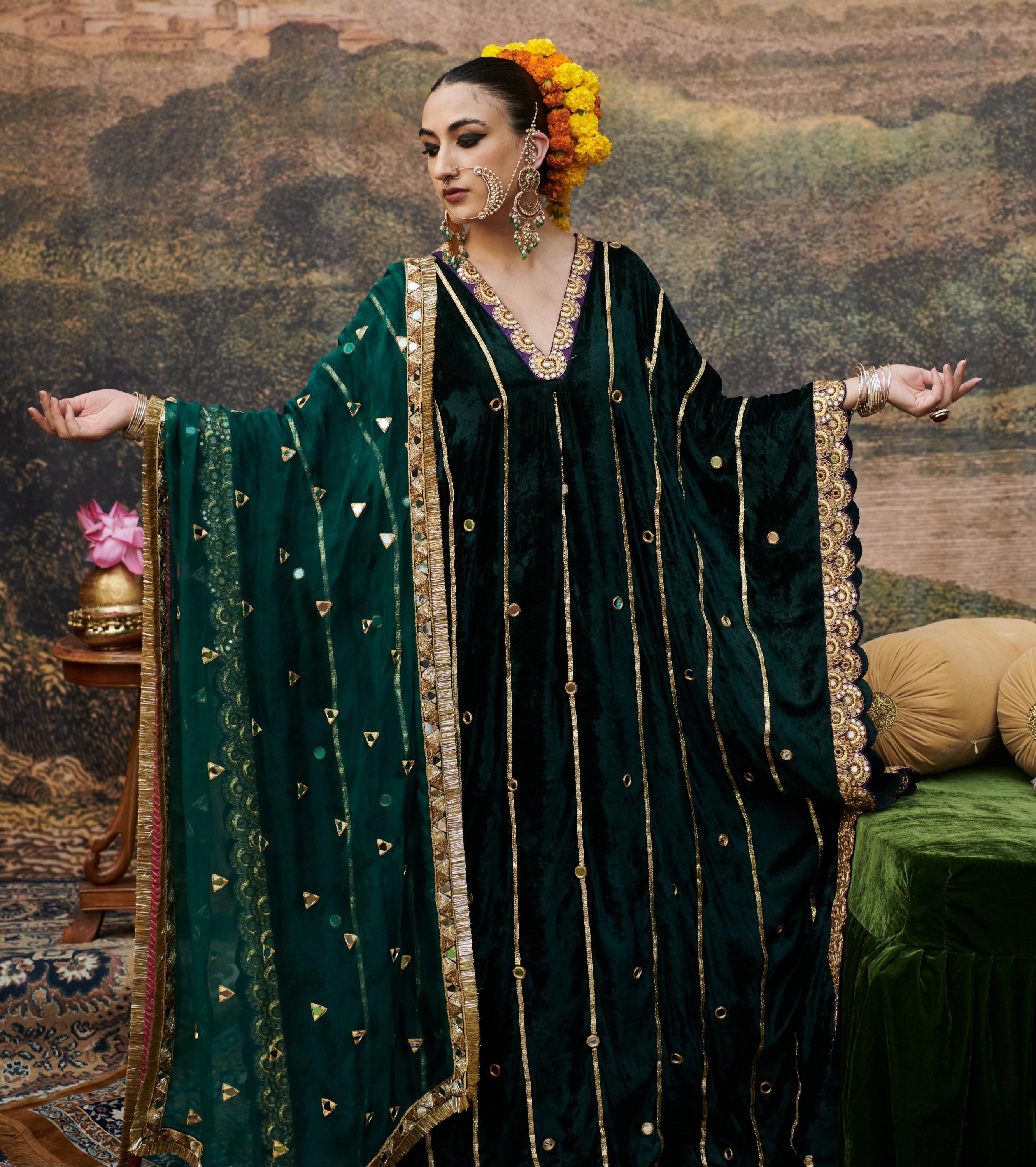 Crafted in rich green velvet, this kaftan set is adorned with intricate gota patti and antique sequins embroidery, showcasing a perfect blend of elegance and craftsmanship. The luxurious fabric and meticulous detailing make it an exquisite choice for festive occasions. Please note, the dupatta featured in the styling is not included with the set and is available as an additional purchase for those looking to complete the ensemble.