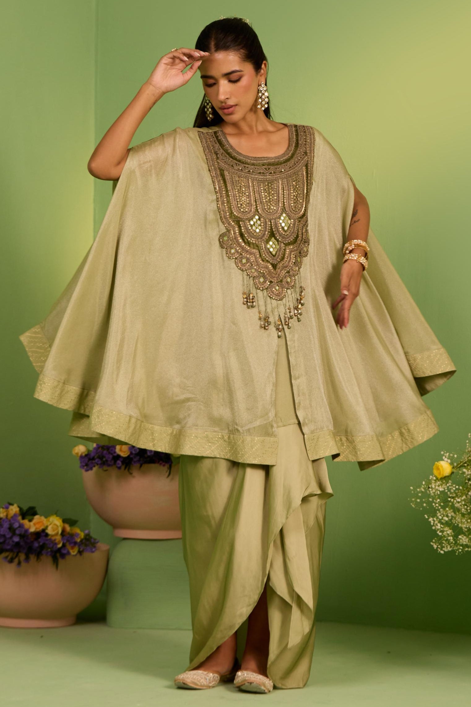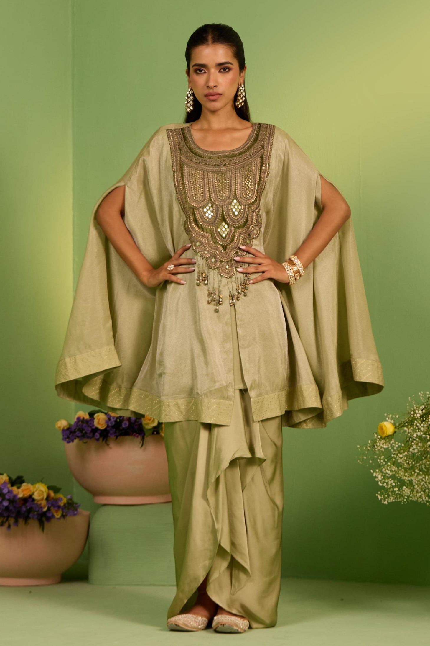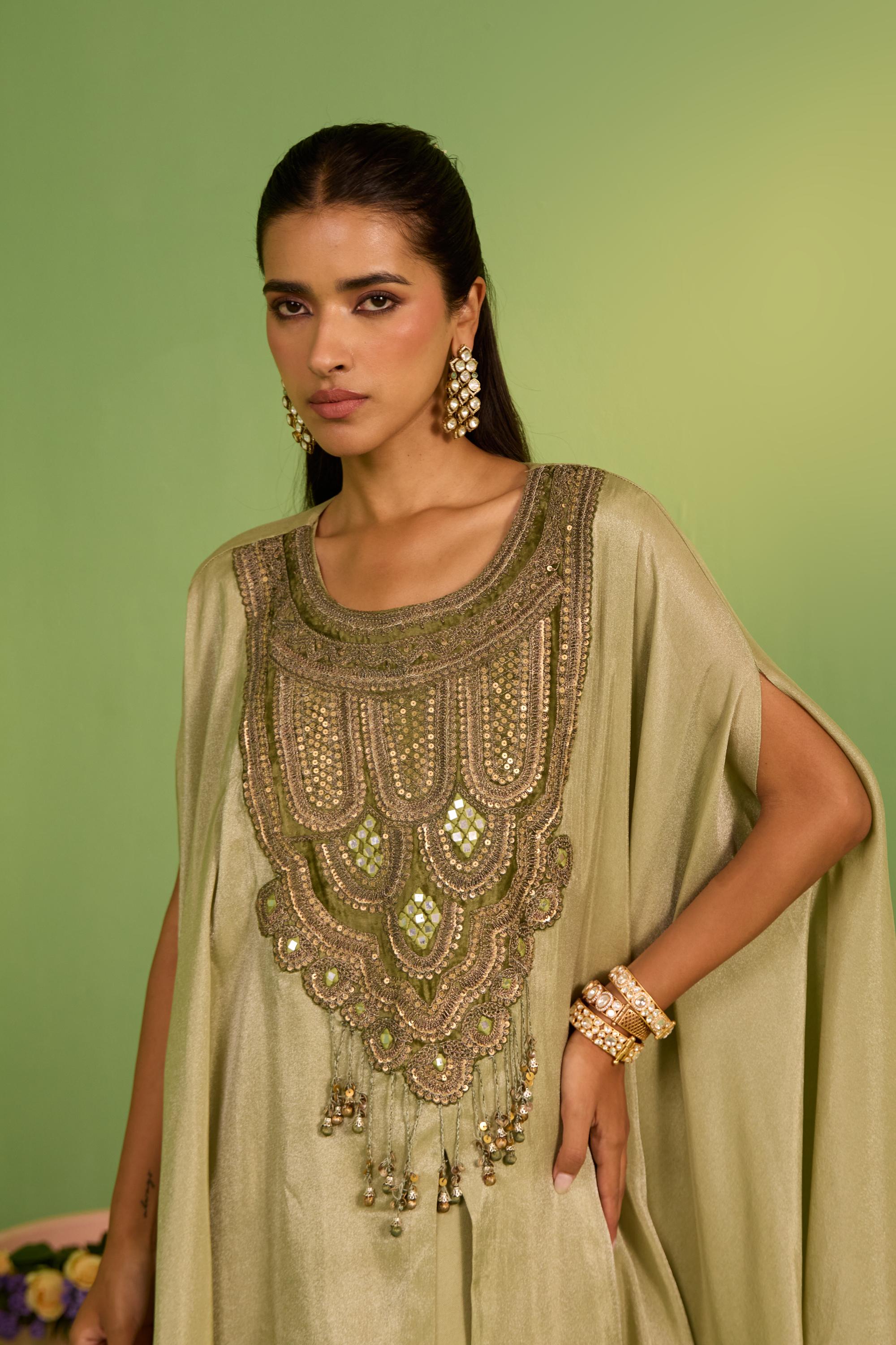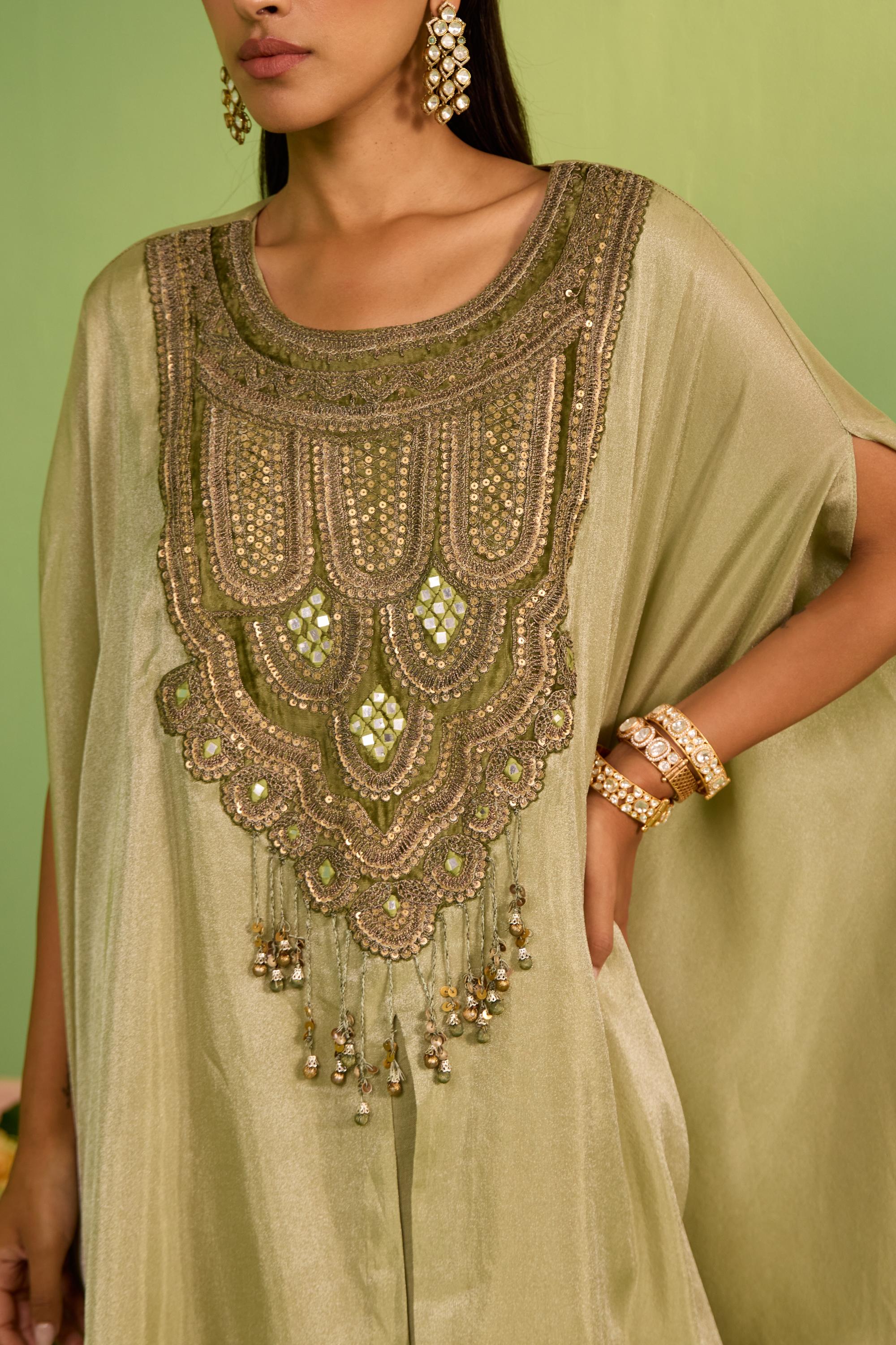 Flowy, refined, and effortlessly festive—the Green Bahaar Henha Kaftan Set brings comfort and sophistication together in perfect harmony. Crafted in a soothing green hue, this ensemble features a relaxed kaftan silhouette with delicate embroidery that adds depth and artisanal charm. Paired with coordinated bottoms, it's ideal for haldi ceremonies, festive brunches, or intimate celebrations. The Green Bahaar Henha Kaftan Set is for the woman who values ease, movement, and mindful elegance in every look.
