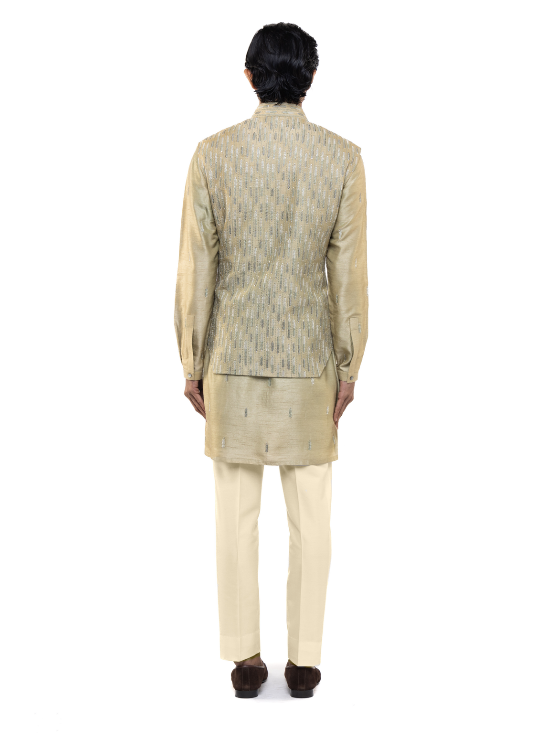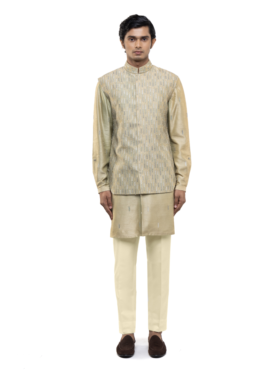 This Sage Green Beaded Embroidery Kurta Bandi Set features exquisite beadwork on rich silk fabric, adding a touch of sophistication. Designed with a stand collar, concealed placket, and Mother of Pearl buttons, it offers subtle elegance. The bucket cut hem and regular fit enhance comfort and modern style, making it perfect for festive events, weddings, or elegant gatherings.