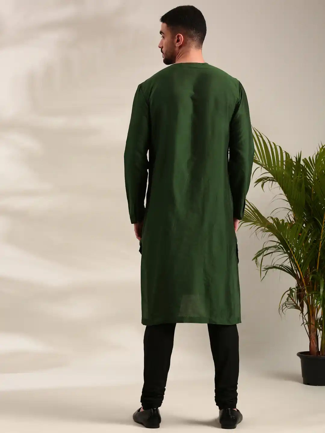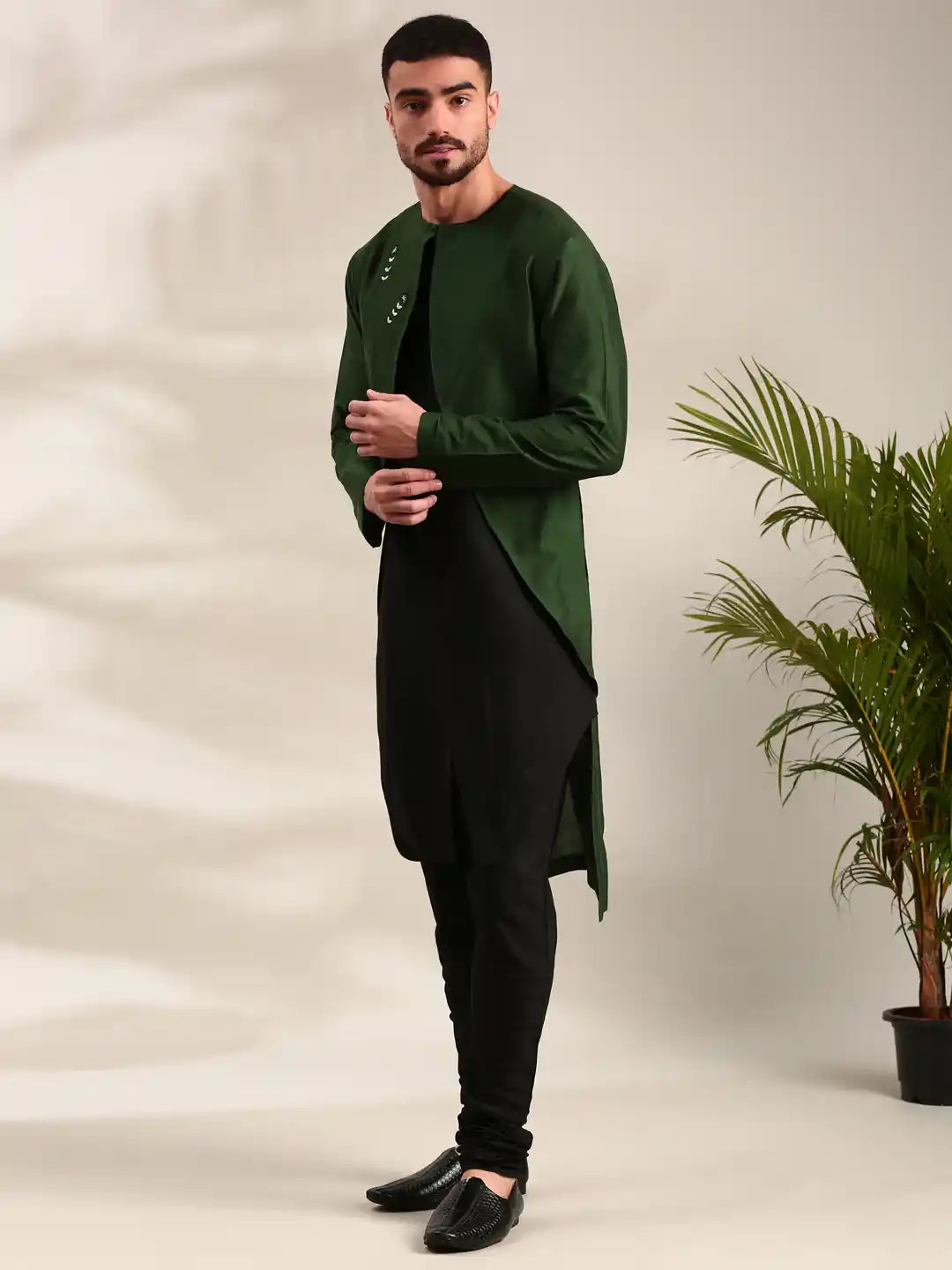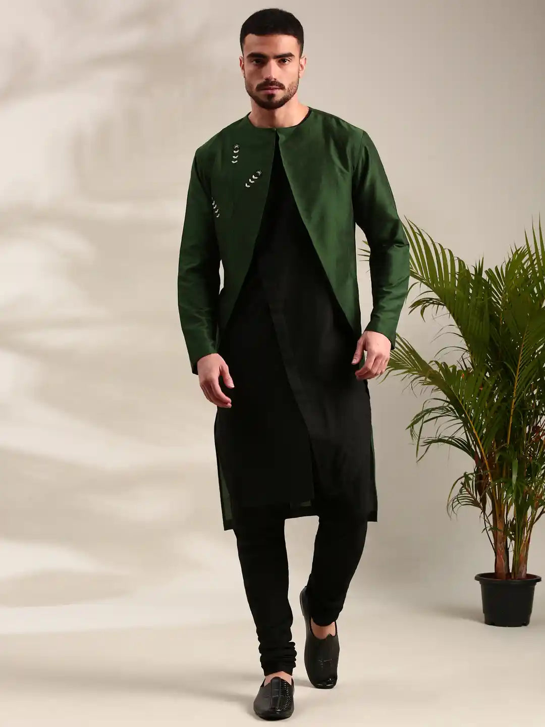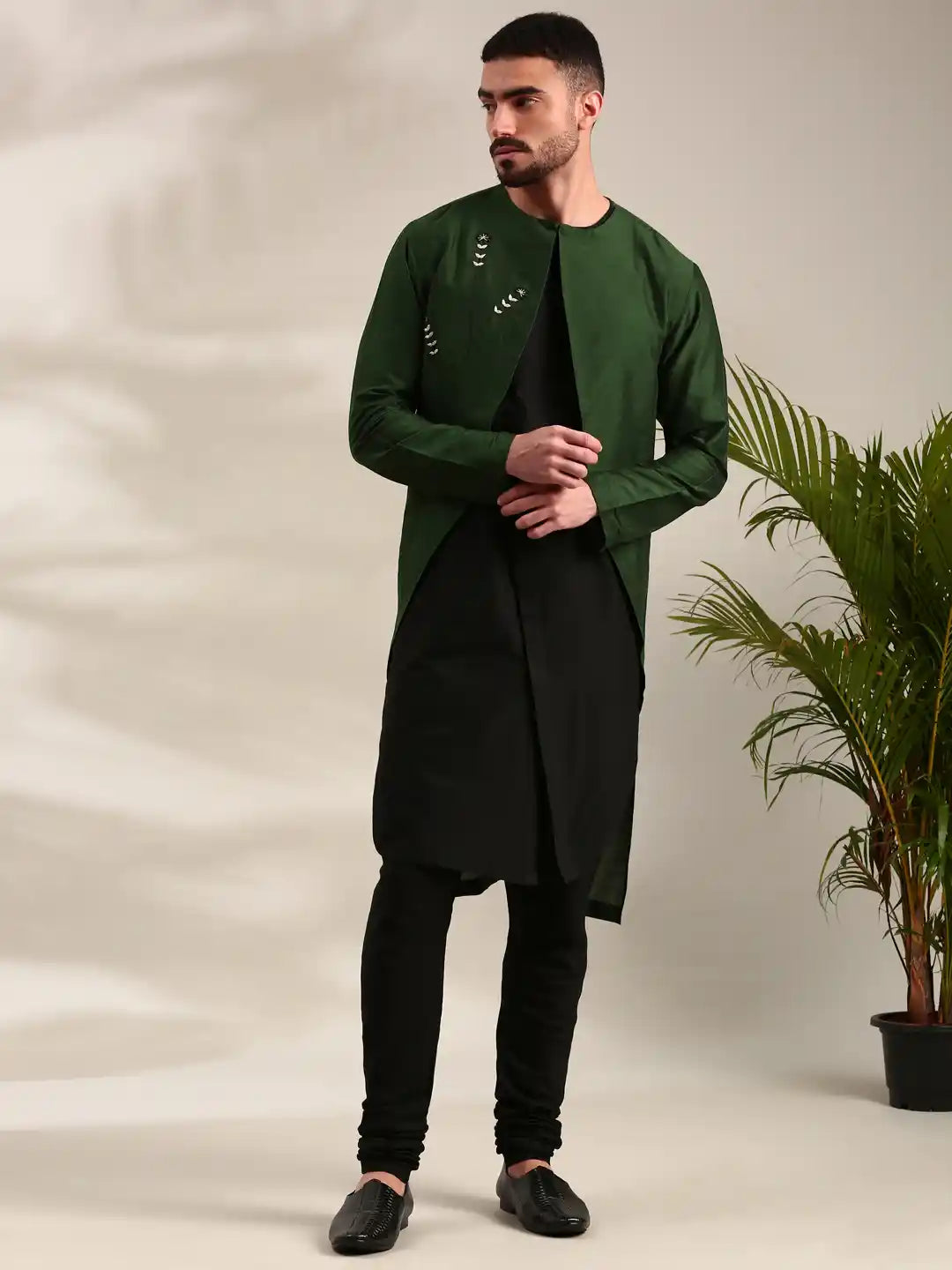 Elevate your style with our green & black cotton silk kurta set, ideal for ceremonies and receptions. Pair it with a matching stole or dupatta for a complete look that exudes sophistication and charm.