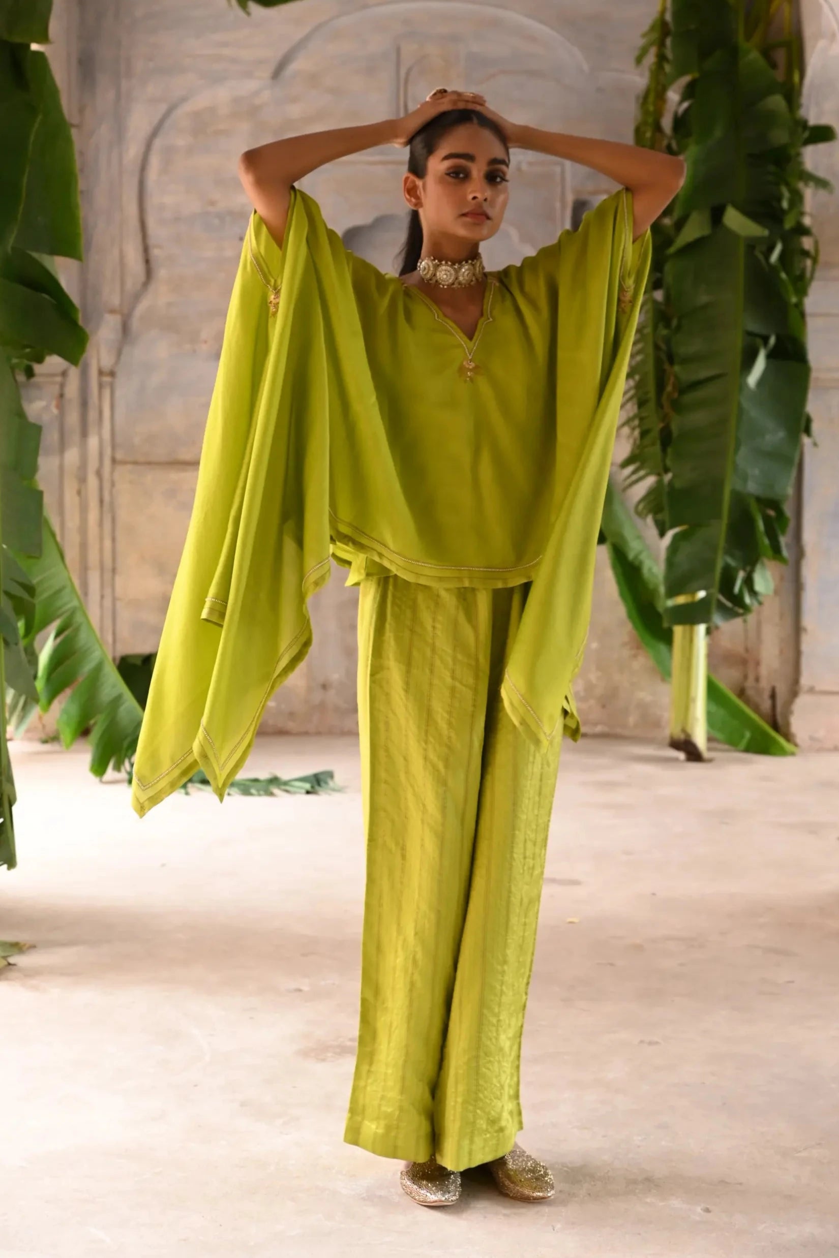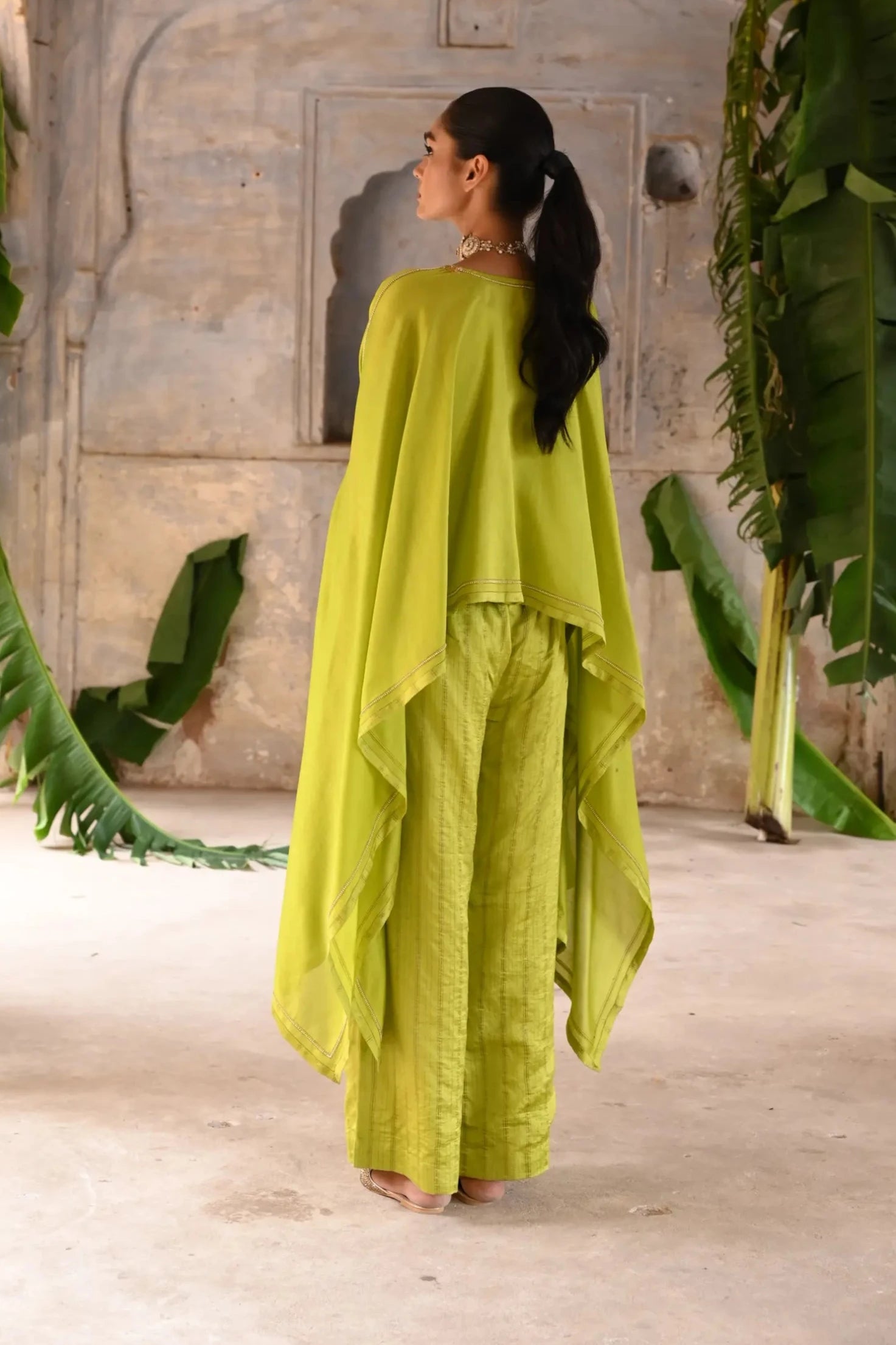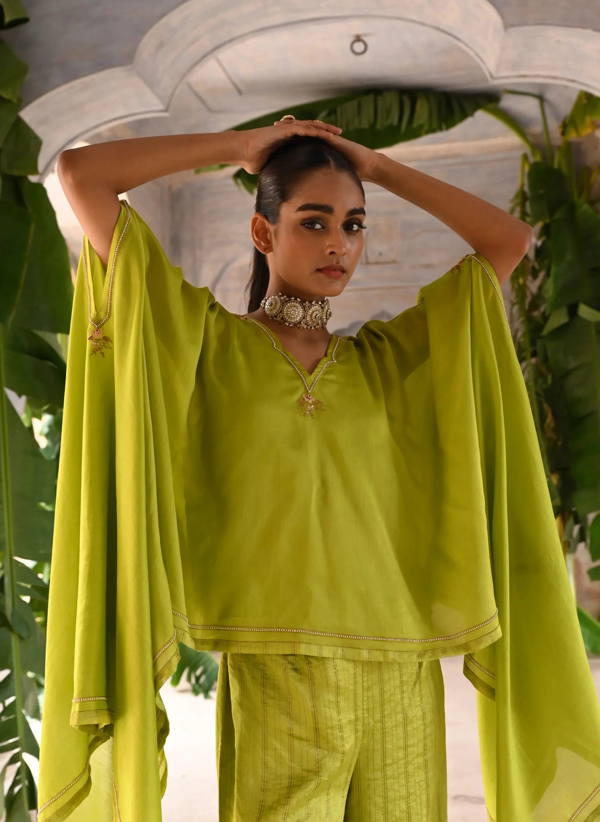 Elevate your style with our Green Cape Set. This chic ensemble features a stunning cape that adds a dramatic flair to your look, paired with a stylish inner outfit. The vibrant green hue brings freshness and elegance, making it perfect for parties, festive occasions, or stylish outings.