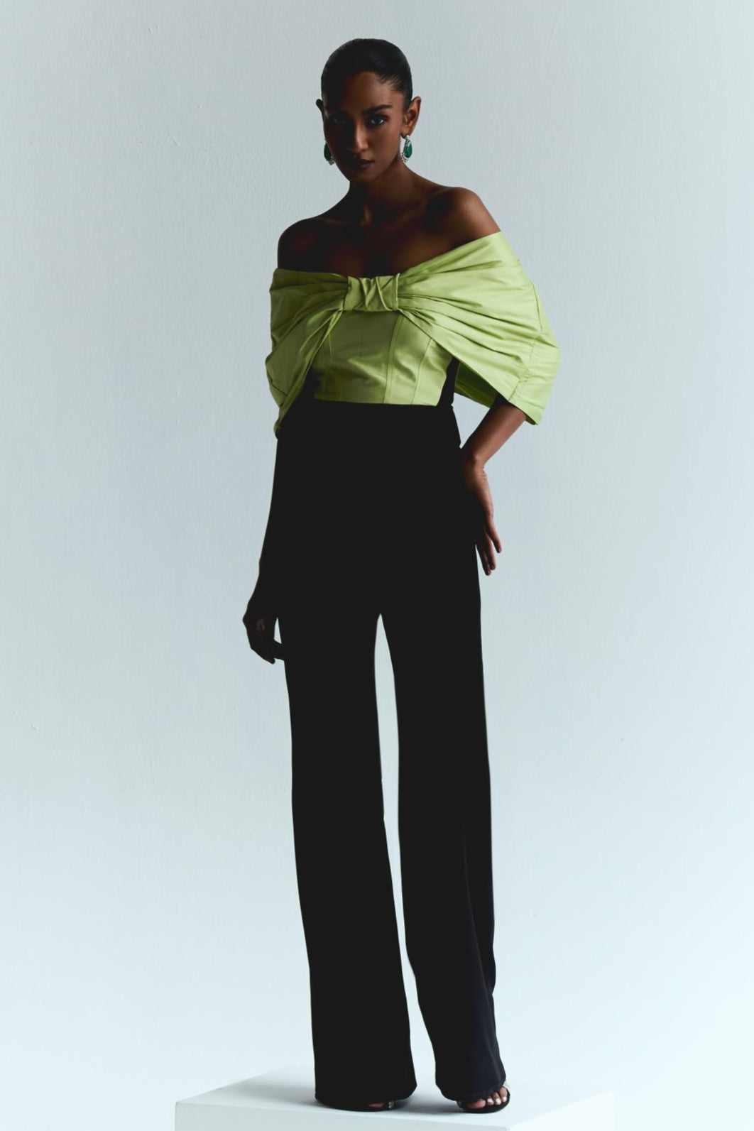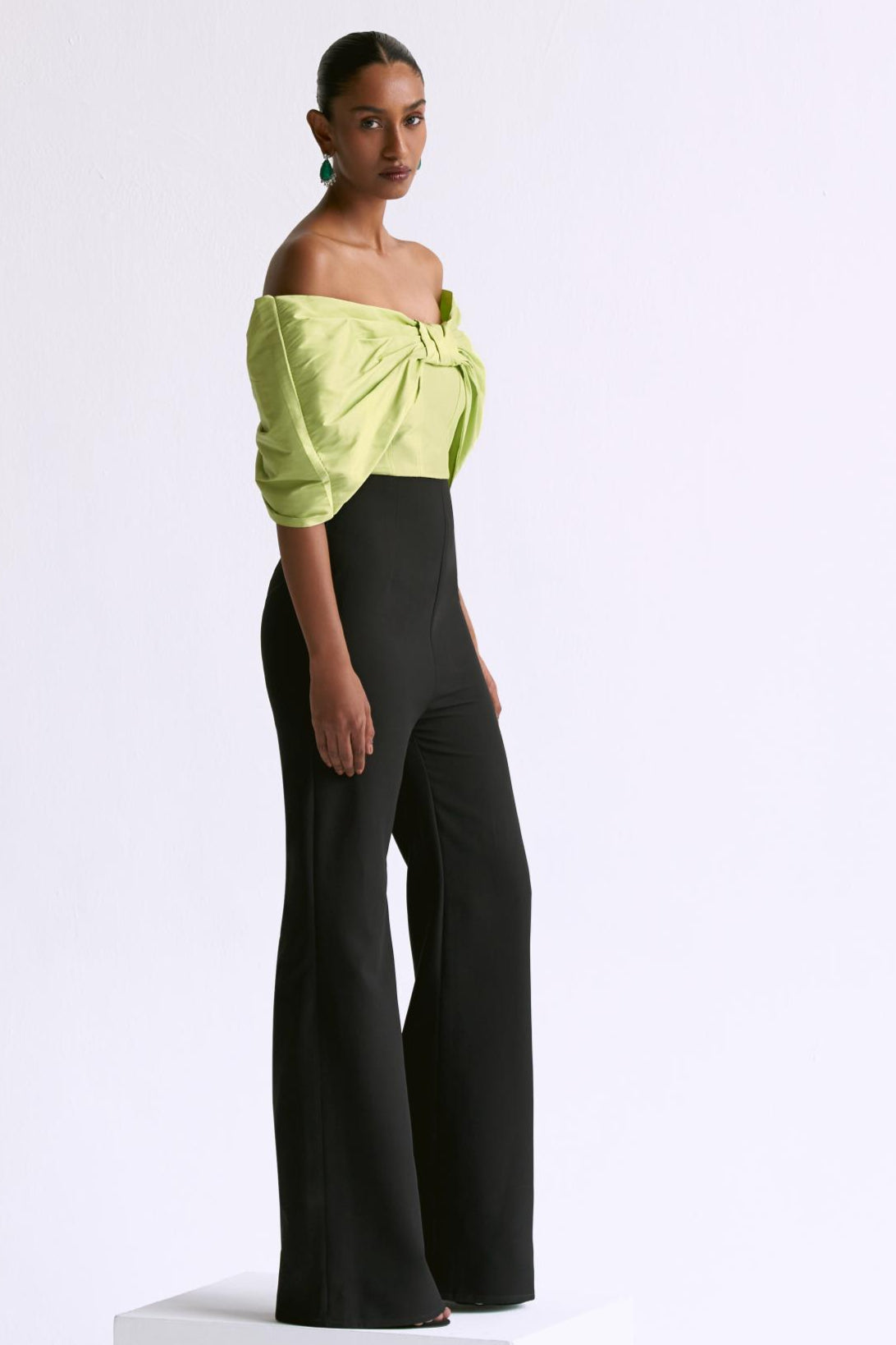 The Green Contrast Bow Detailed Reim Jumpsuit is a perfect blend of sophistication and playful charm. Featuring an eye-catching contrast bow detail, this jumpsuit redefines modern elegance with a fresh twist. The vibrant green hue complements the sleek, tailored design, while the bold bow adds a touch of whimsy and individuality.