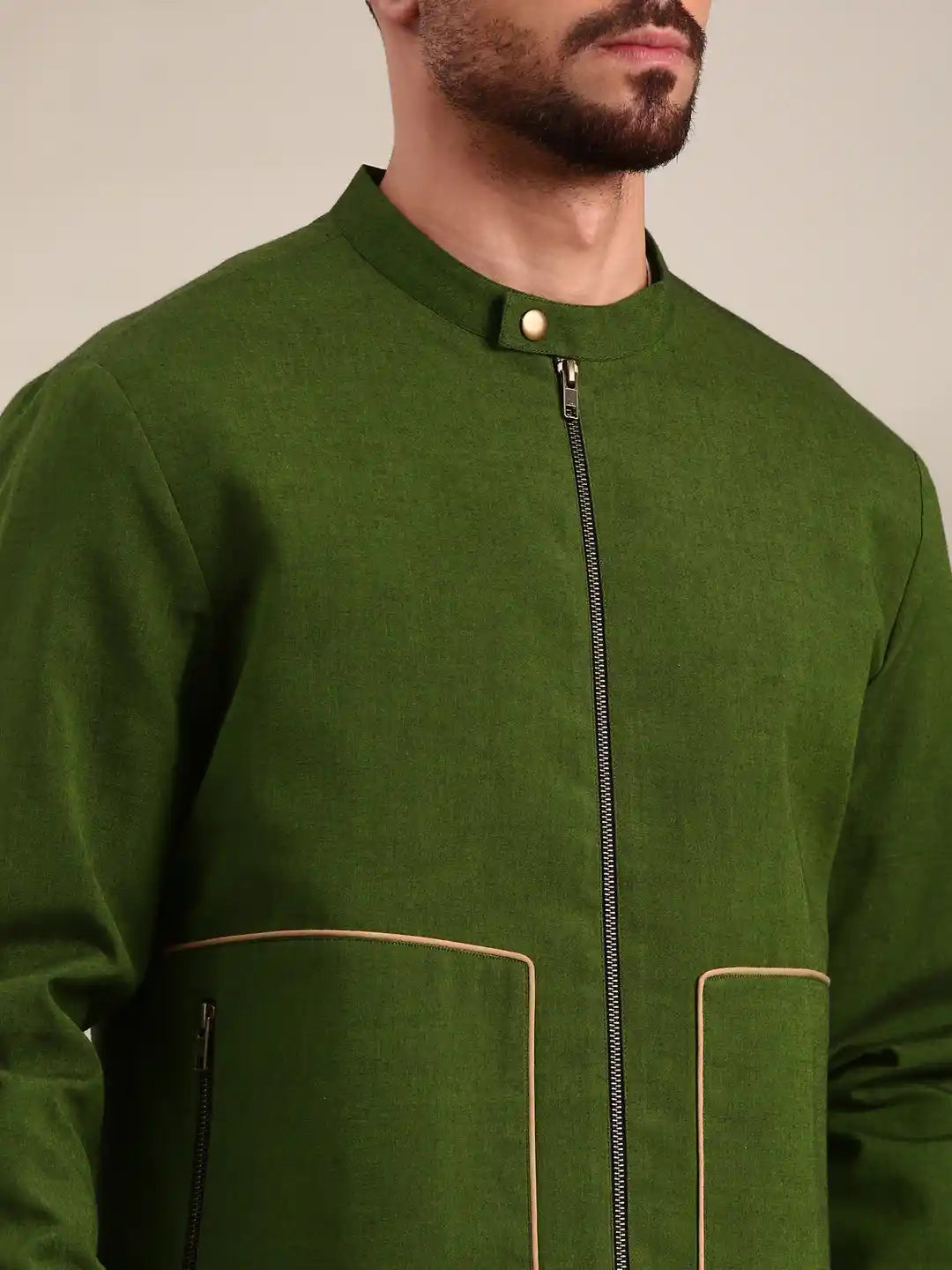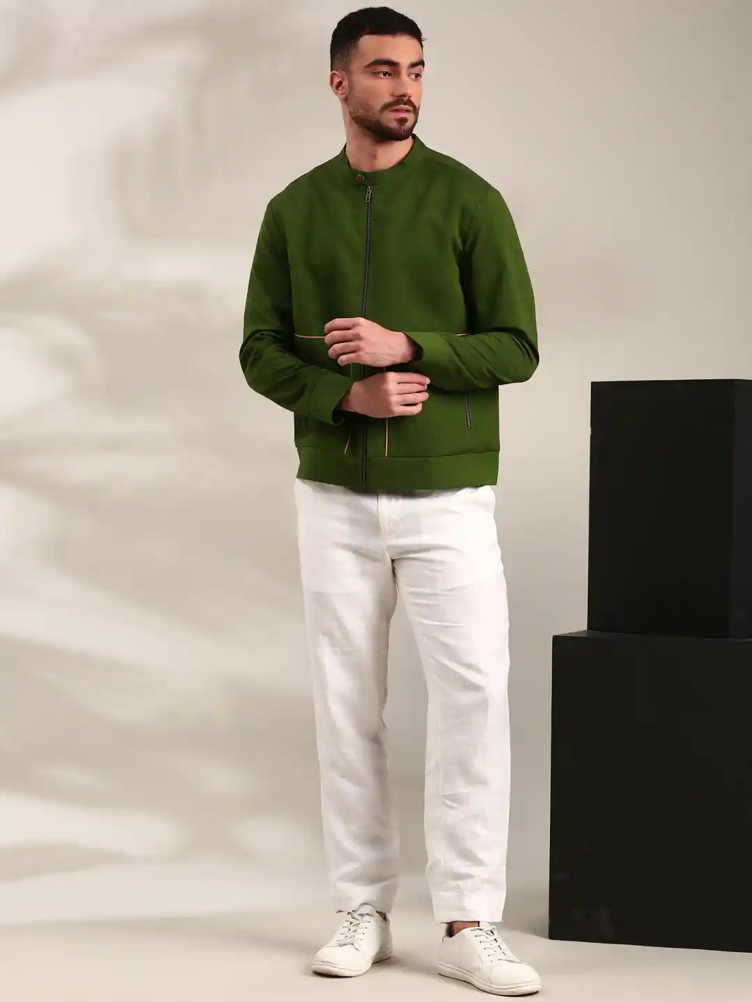 Stay stylish and comfortable in our green cotton bomber jacket. Pair it with a white t-shirt, skinny jeans, and sneakers for a laid-back look that's perfect for brunch or coffee with friends. This ensemble combines casual flair with effortless cool.