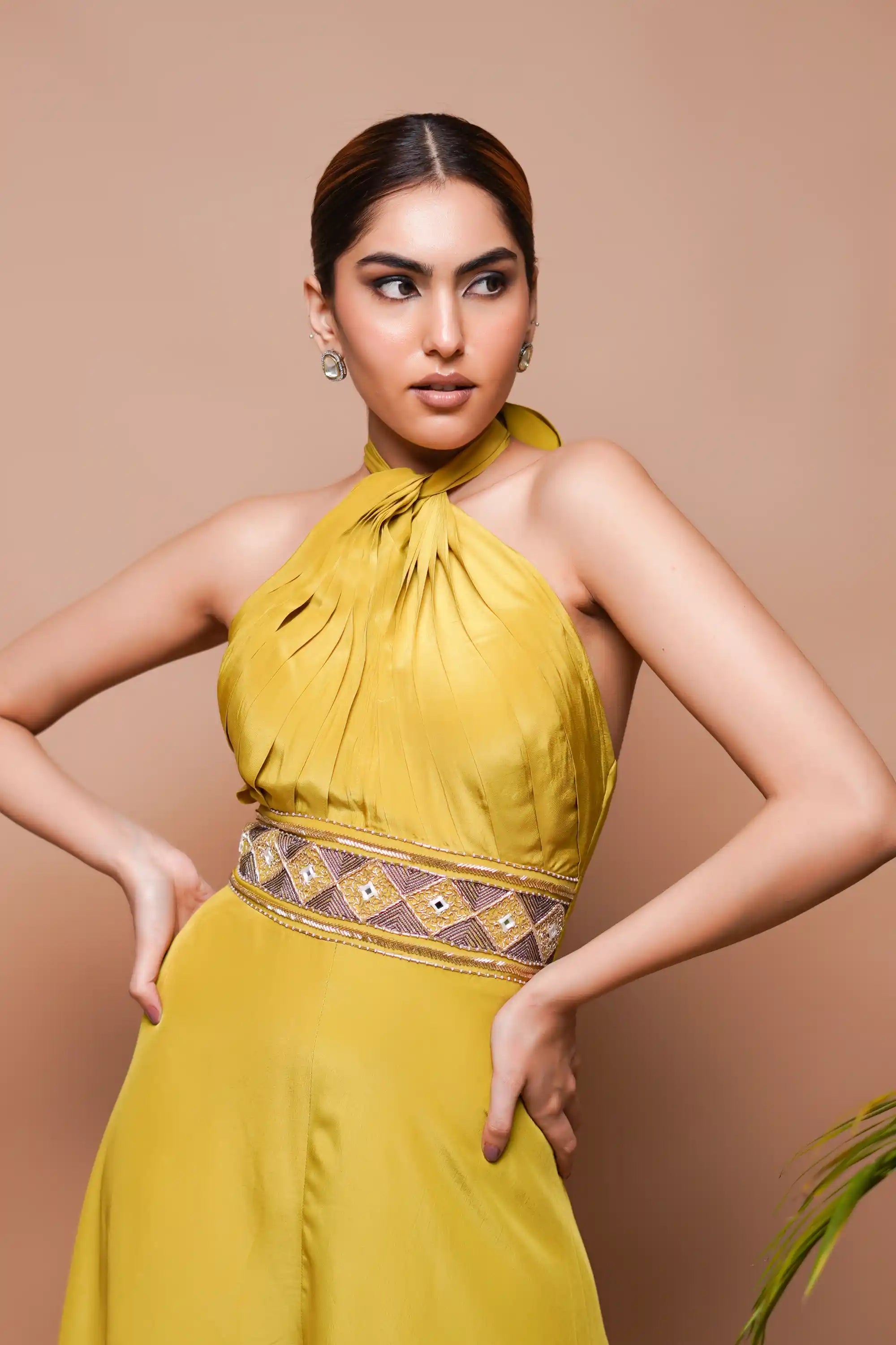 Structured pleated drape halter neck bodice with a heavy embroidered belt offers an elegant look. The jumpsuit features a flared bottom with a back zip and a tie-up neck, blending sophistication with comfort for any occasion.