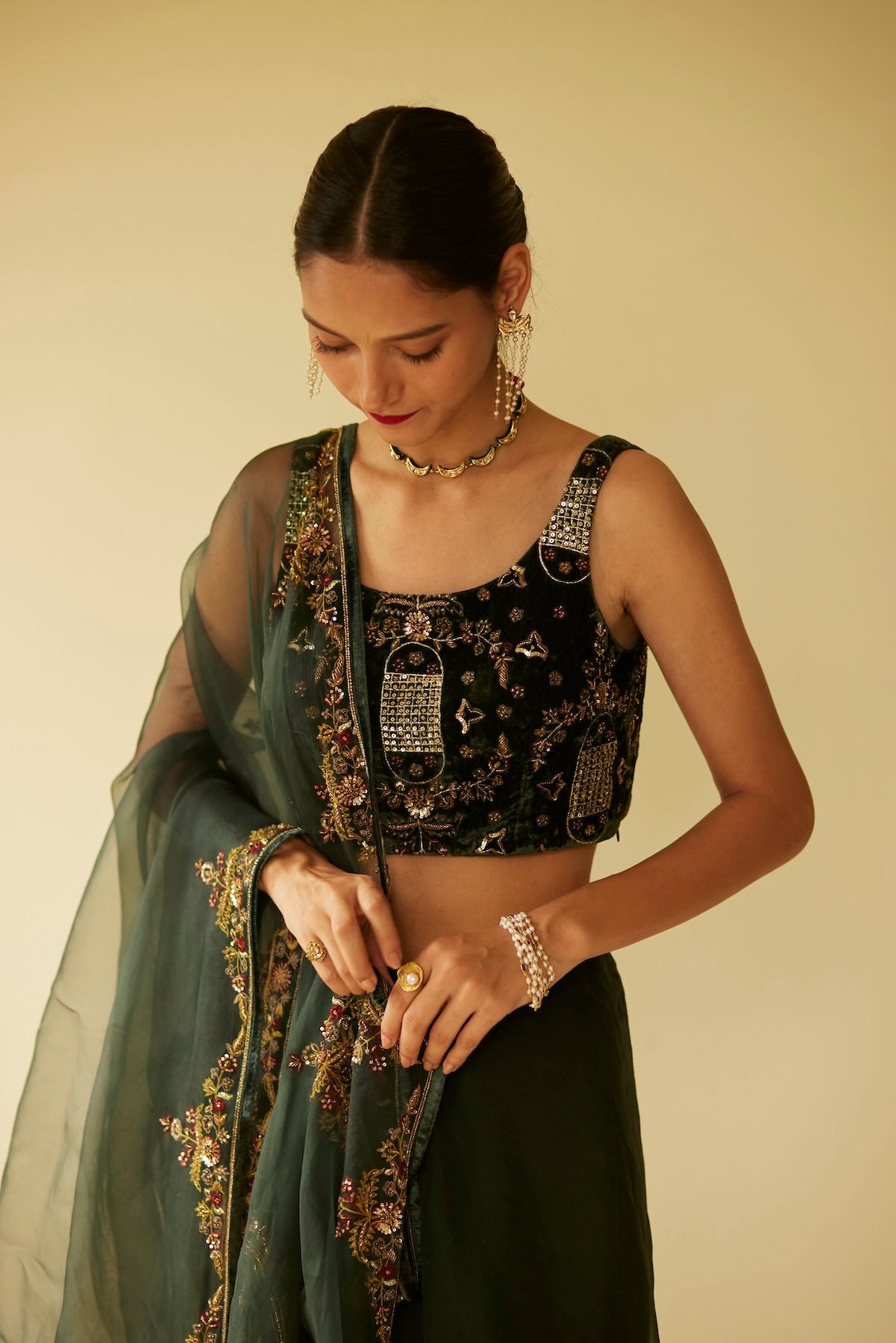 The green dareecha saree exudes elegance with its vibrant green organza silk fabric. The saree's delicate, airy texture drapes beautifully, creating a graceful and refined look. Complementing this is the blouse piece crafted from rich velvet silk, adding a luxurious and opulent touch. Ideal for formal events and special occasions, this ensemble combines the light, ethereal quality of organza with the sumptuous depth of velvet, resulting in a sophisticated and striking appearance.