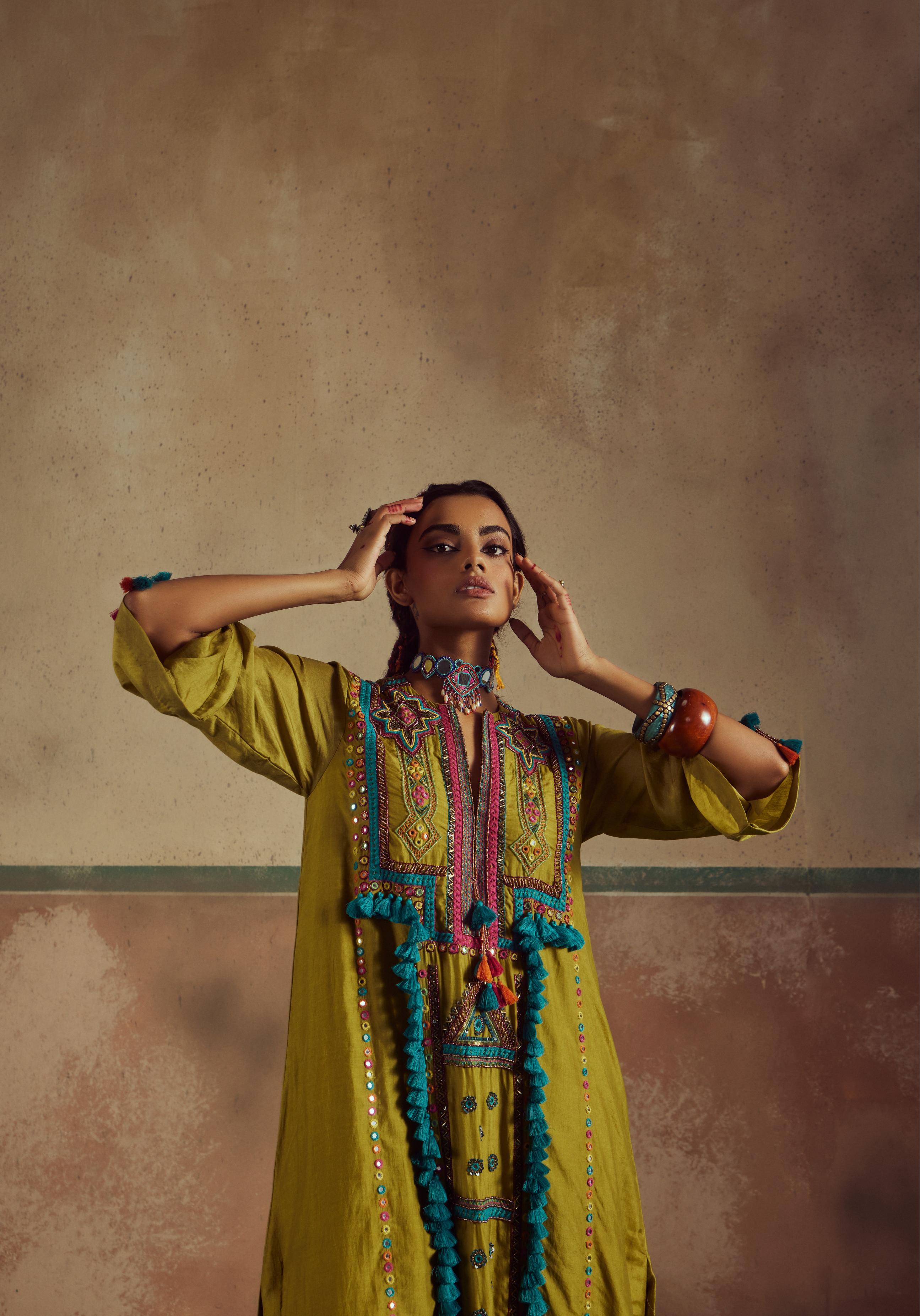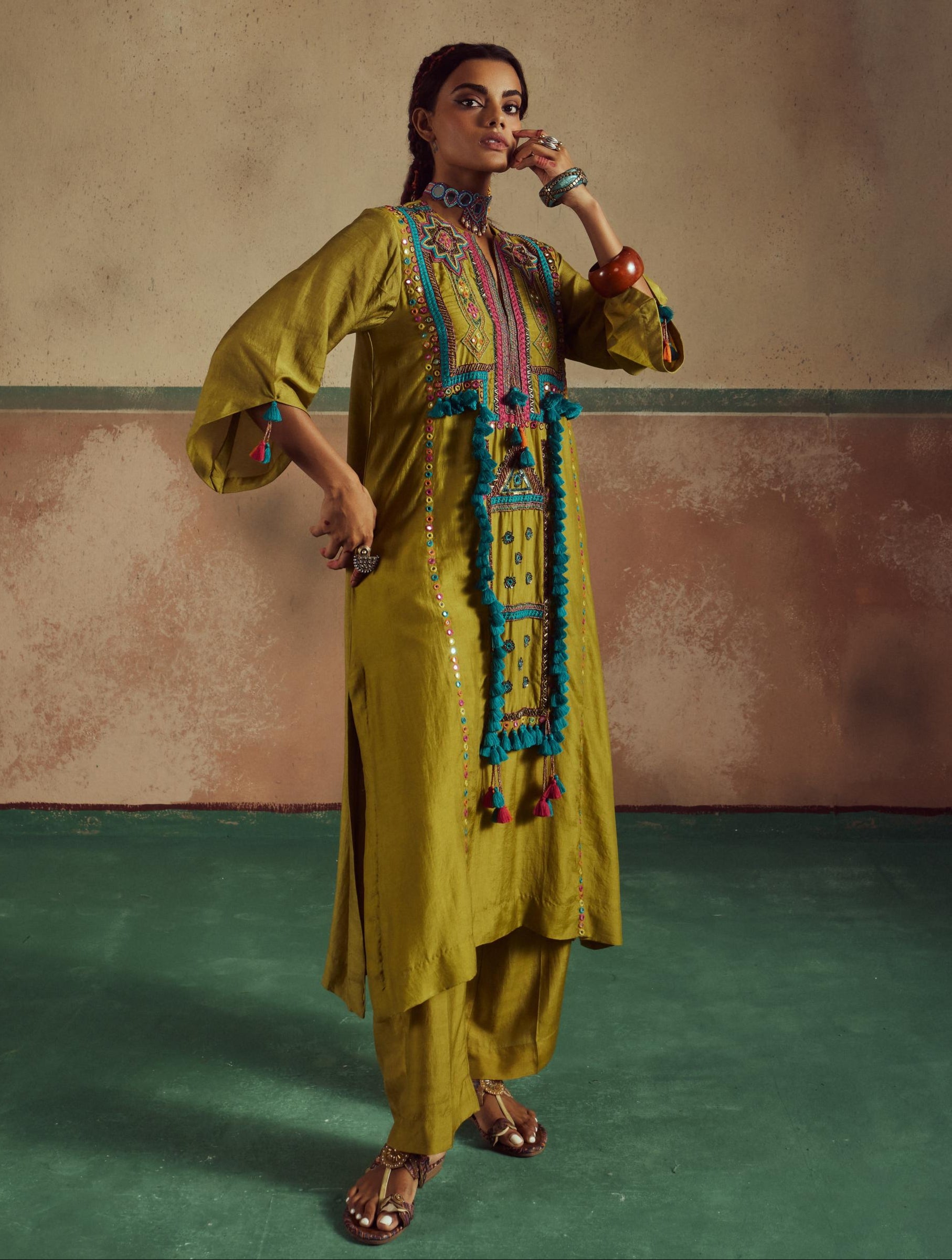This vibrant acid green jhola kurta is beautifully adorned with intricate "feels like patch" threads, beads, and sequin embroidery, creating a rich, textured design. The kurta is further enhanced with an abundance of playful tassels, adding movement and charm. Paired with matching pants, this bold ensemble offers a perfect blend of artistry and modern style.